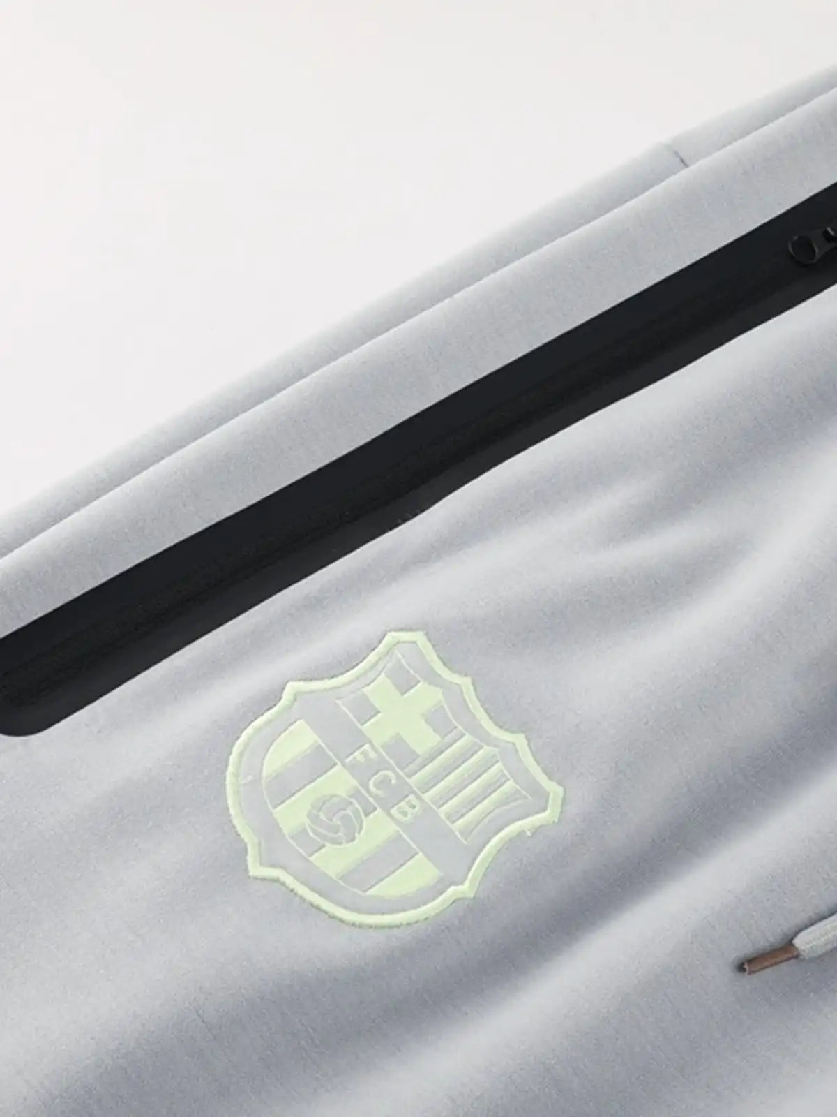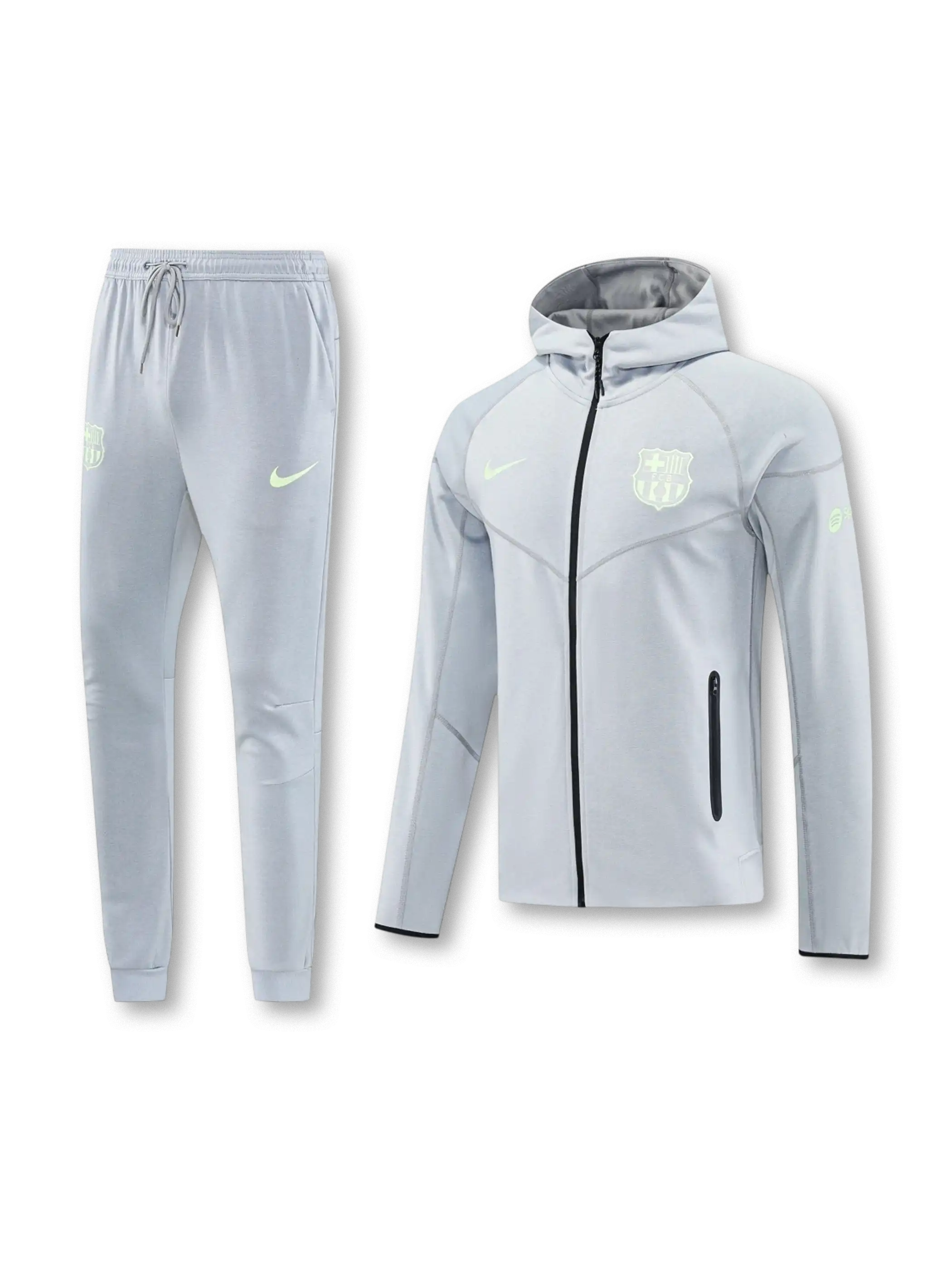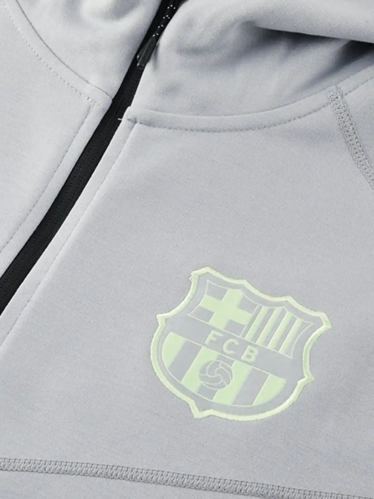 ライトグレーを基調に、クラブエンブレムを控えめに配したバルセロナのフーデッドトレーニングセット。