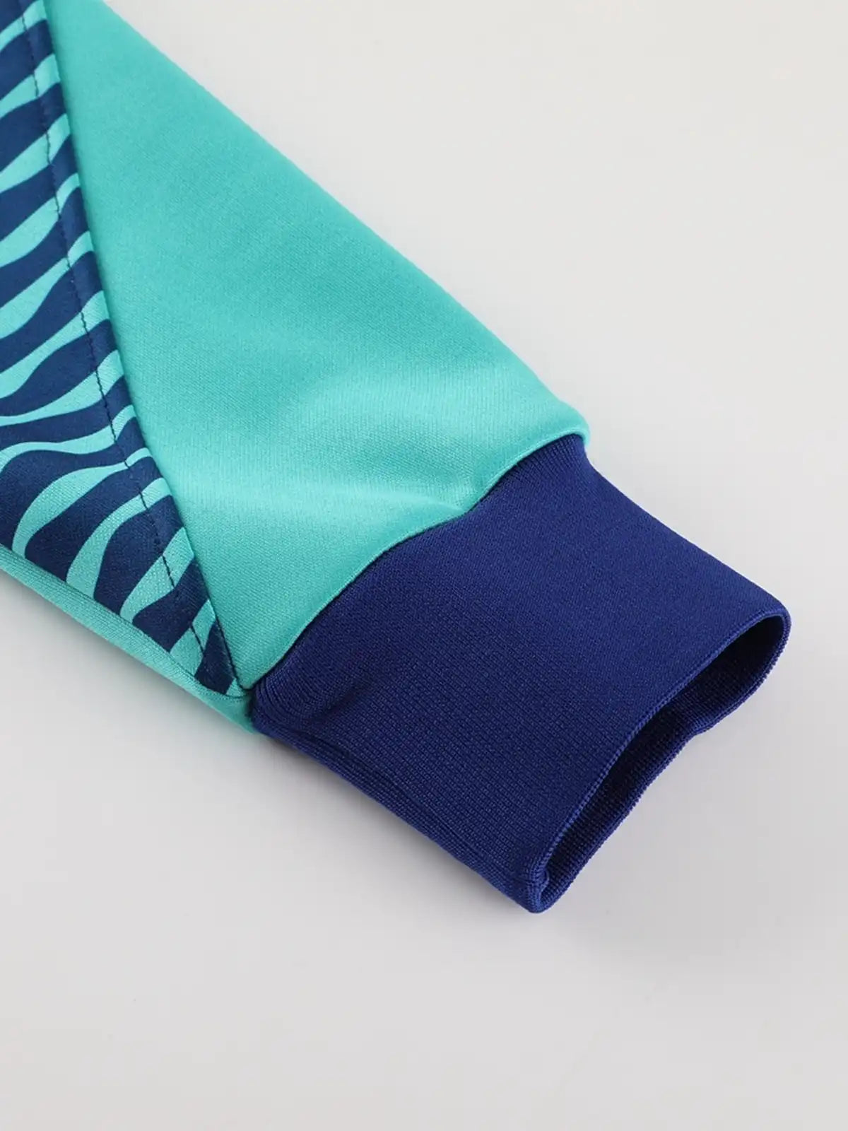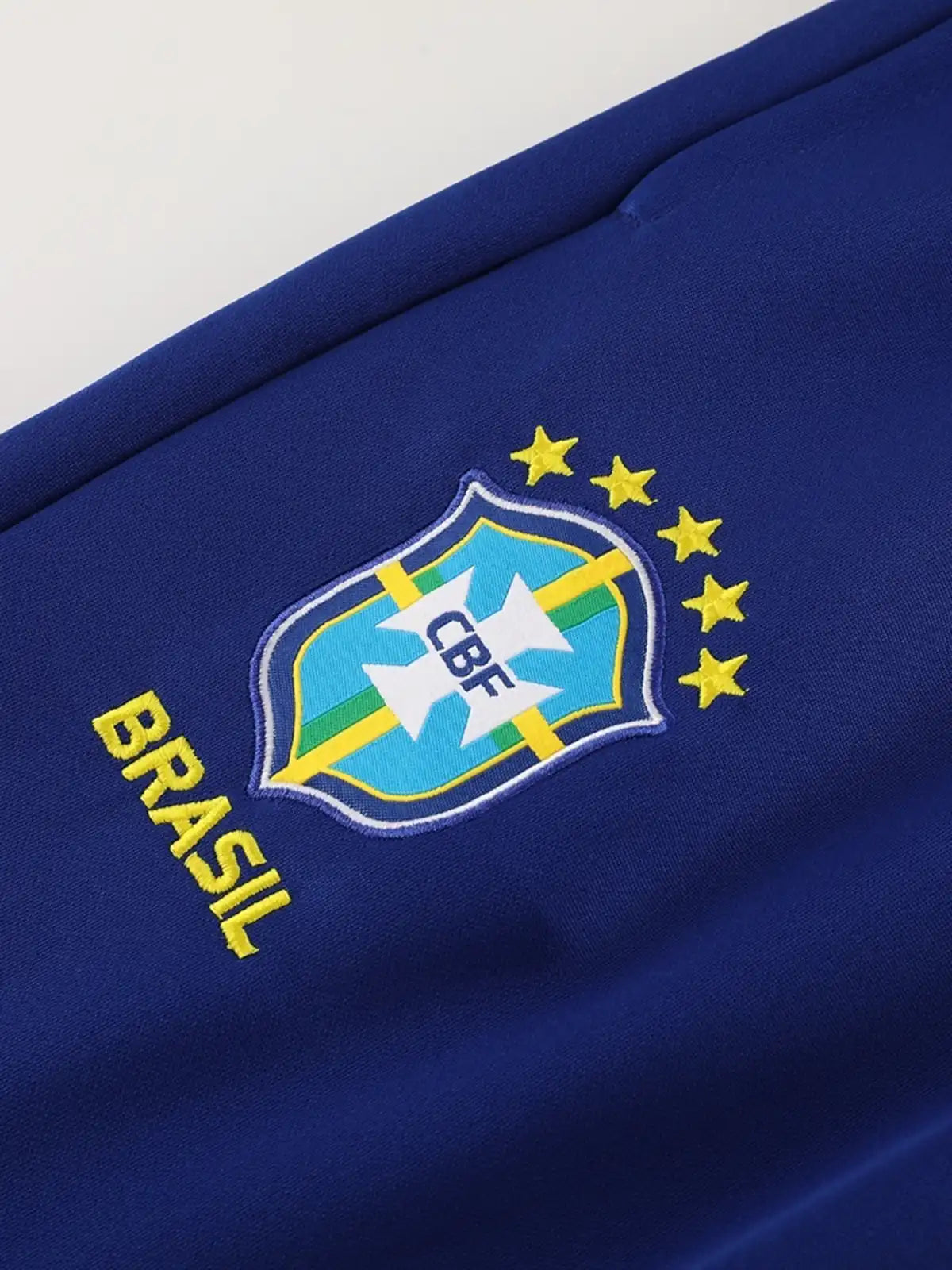 ネイビー基調にターコイズの袖切替を合わせ、肩まわりにジオメトリック(ゼブラ調)パターンを入れたブラジル代表トレーニングセットアップ。ジャケット胸とパンツにブラジル代表エンブレム、胸にNikeスウッシュを配置し、フルジップ+スタンドカラーで移動着にも対応します。素材はスポーツ用途で一般的なポリエステル系として扱いやすく、軽量で動きやすい着用感を想定した設計です。