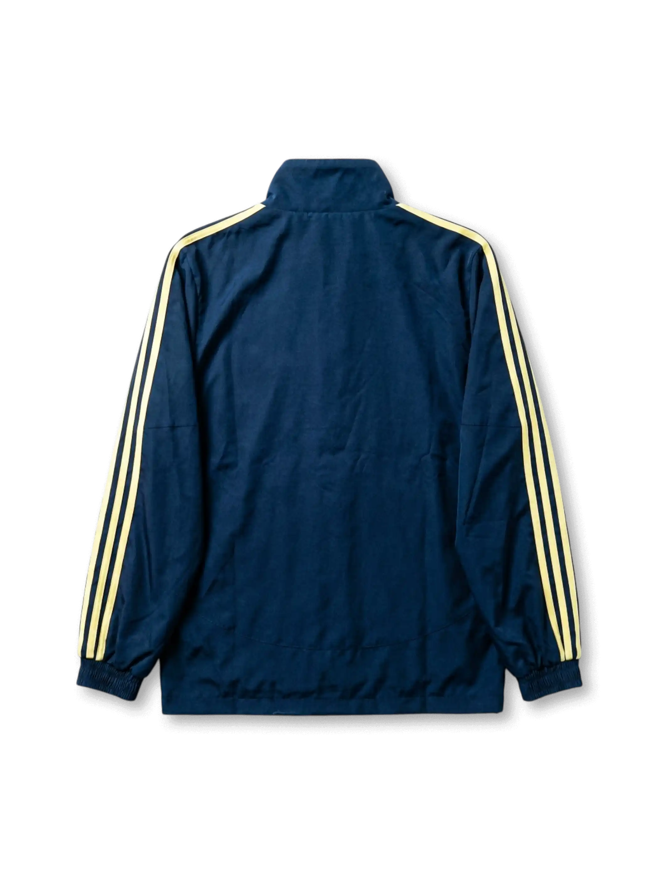 深みのあるネイビーボディをベースに、肩から前身頃へ流れるホワイトの曲線ラインを組み合わせたトレーニングジャケット。胸元にはクラブエンブレム、ロゴ、スポンサーマークを整理して配置し、非試合用・公式トレーニングラインらしい実用性と識別性を両立している。スタンドカラーとフロントジップを備えた軽量構造で、ウォームアップや移動時を想起させるスポーツウェアらしさを持ちながら、日常着としても取り入れやすい落ち着いたデザインにまとめられている。
