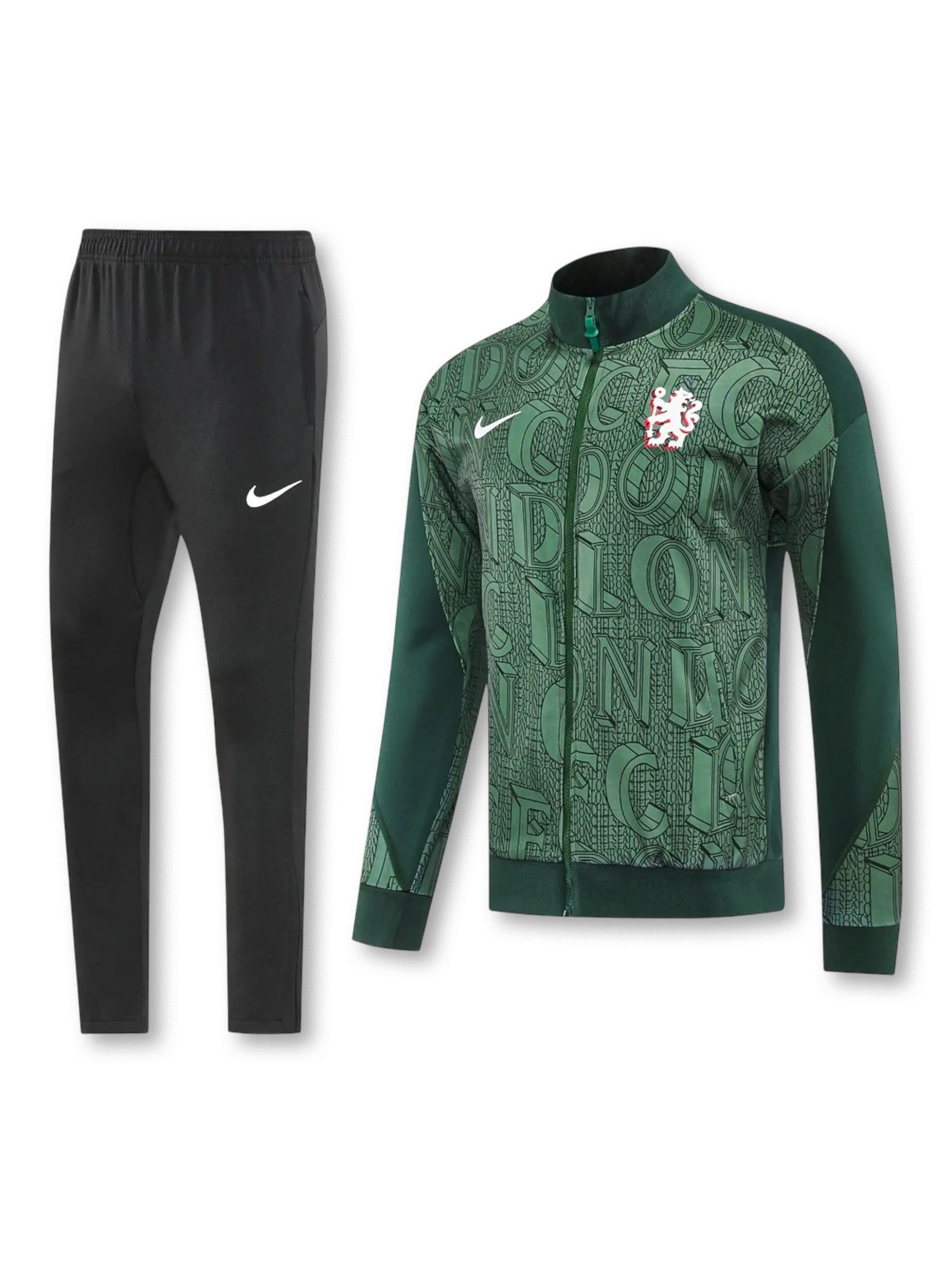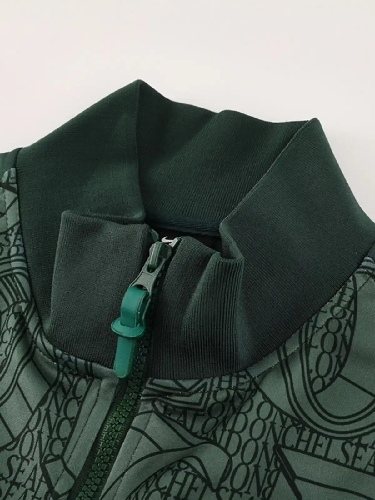 深みのあるグリーンを基調に、クラブ名由来のレタリングモチーフを総柄で表現したトレーニングトラックスーツ。