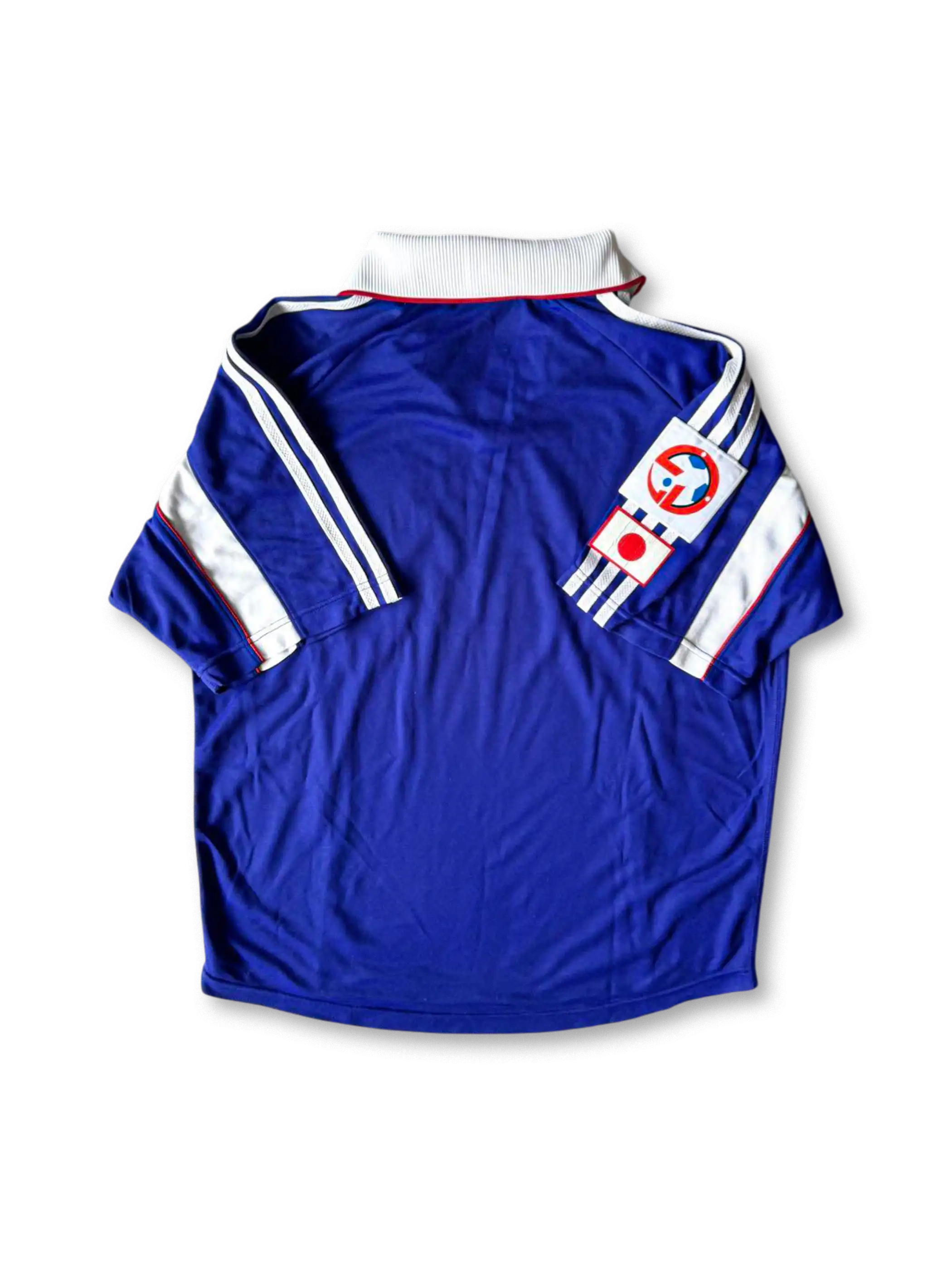 1999年日本代表ホームユニフォームは、鮮やかなブルーを基調とし、襟と袖口に赤のアクセントを加えたデザイン。高密度刺繍のJFAエンブレムとadidasロゴが品格を演出し、通気性と軽量性に優れた素材を使用。レトロな90年代スタイルと現代の機能性を融合させた一着。