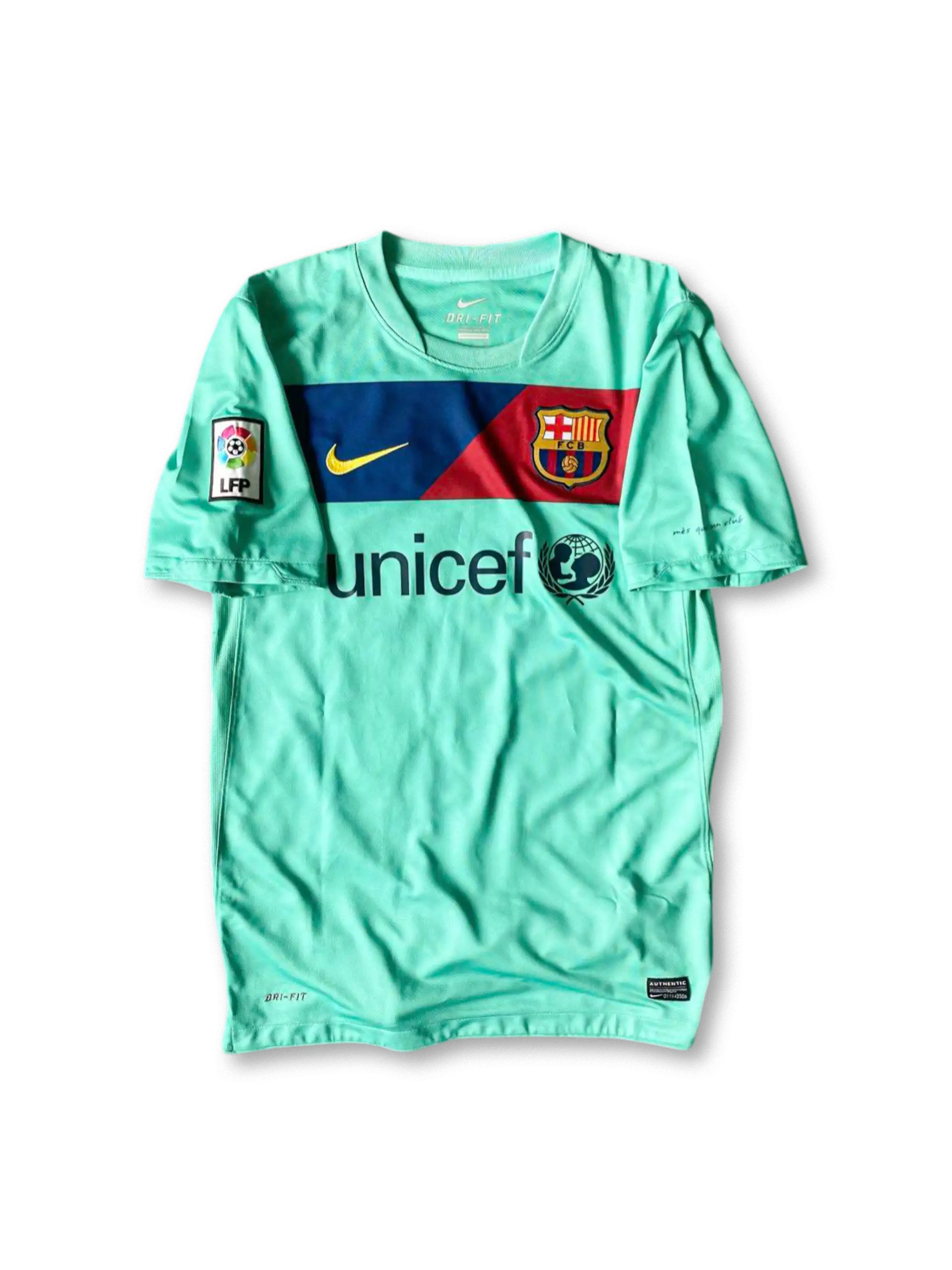 2010-11年のFCバルセロナアウェイユニフォームは、鮮やかなターコイズカラーにチームカラーの赤と青を大胆に配置。高密度刺繍のクラブエンブレムとNikeロゴが映え、Dri-FIT素材を使用し通気性と軽量性に優れ、メッシのスピードと技術を支える設計。黄金期の象徴的な一着として、コレクターに人気。
