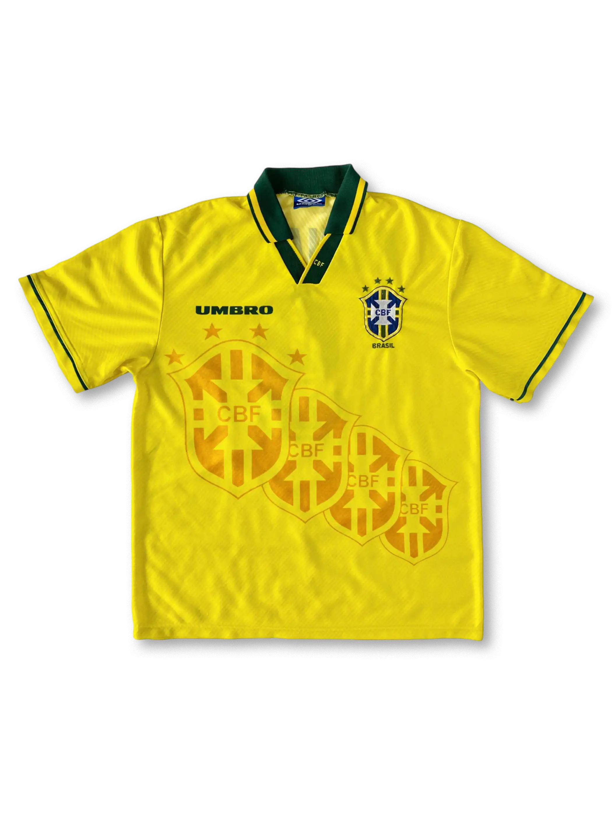 UMBRO製ポロ襟モデル。カナリアイエローにグリーンの襟・袖トリム、前身頃に連なるシャドーCBFグラフィック、胸は高密度刺繍クレスト。公式書体の手工植毛風ナンバー9、軽量ポリエステルと微細メッシュで通気・吸汗速乾に優れる。W杯優勝期を象徴する復刻価値の高い一着。