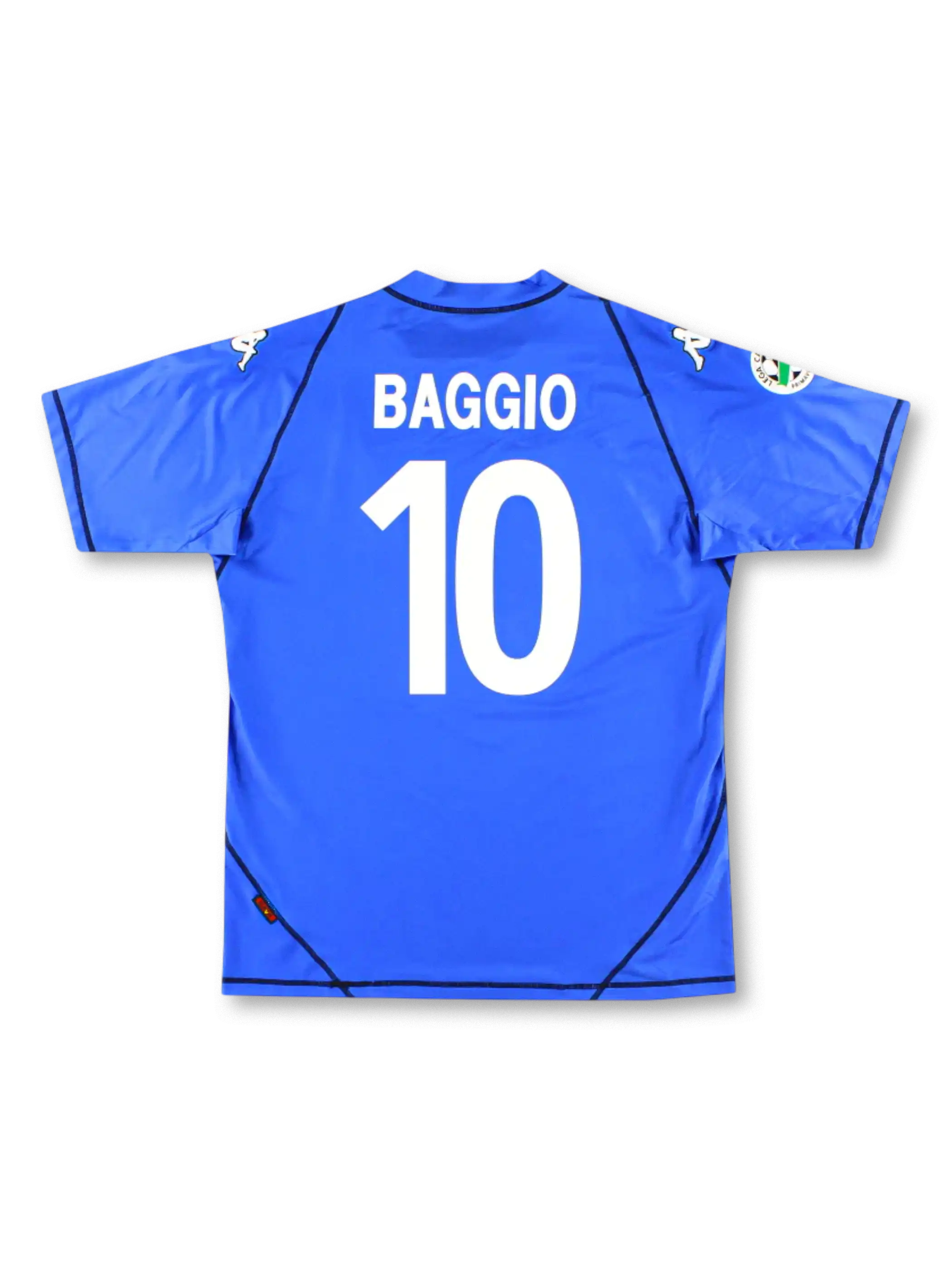 2003-04年ブレシアのホームユニフォームは、鮮やかなブルーにホワイトのV字を配したKappa製クラシックデザイン。胸中央には「Banca Lombarda」スポンサー、クラブエンブレムは刺繍仕様、背面には「Baggio 10」のマーキング。軽量ポリエステル素材で快適な着心地を実現し、バッジョ引退シーズンを象徴する一枚としてコレクターズ人気が非常に高い。
