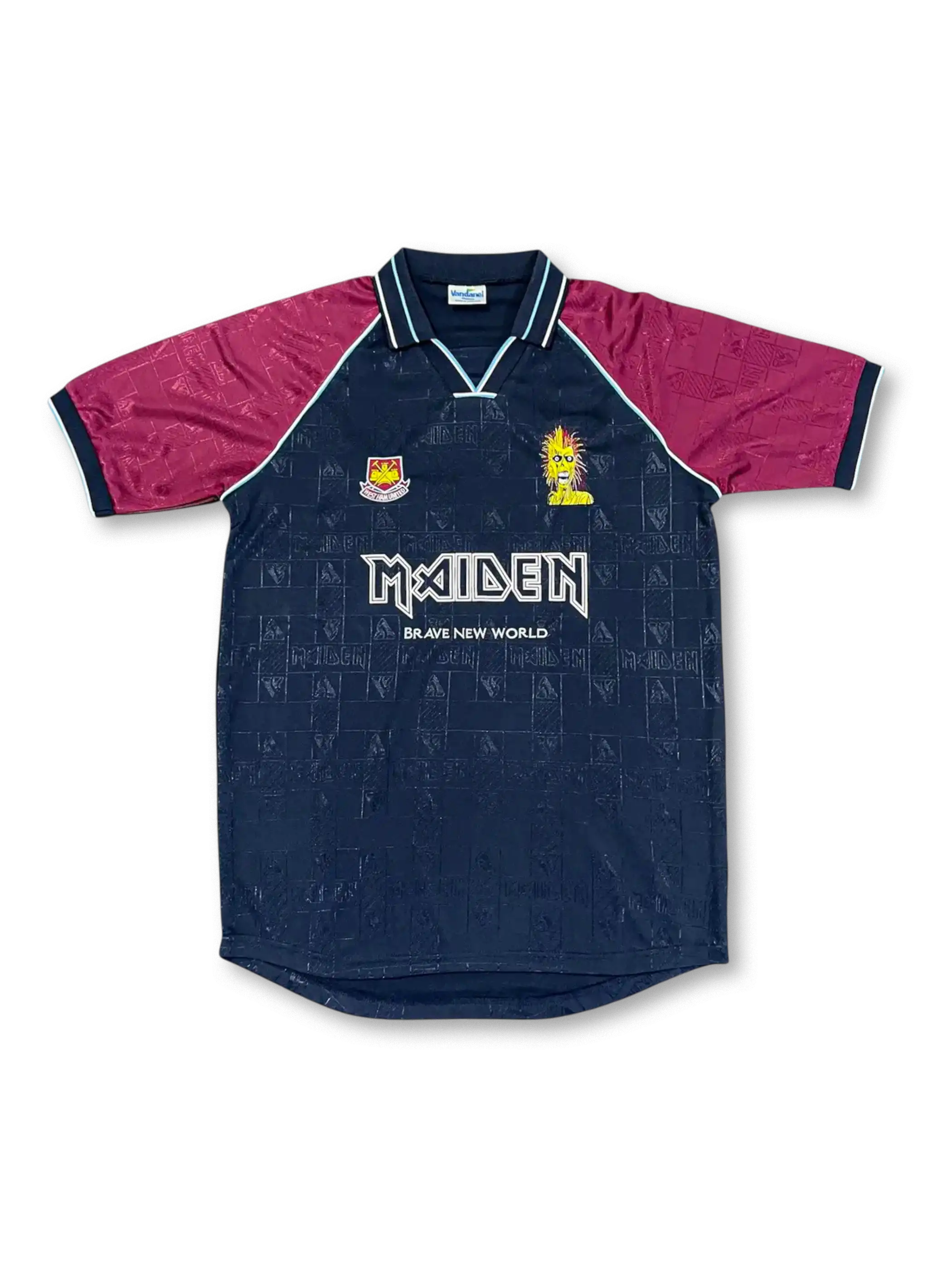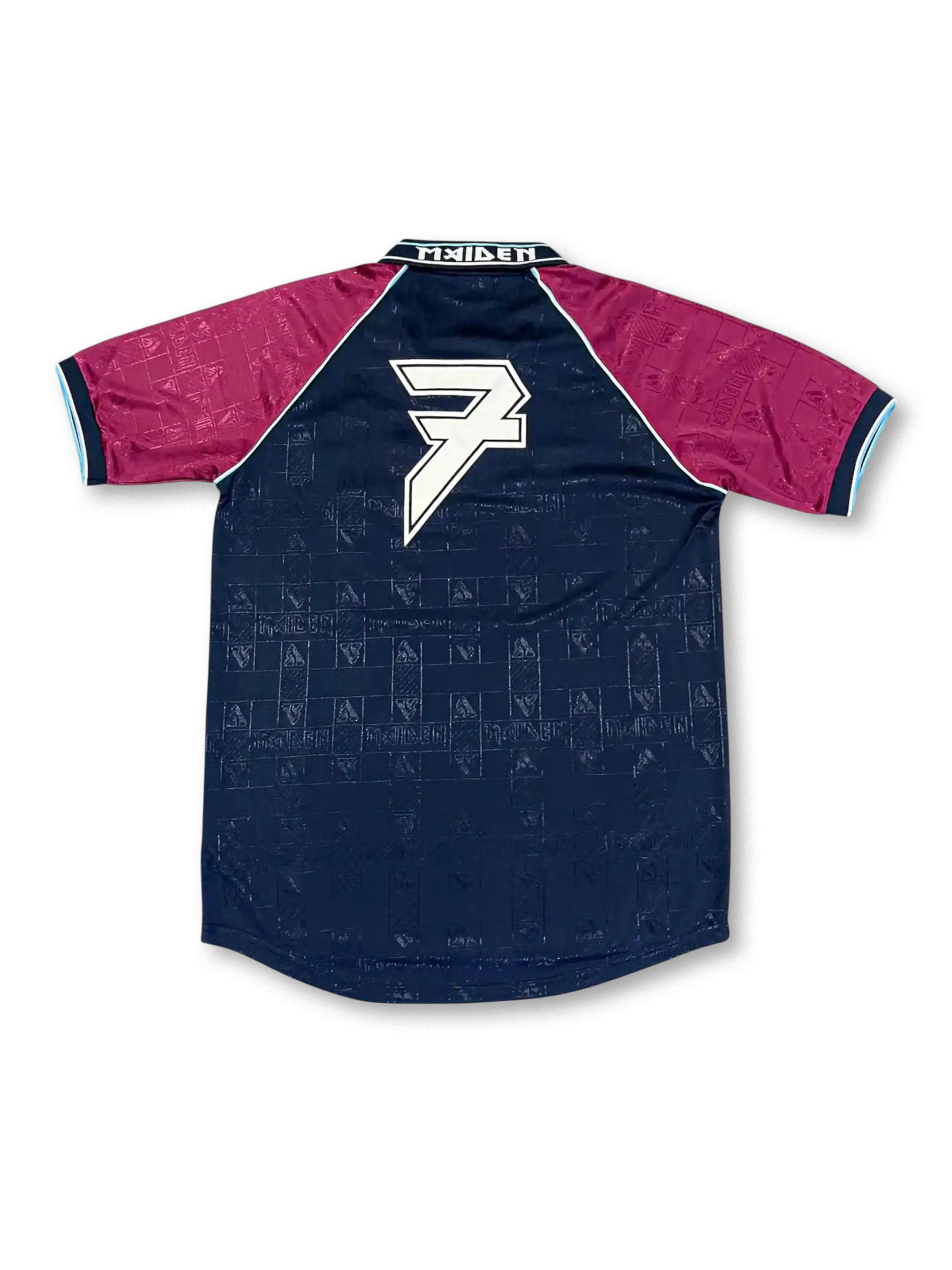 ネイビーを基調にクラレットの袖を合わせ、全体にアイアン・メイデンのロゴを織り込み。胸には「MAIDEN Brave New World」のスポンサープリント、背面にはバンドの象徴的なフォントで番号を配置。音楽カルチャーとサッカーが交差する特別仕様。