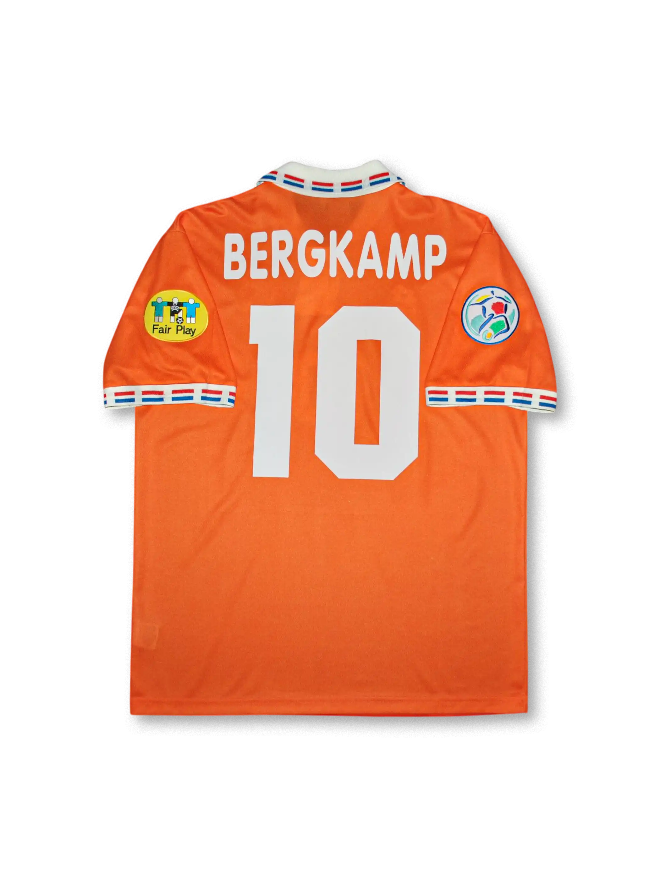 1996年ユーロ仕様のオランダ代表ホームユニフォーム。鮮烈なオレンジカラーに、襟と袖口へトリコロールラインを配したロット(Lotto)製デザイン。胸にはKNVB刺繍エンブレム、背面には「BERGKAMP 10」オフィシャルプリント。大会公式のフェアプレーパッチとユーロ96パッチが両袖に付属し、当時のマッチユース仕様を忠実に再現した一着。