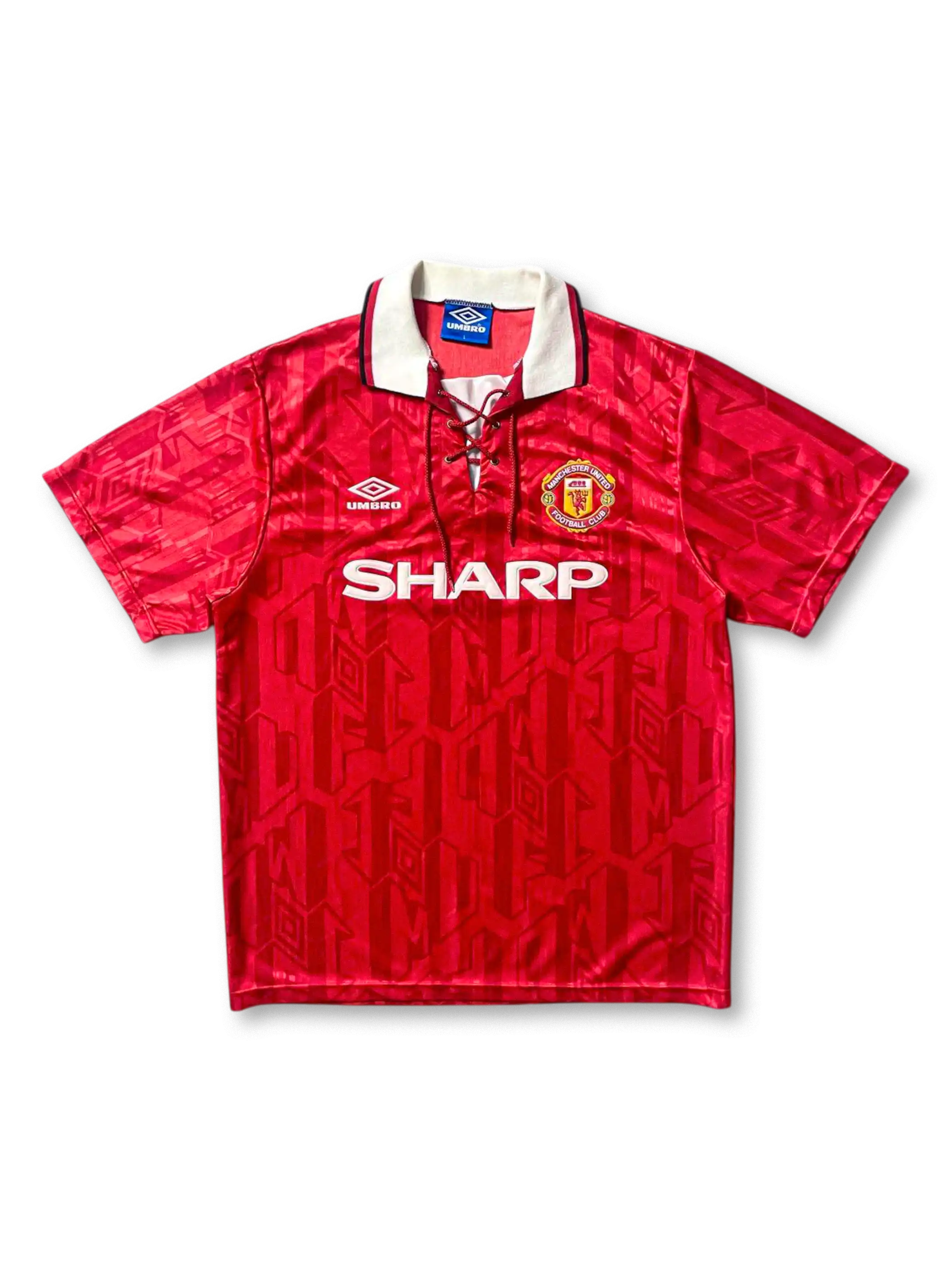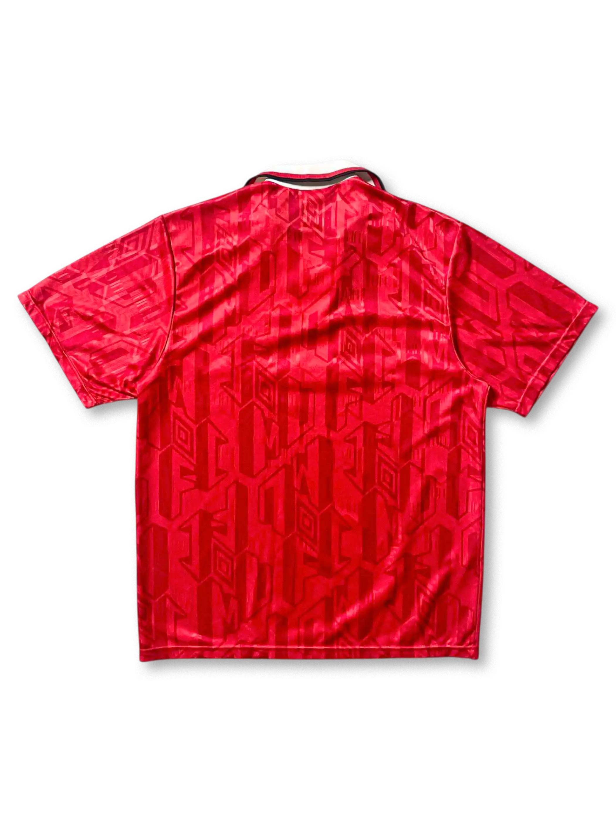 1992-94年マンチェスター・ユナイテッドのホームユニフォームは、深紅のクラブカラーに幾何学的な「MUFC」ジャカードパターンを織り込んだデザインが特徴です。胸には「SHARP」スポンサーが入り、UMBRO製らしい重厚感ある素材感とクラシックなレースアップ襟が当時のスタイルを強調。伝統とモダンが融合した90年代初頭の名作であり、プレミアリーグ黎明期を象徴するユニフォームです。