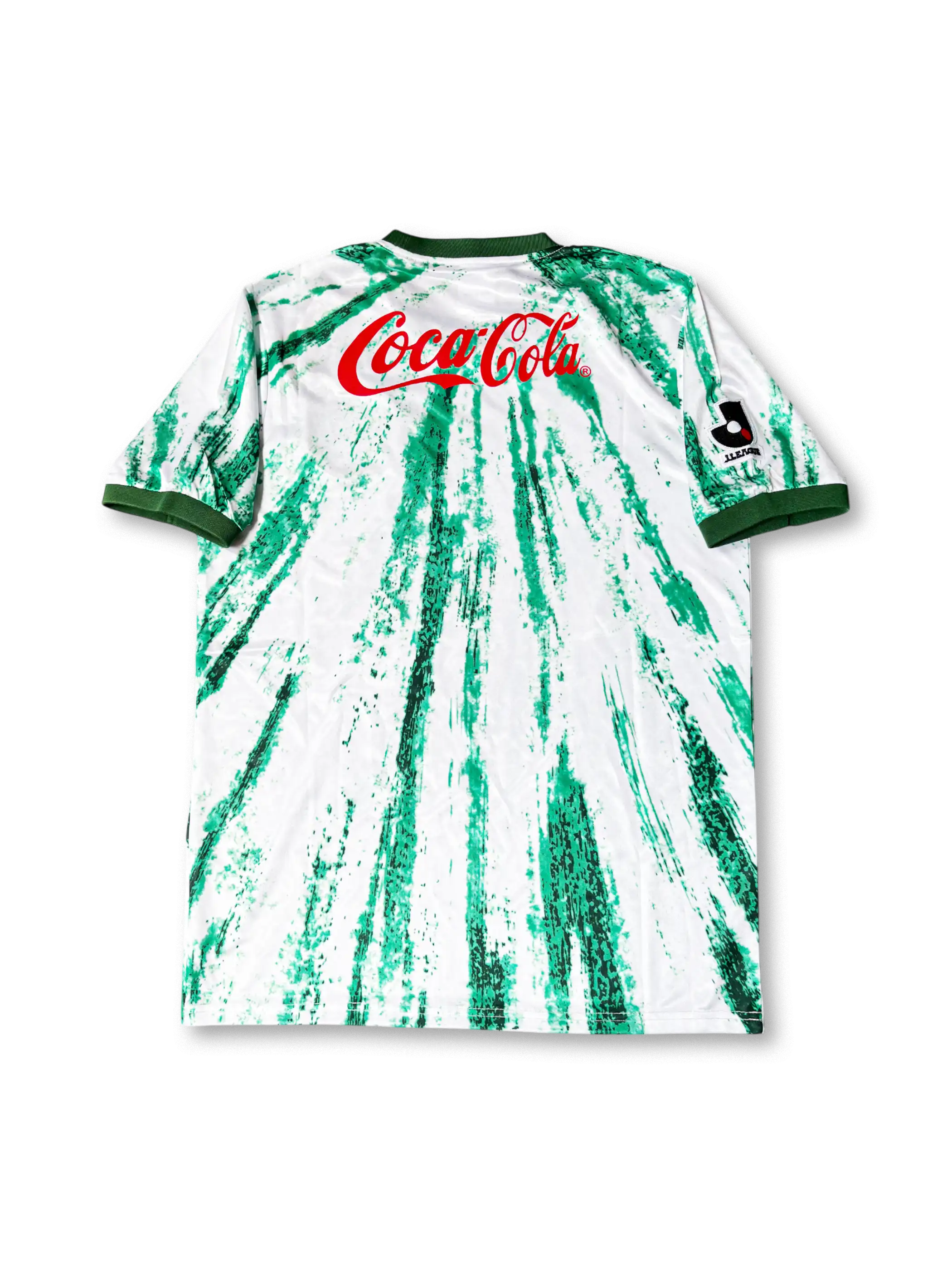 1994年ヴェルディ川崎のアウェイユニフォームは、ホワイトを基調にグリーンの放射状グラフィックを施した斬新なデザインが際立ちます。胸部には赤字の「Coca-Cola」スポンサーが大きく配置され、袖にはJリーグパッチと企業ロゴが並ぶなど、当時のJリーグ全盛期を象徴するアイコニックな仕様。吸湿速乾性に優れた軽量素材を採用し、選手たちが実際に着用したモデルを忠実に再現した、コレクション価値の高い一着です。
