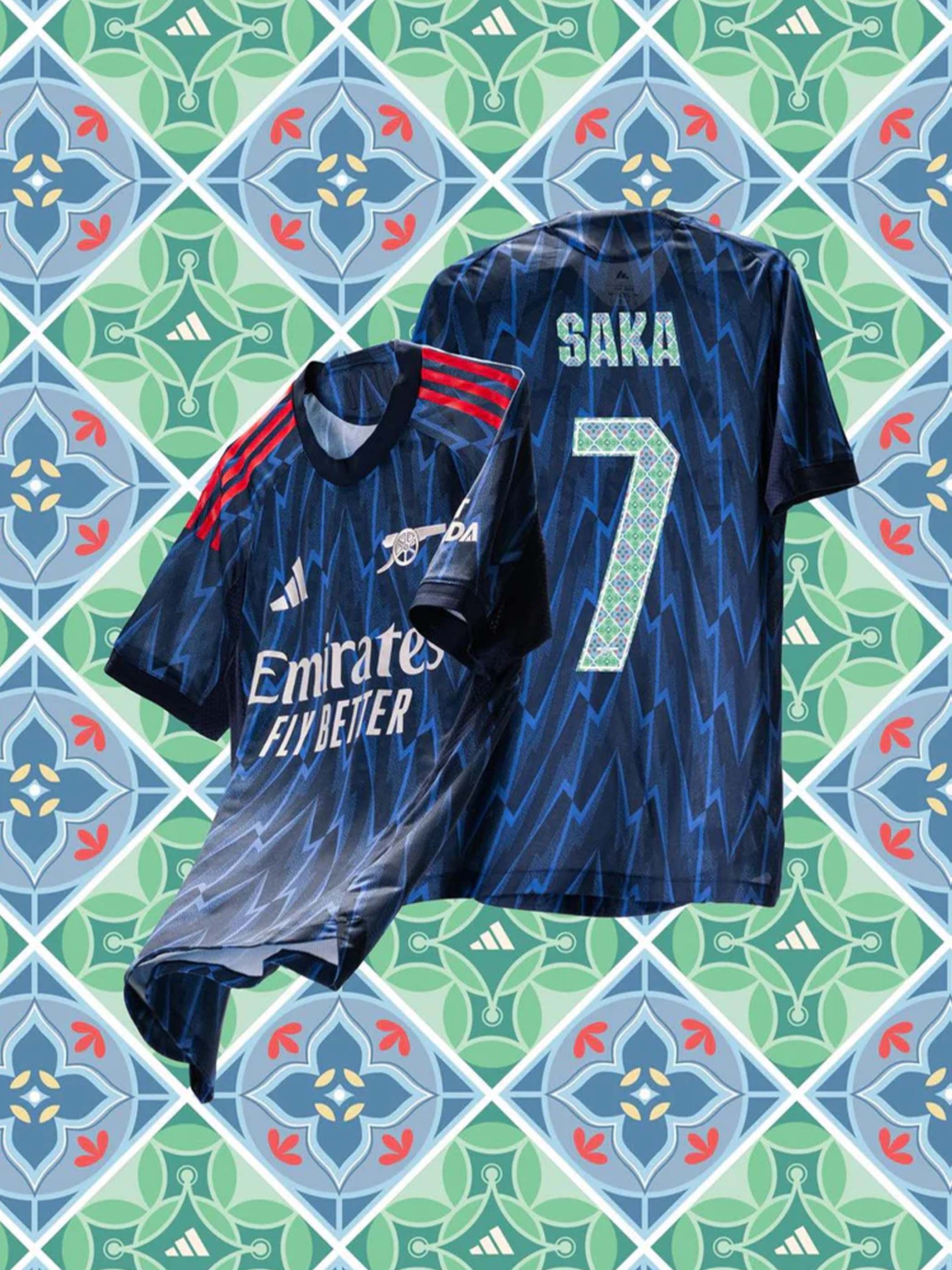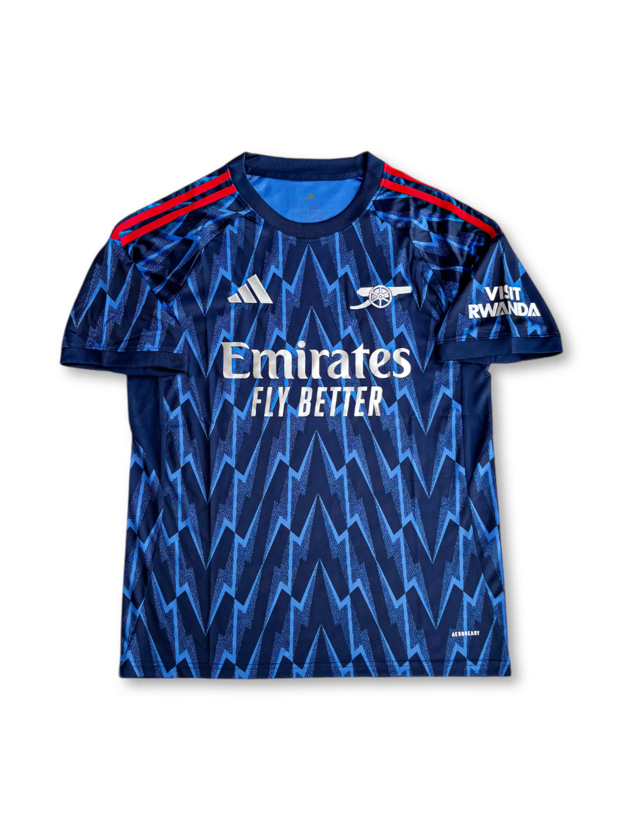 ネイビーブルーを基調に、稲妻を思わせる鮮烈なブルーグラフィックを全面に配したデザイン。肩にはアーセナルの伝統を象徴するレッドのスリーストライプスを走らせ、胸には「Emirates Fly Better」スポンサーとクラブエンブレムを配置。背面には特別版フォントによる「RICE 41」がプリントされ、スター選手を讃えるプレミアム仕様。通気性と快適性を高めたAEROREADY素材を使用し、試合観戦にも日常着にも適したコレクター必携の限定ユニフォーム。