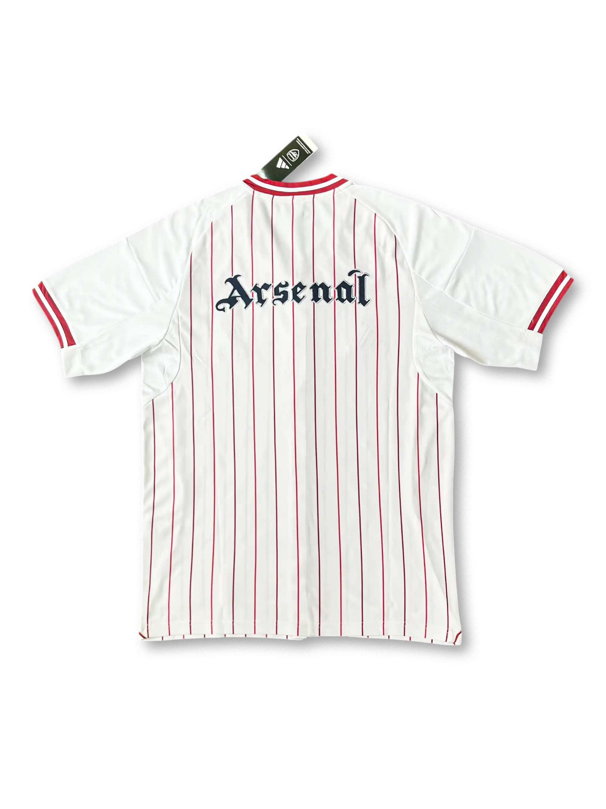 2025/26シーズンに登場したアーセナルのホワイトベースボールシャツは、赤のピンストライプとクラシック調のロゴを融合させ、ガナーズの伝統とモダンスタイルを表現した限定モデル。