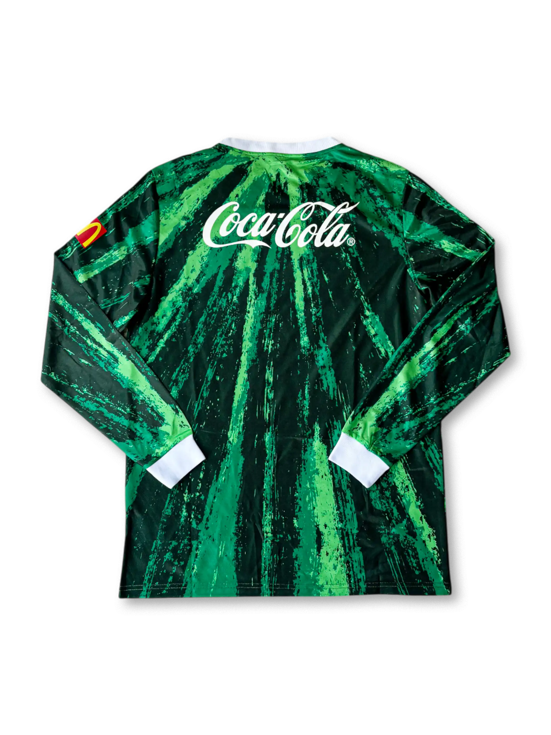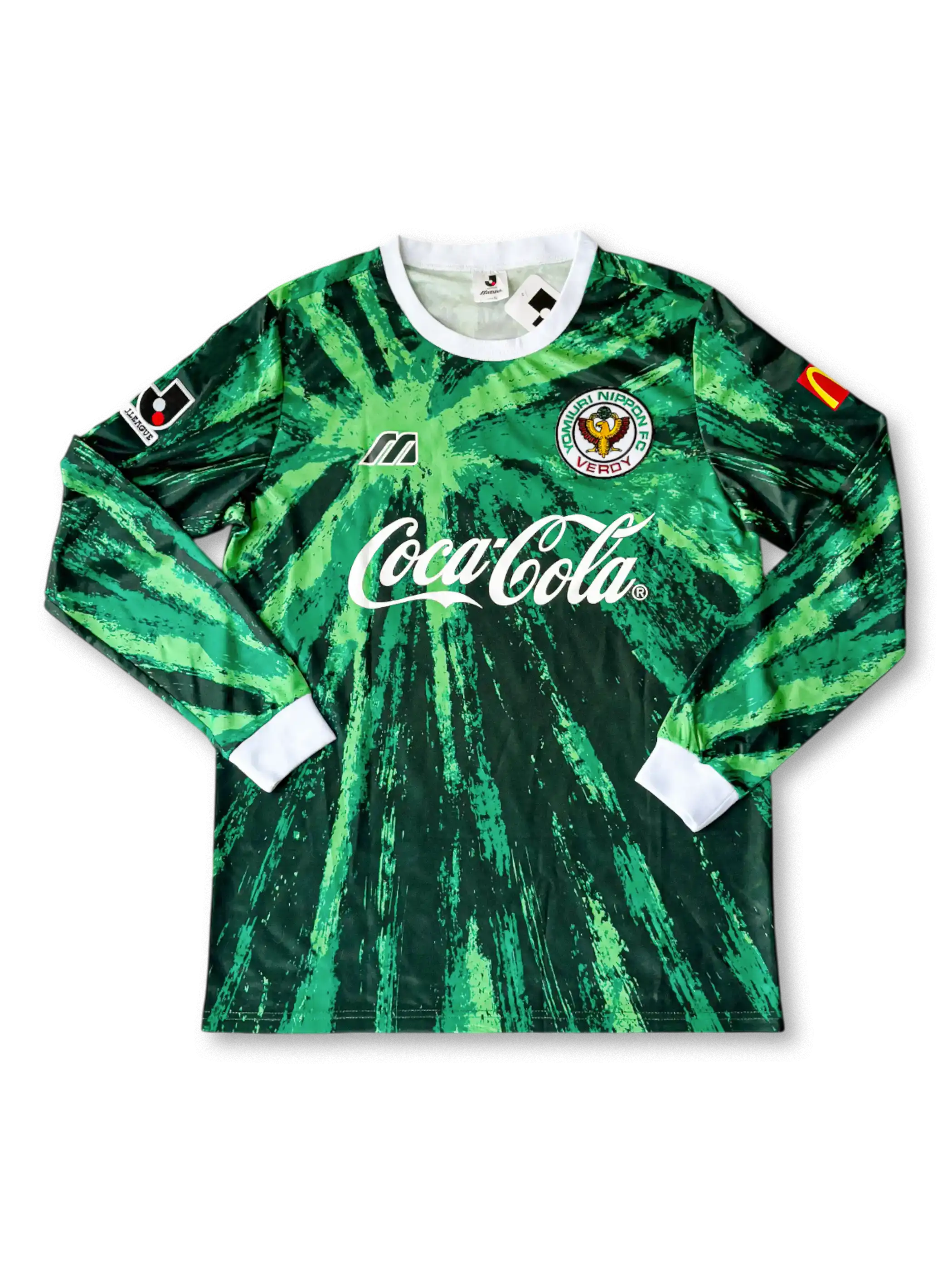 鮮烈なグリーン基調に放射状のスプラッシュデザインを採用。胸には「Coca-Cola」、袖には「マクドナルド」スポンサーが入り、当時の商業的躍進を象徴するディテール。ミズノ製で長袖仕様は特に希少。初期Jリーグの熱狂を象徴する一着で、コレクション価値は極めて高い。