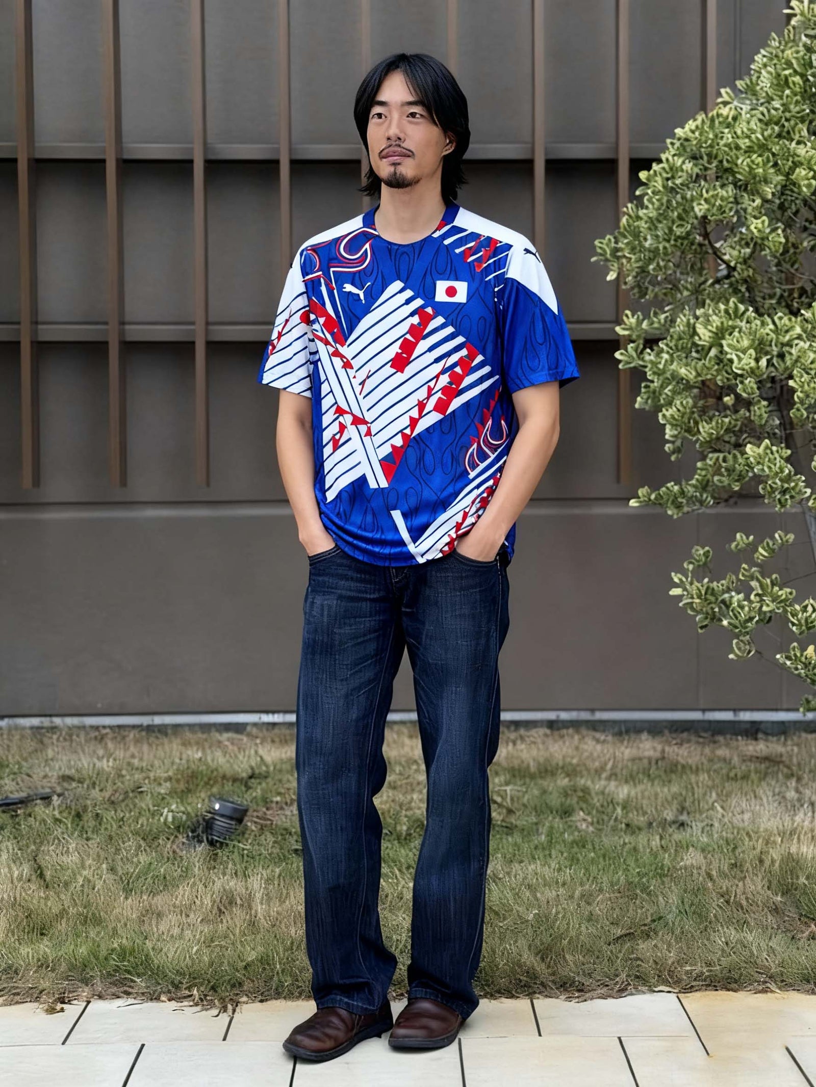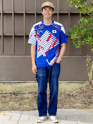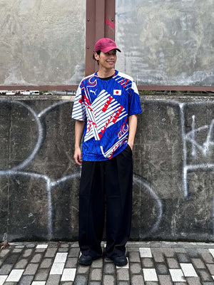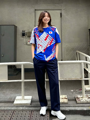 94年の斜線モチーフと98年の“炎”グラフィックを大胆に融合したハイブリッドデザインに、背面「KAZU 11」を配した記念仕様。ジャパンブルーを基調にホワイト&レッドの差し色が映え、90年代の躍動感を現代的に再解釈しています。新国立競技場のお披露目用として公式販売がなかったため市場流通が極めて少なくコレクター価値が高い一方、軽量ポリエステルで通気性に優れ、観戦やタウンユースでも快適。キング・カズの象徴性と日本代表の歴史を一着で語る特別なユニフォームです。