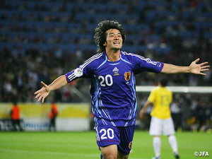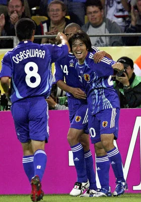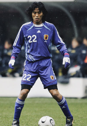 アディダスのClimaCoolを採用し、躍動感あるライトブルーのフレーム柄と日の丸タブで仕上げた2006年日本代表ホームキット。