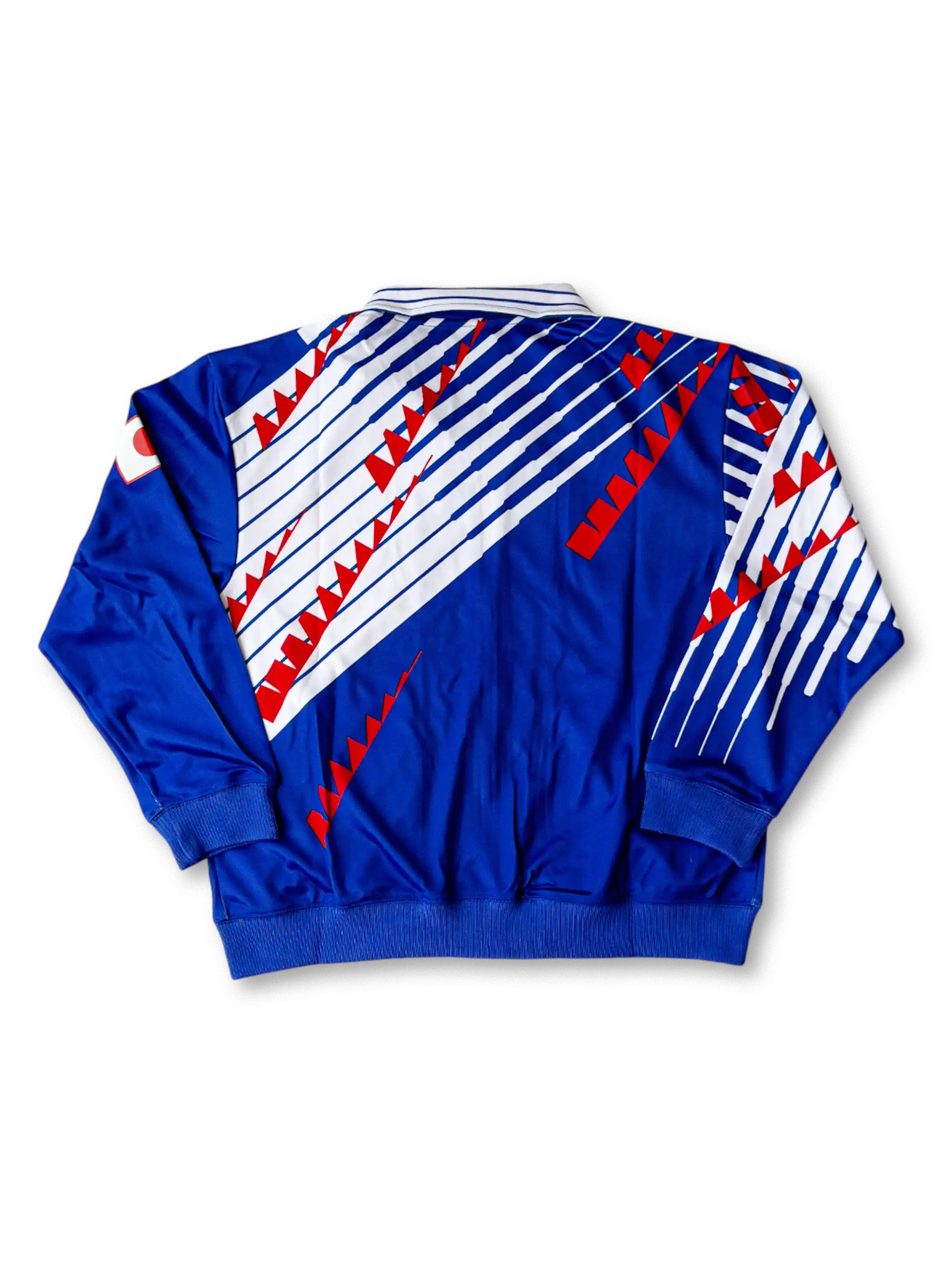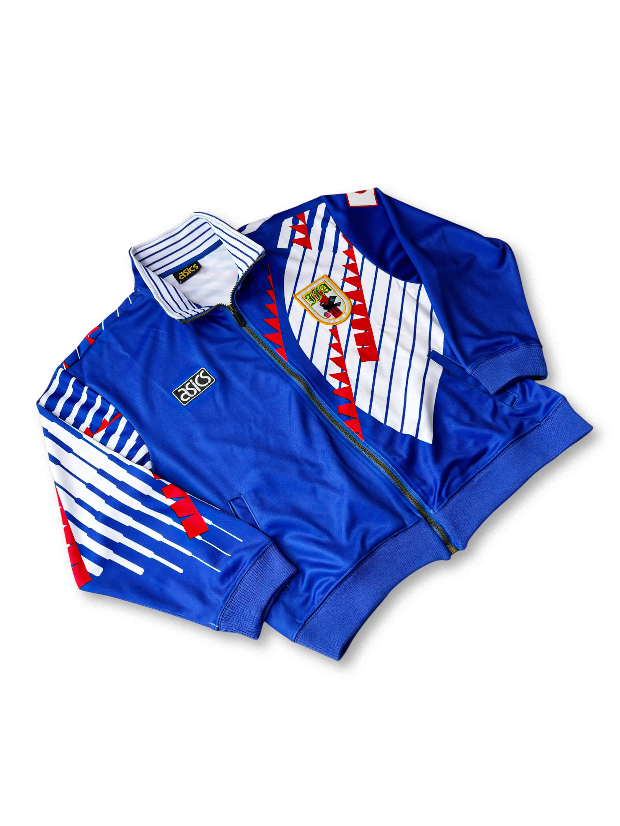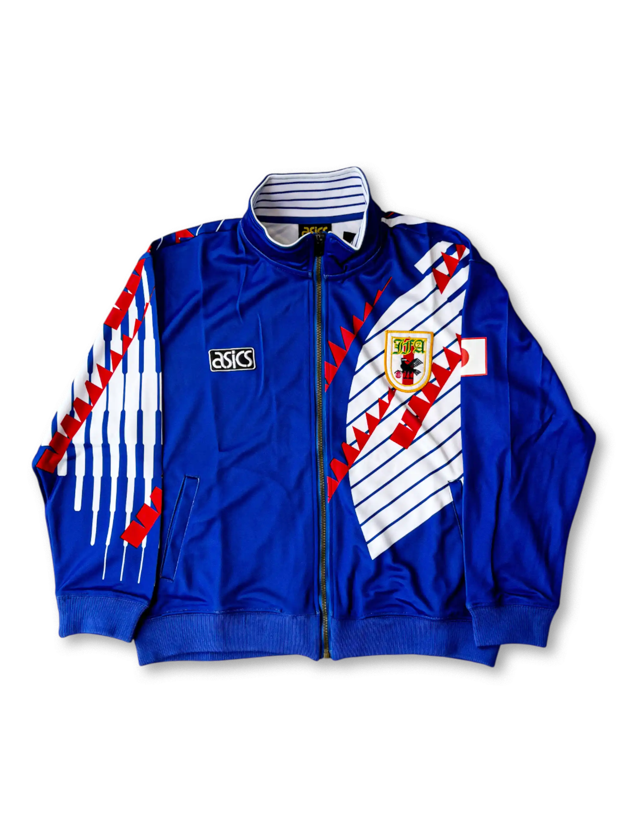 サムライブルーを基調に赤白のジグザグストライプを大胆に配したグラフィックデザイン。胸には旧日本代表エンブレムとasicsロゴを施し、ジップアップ仕様で実用性も高い。軽量ポリエステル素材により快適な着心地を実現したトラックジャケットで、ドーハの悲劇期を含む1994〜1996年代表活動を象徴する稀少モデル。