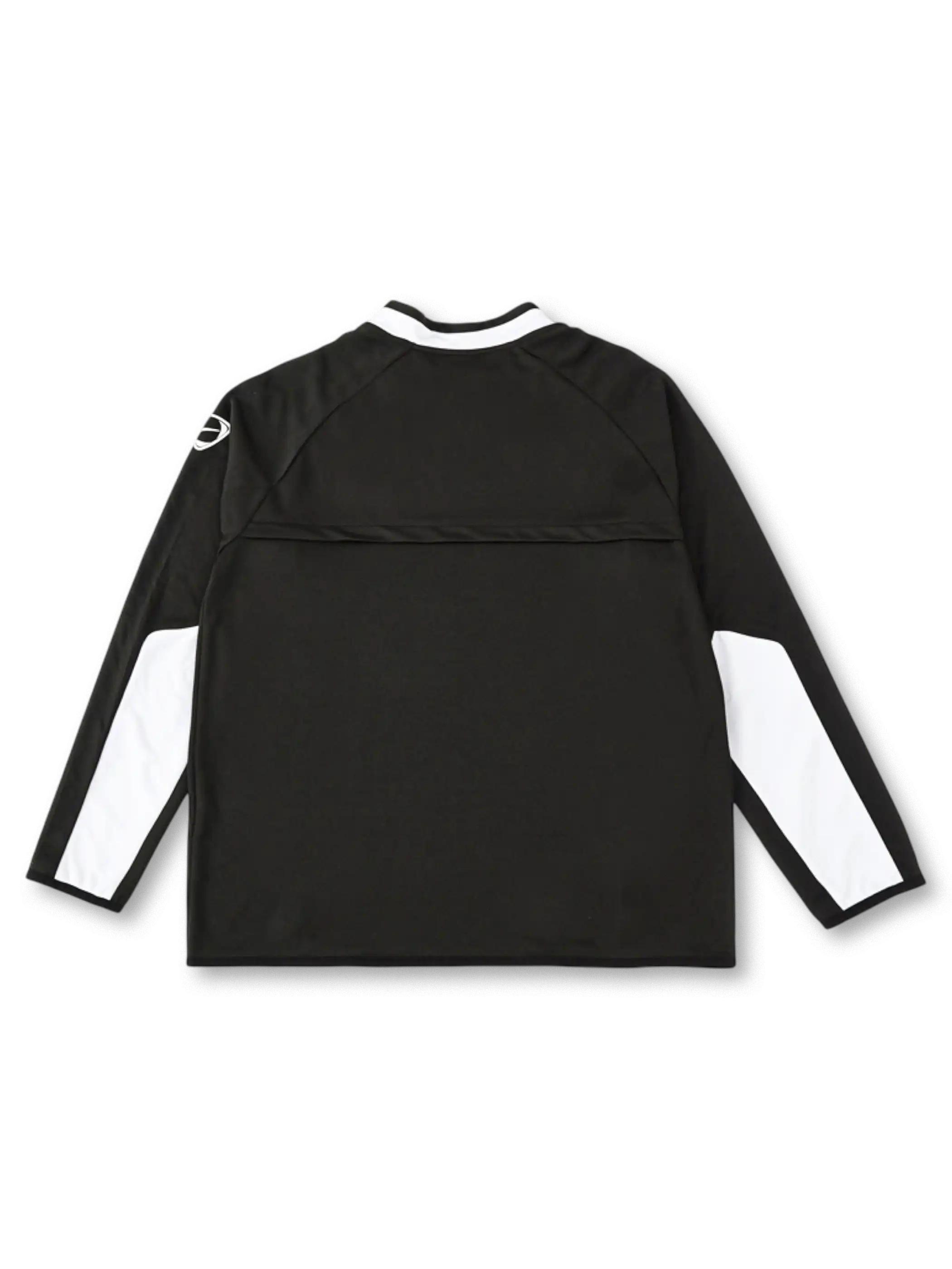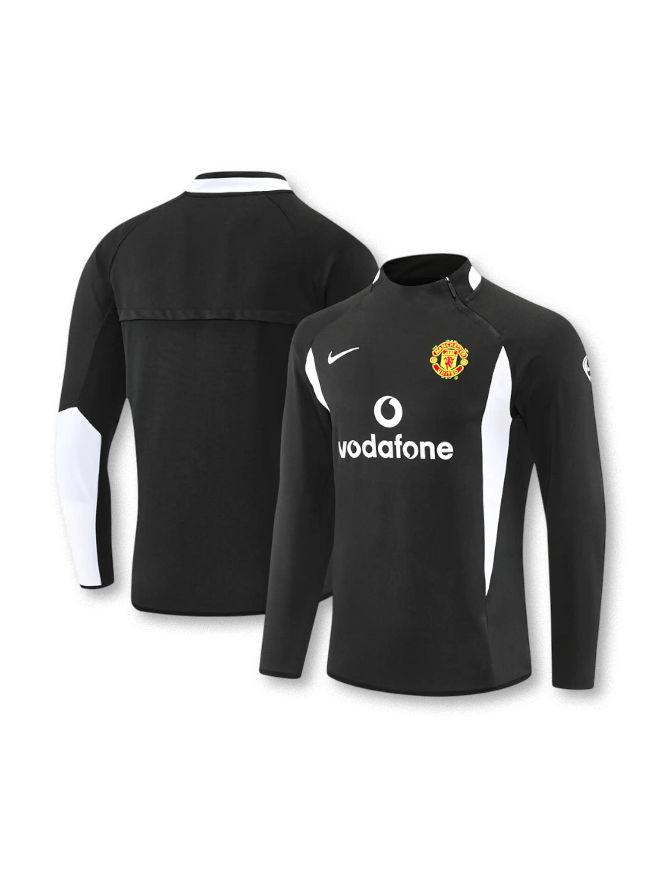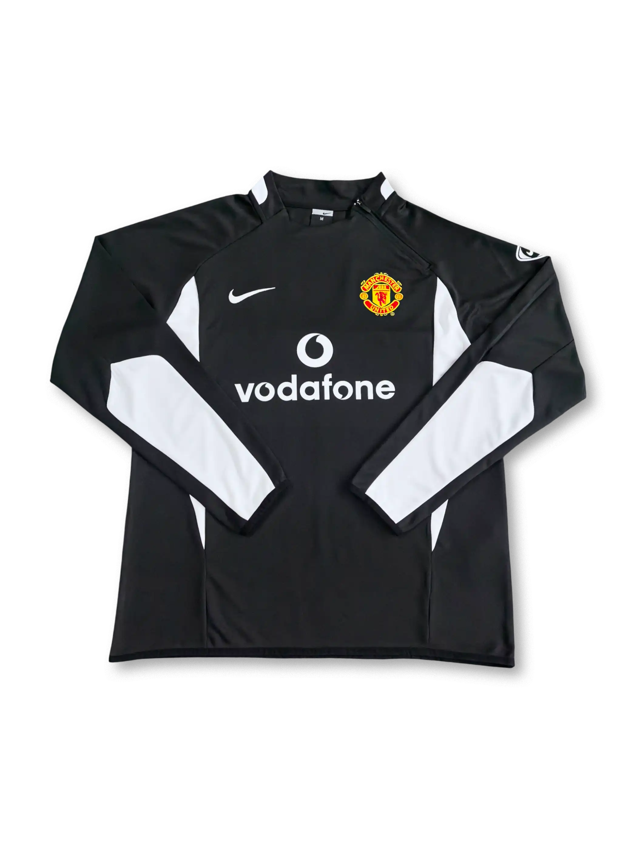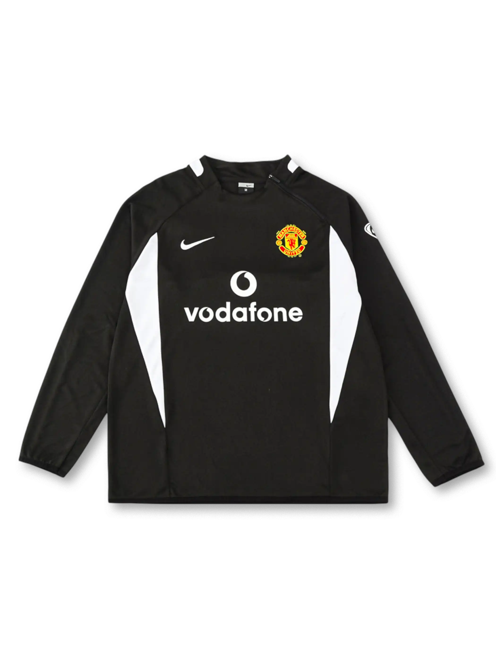 クラシックなブラックを基調にホワイトパネルをアクセントにしたデザイン。胸にはVodafoneロゴ、左胸にクラブエンブレム、右胸にNikeスウッシュを配置。長袖仕様でフィット感のあるシルエット。公式トレーニングウェアとして支給されたモデルで、2000年代前半のユナイテッドを象徴する一着。