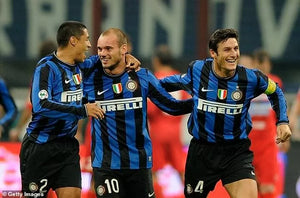 青黒の伝統ストライプを基調に、胸には「FINAL MADRID 2010」プリントを施した特別仕様。右胸にNikeスウッシュ、中央にPirelliスポンサー、左胸にクラブエンブレムとスクデットパッチを装着。袖にはチャンピオンズリーグ公式パッチが付属。長袖仕様でNikeFIT素材を採用し、通気性とフィット感を兼ね備える。三冠達成を象徴するCL決勝ユニフォームでコレクター必携の一着。
