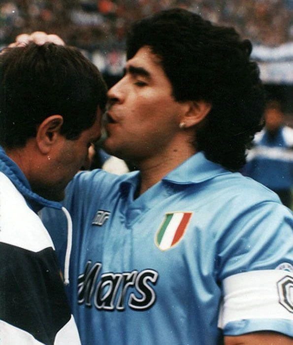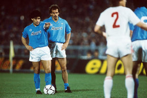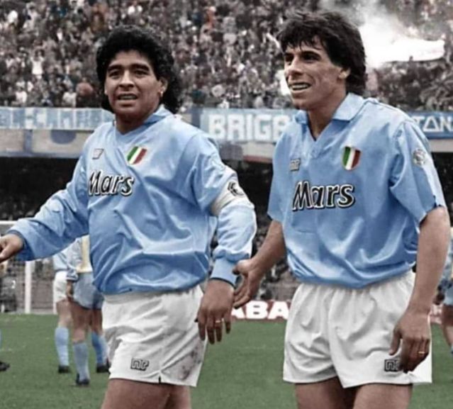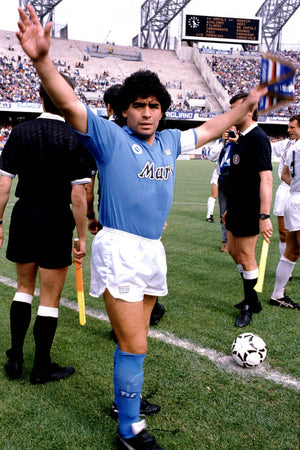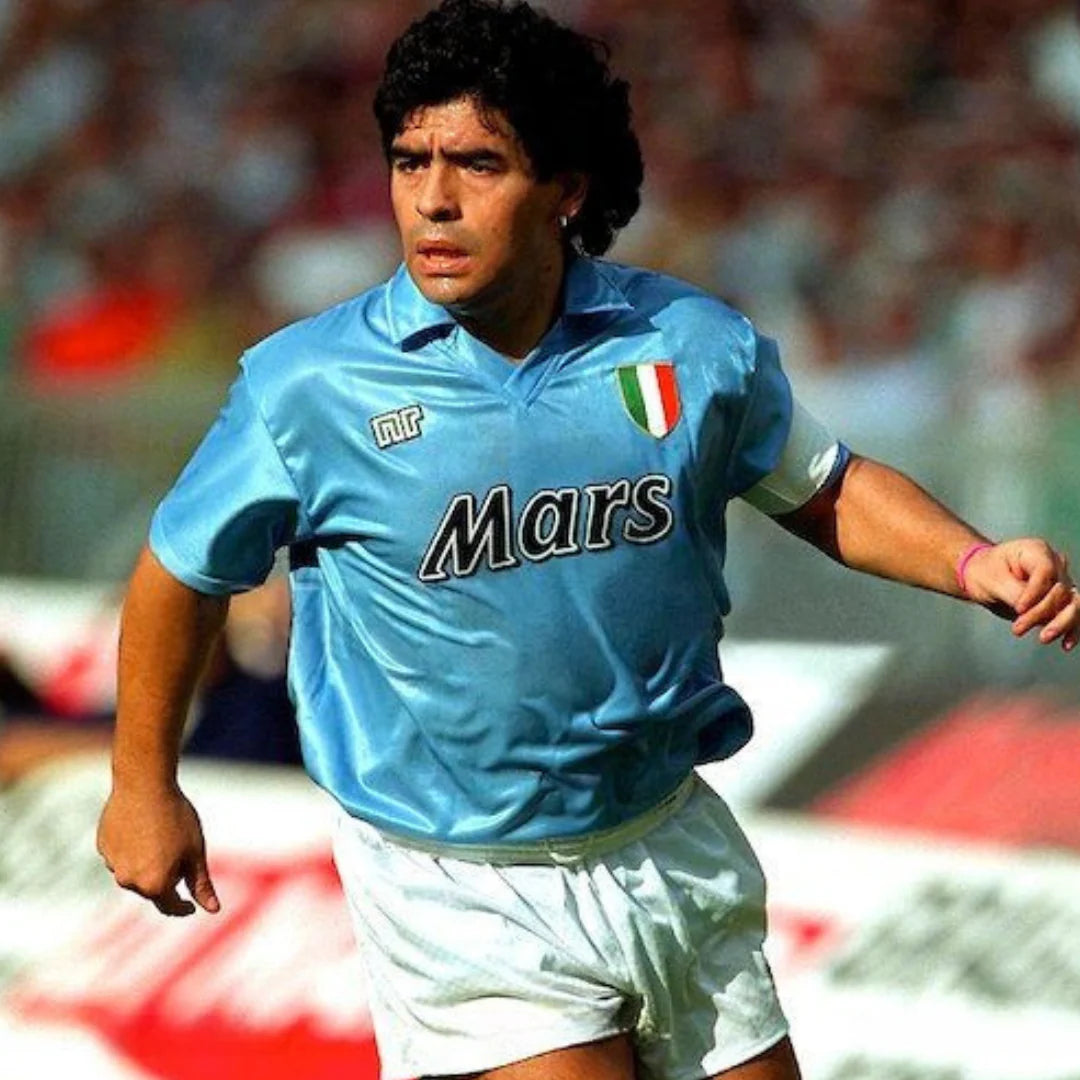 水色を基調としたナポリ伝統のカラーリングに、胸元にはMarsスポンサーとスクデットシールドを配置。右胸にはNRロゴ、袖にはクラブエンブレムが施されている。シンプルながらもクラブ黄金期を象徴するデザインで、マラドーナが在籍した最後のシーズンに着用された稀少なモデル。
