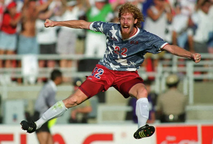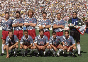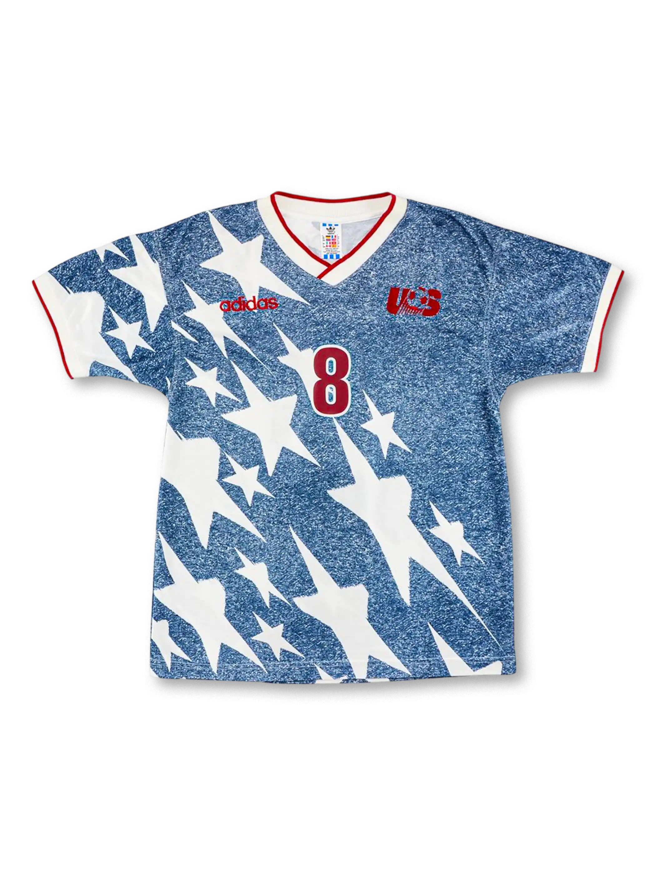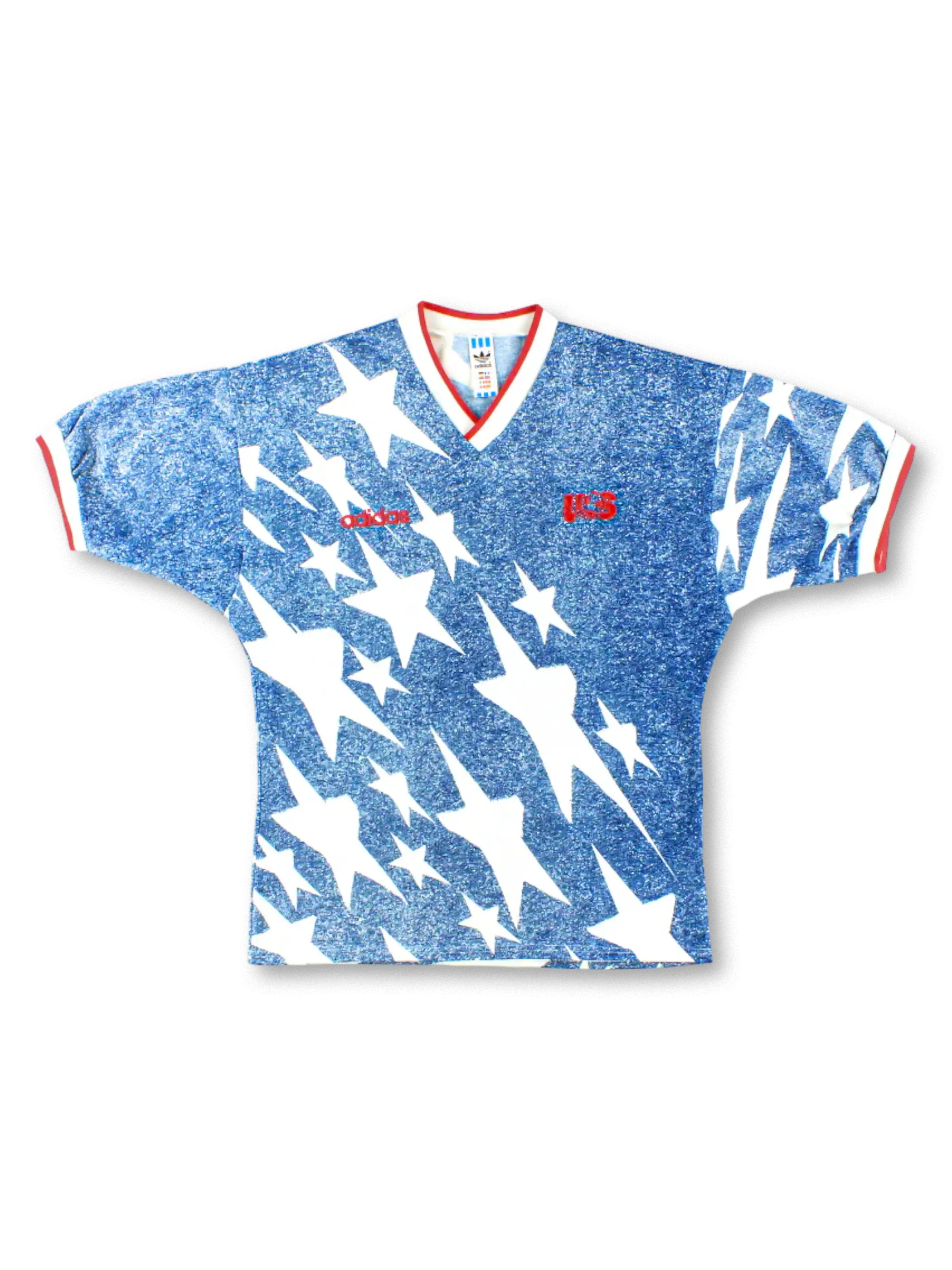 ブルー基調に白の星柄を全面にあしらった大胆なデザインで、赤い差し色を襟や袖口に施したVネック仕様。胸にはadidasロゴと「USA」エンブレムが刺繍され、1994年自国開催のワールドカップ全試合で着用された特別モデル。ポリエステル素材を用い、当時のアメリカ代表を象徴する稀少な一着として知られる。