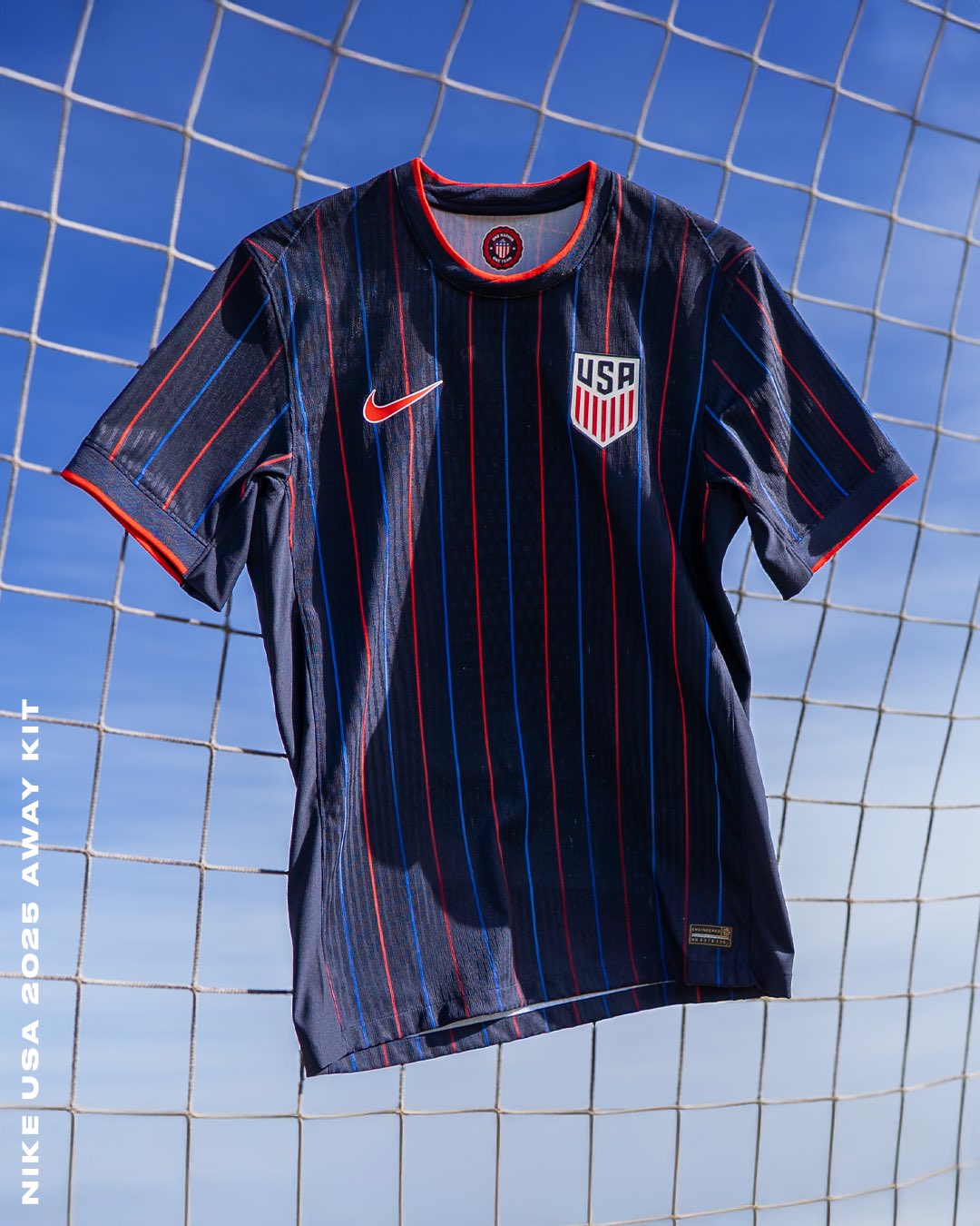 濃紺をベースに、レッドとブルーの細いストライプを縦に配したクラシックかつモダンなデザイン。胸にはNikeスウッシュとUSAエンブレムを配置し、襟元と袖口にもレッドをあしらったディテールが特徴。軽量ポリエステル素材を採用し、通気性と快適性を確保。2526シーズンに向けて製作されたアウェイユニフォーム。