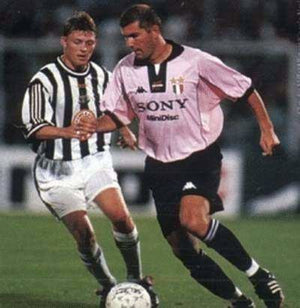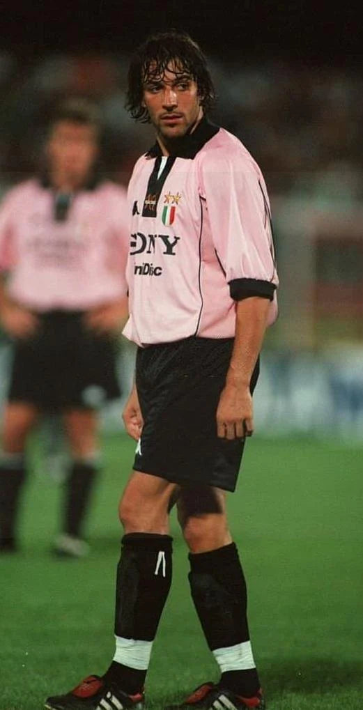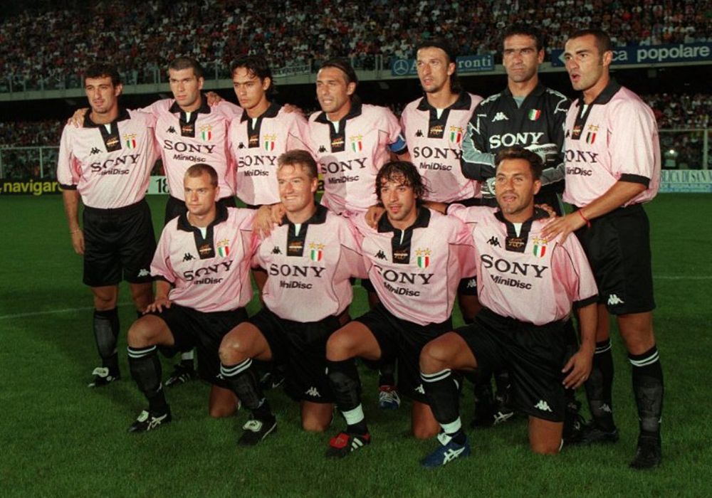 クラブ創設100周年を記念し、伝統を象徴するピンクを基調にブラックの襟とトリムを組み合わせたデザイン。胸には「SONY MiniDisc」スポンサーとKappaロゴ、左胸にはスクデットパッチと2つ星のクラブエンブレムを配置。ポリエステル素材を用いた快適な仕立てで、1997-98シーズンにおいて国内リーグ制覇を達成した際に着用された特別モデル。