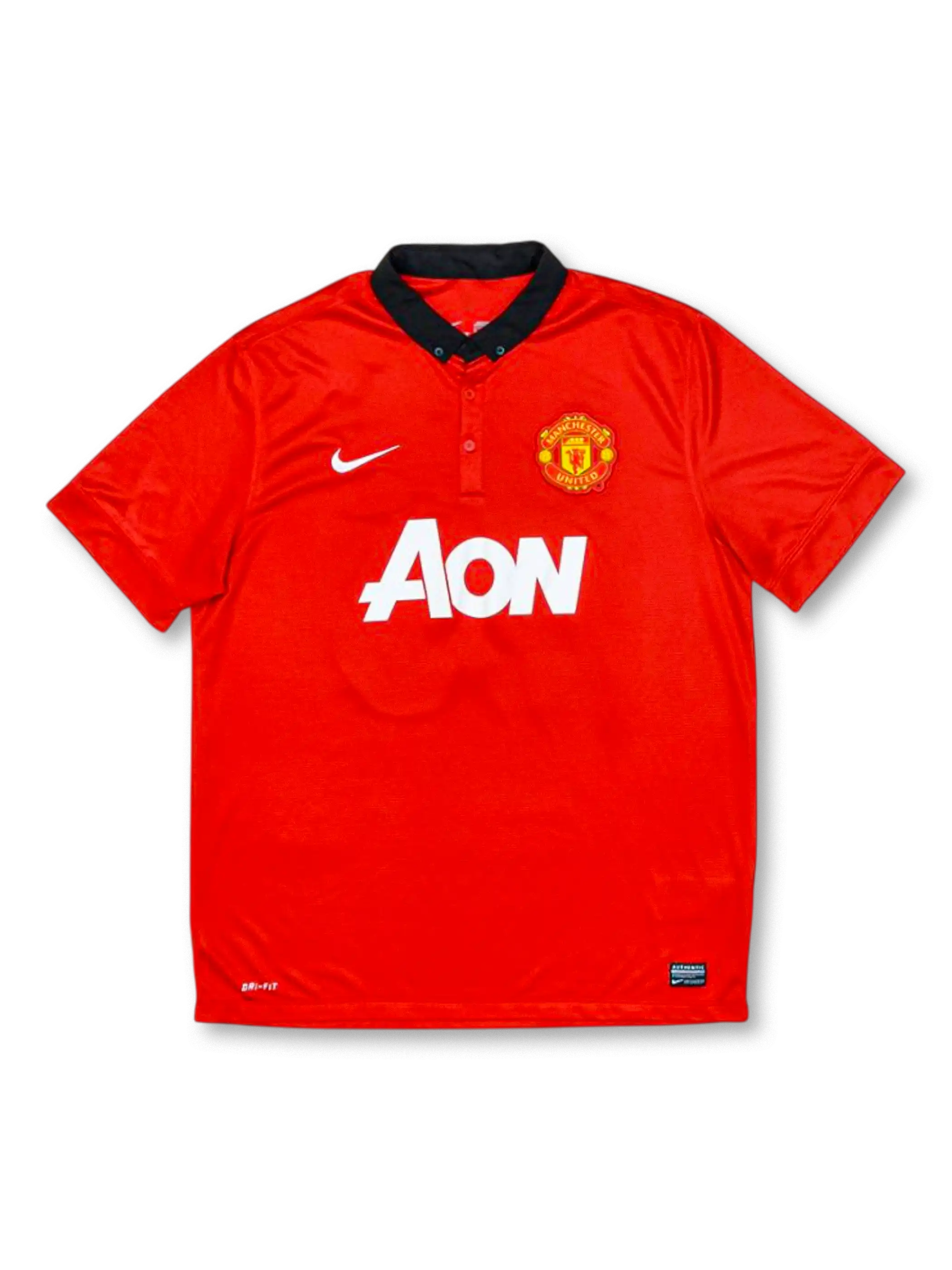 クラブ伝統のレッドにブラックカラーの襟付きデザインを採用した2013-14シーズンのホームユニフォーム。胸にはAONスポンサーとクラブエンブレム、背面には香川真司のネームと26番を配置。ポリエステル素材による軽量性と通気性を備え、Nike Dri-FITテクノロジーを搭載。プレミアリーグ公式パッチ付き仕様。