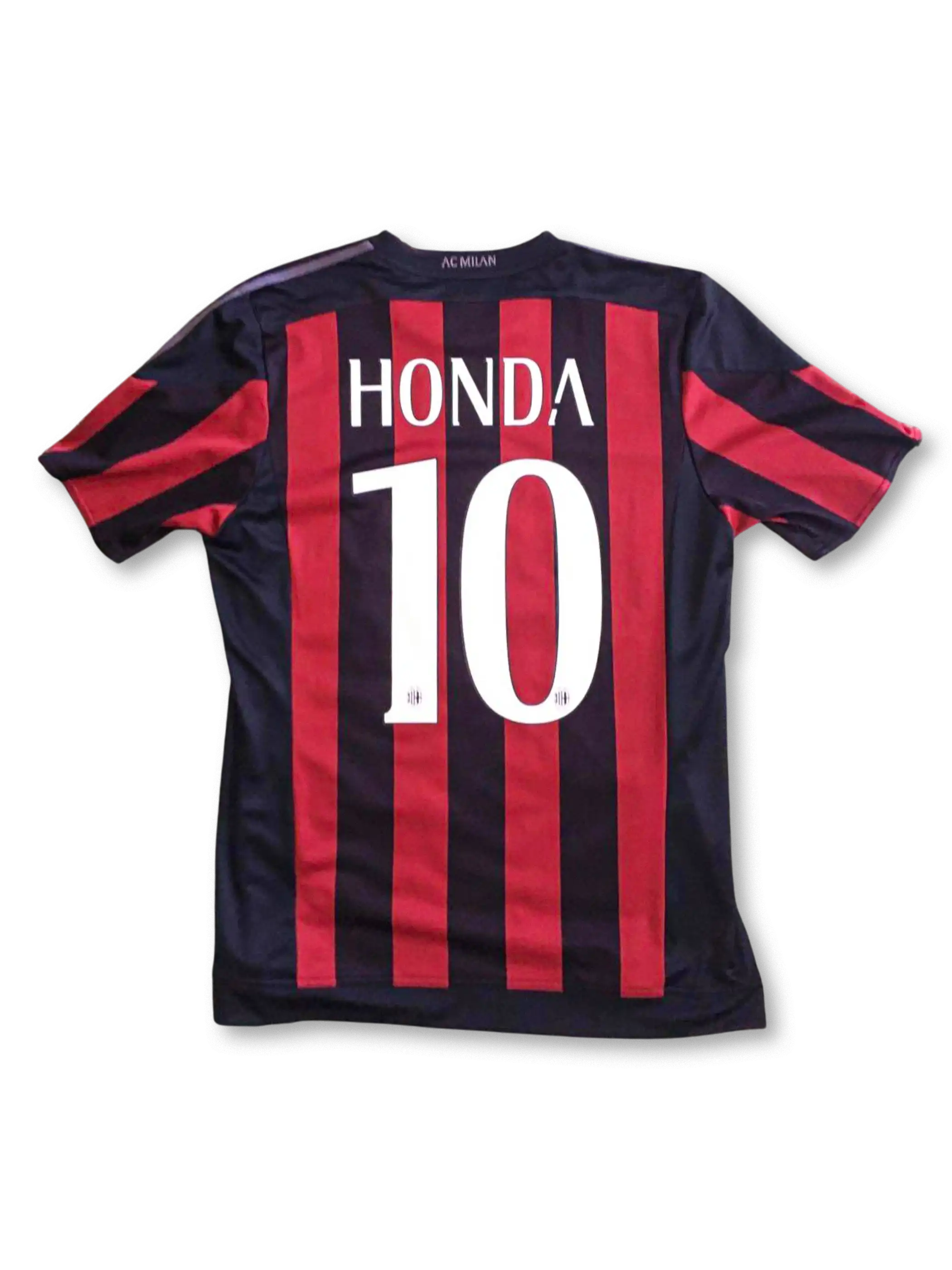 クラブ伝統の赤黒縦縞デザインを基調に、2015-16シーズン仕様として白地の十字エンブレムを採用したホームユニフォーム。背面には「HONDA 10」のオフィシャルプリント入りで、日本人エースの存在感を示す一着。クレスト刺繍、アディダスロゴ、Fly Emiratesスポンサーが配され、ポリエステル素材による軽量性と通気性を備えた設計。