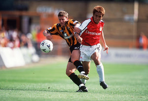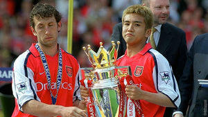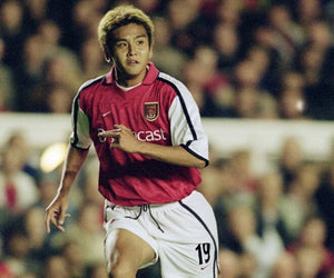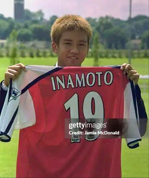 クラシックな赤白配色にネイビートリムを加えたNike製ホームモデルで、胸にはDreamcastスポンサーロゴ、袖にはプレミアリーグパッチを装備し、背面にはINAMOTOのネームと19番プリント入り。ポリエステル素材を用いた通気性の高い仕様で、アーセナル黄金期を象徴する一着。