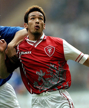 ペルージャ加入初年度の1998-99シーズンに中田英寿が着用したホームユニフォーム。胸に大きく描かれた「グリフォン」のクラブシンボルが迫力あるデザインで、赤と白のコントラストが際立つ一着。中田はこのシーズン、ユヴェントス戦での鮮烈な2得点を含むプレーで世界に衝撃を与え、日本人選手のヨーロッパ挑戦を象徴する存在となった。コレクター必携の90年代名作。
