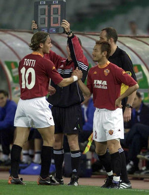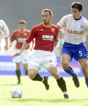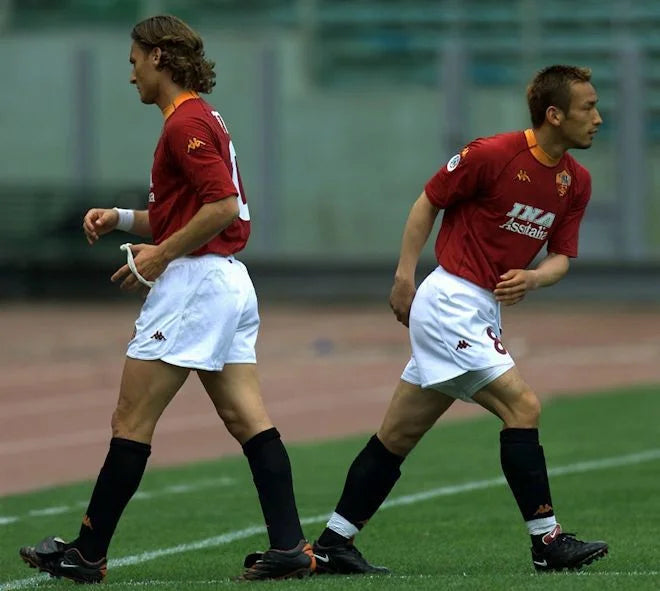Kappa製ボルドー基調のシンプルかつ力強いデザインで、胸には「INA Assitalia」スポンサーとクラブエンブレムを配置。背面には「NAKATA 8」のオフィシャルマーキング仕様。軽量で伸縮性のある素材を使用し、着心地と機能性を兼備。2000-01シーズン、ASローマがセリエAを制覇した歴史的シーズンに着用されたモデル。