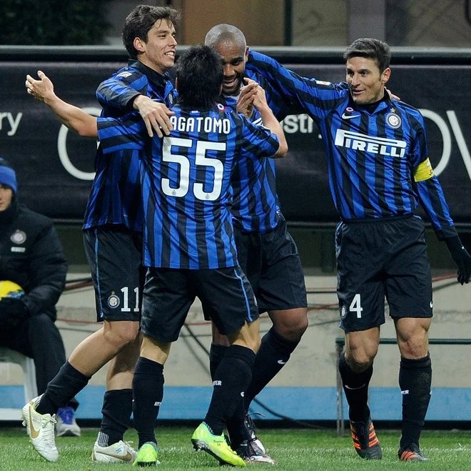 ブラックとブルーの縦縞にジグザグのグラフィックを配した独自デザイン。胸にはNikeスウッシュとクラブエンブレム、中央に「Pirelli」スポンサーを配置。背面には「NAGATOMO 55」のオフィシャルマーキング仕様。軽量ポリエステル素材で通気性と快適性を備え、2010-11シーズンのインテルを象徴するモデル。
