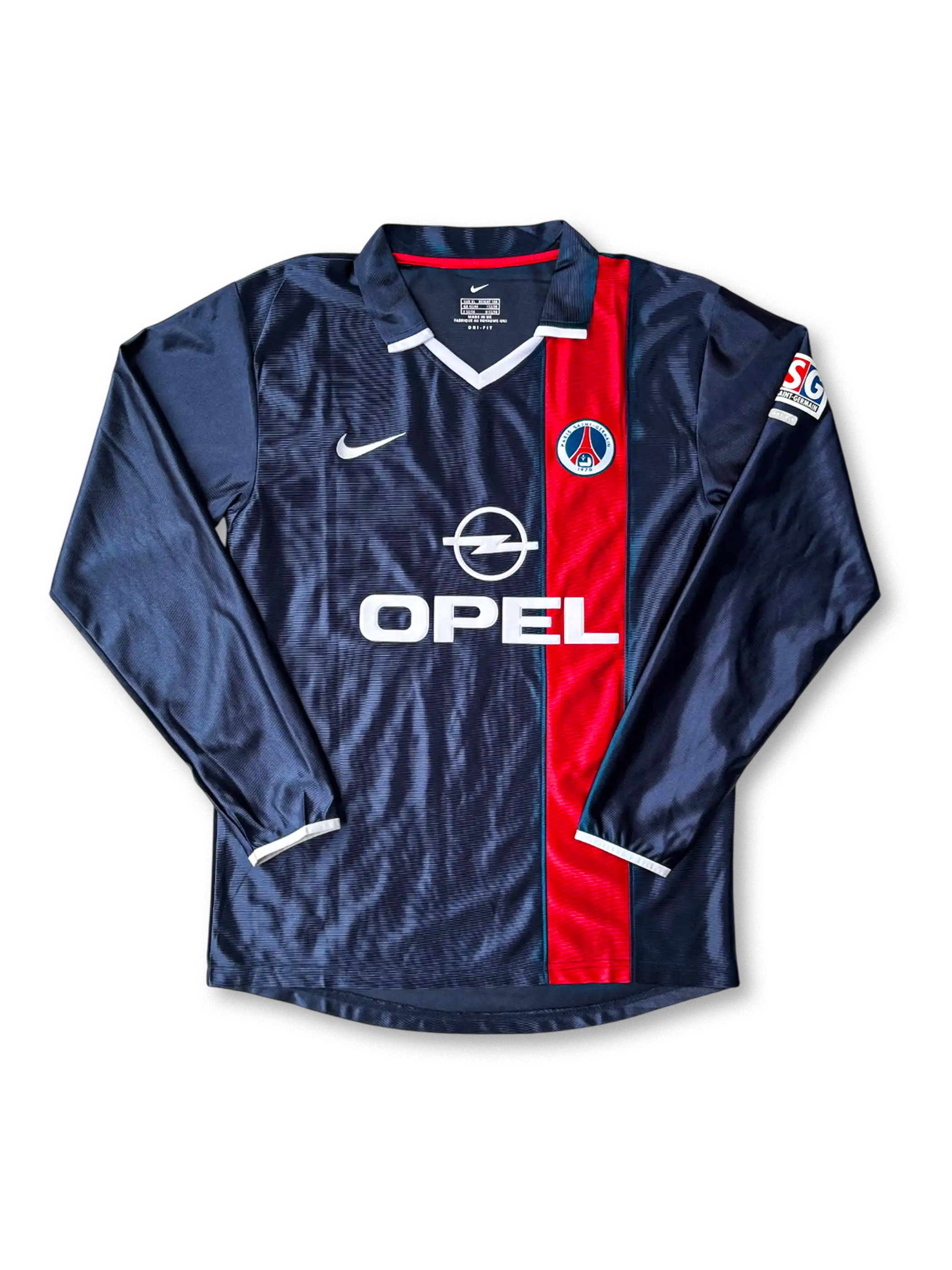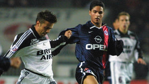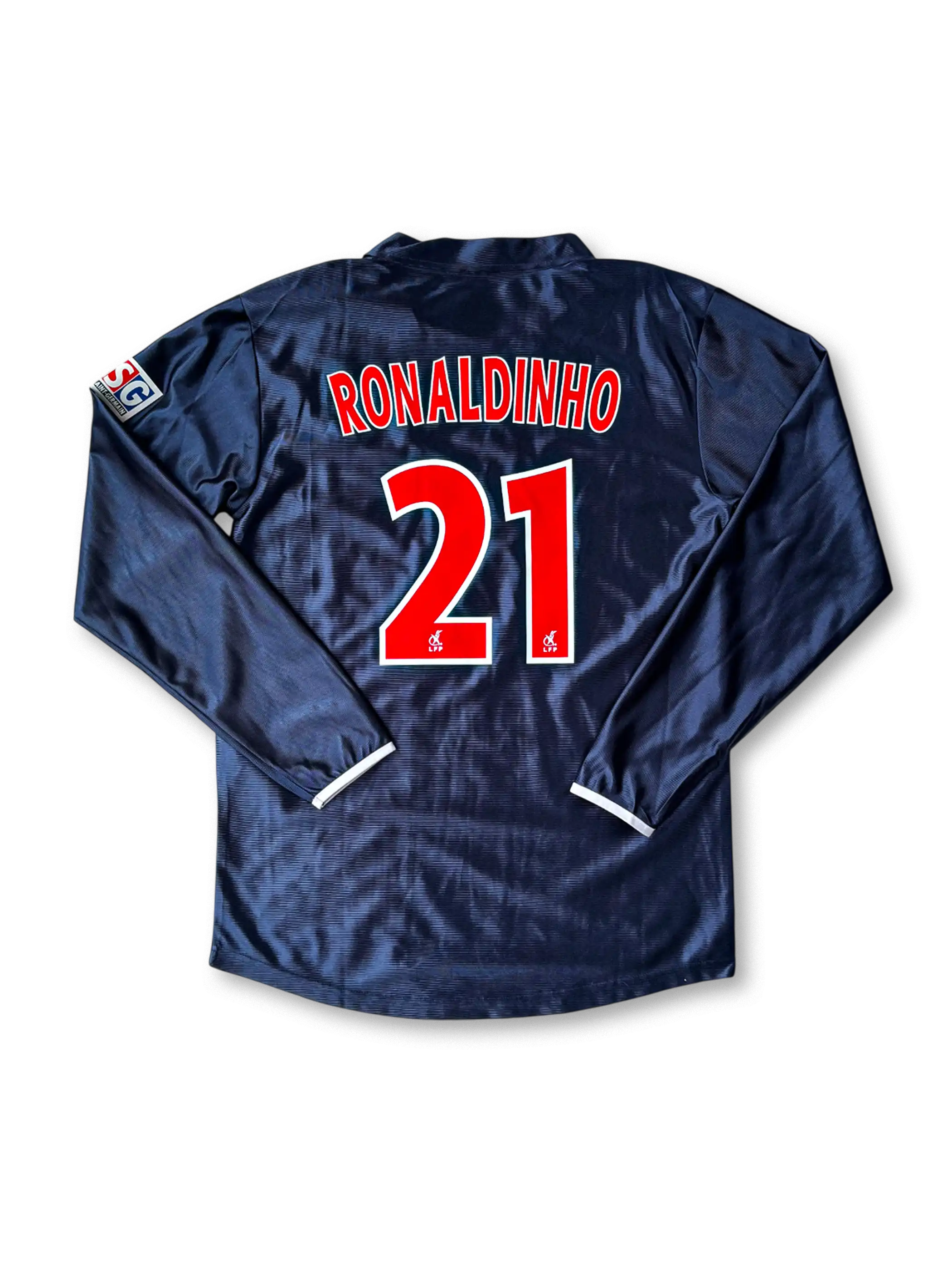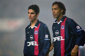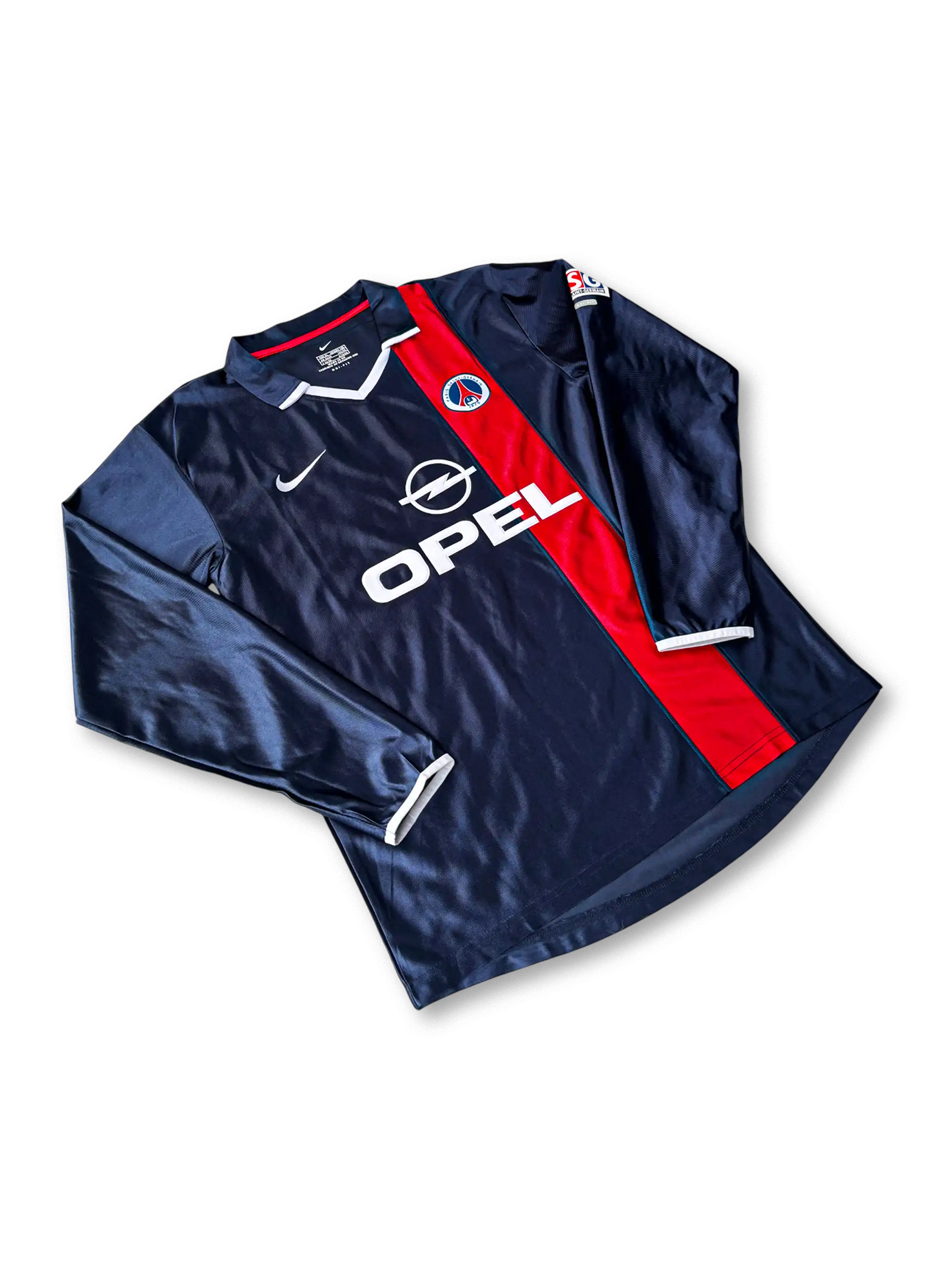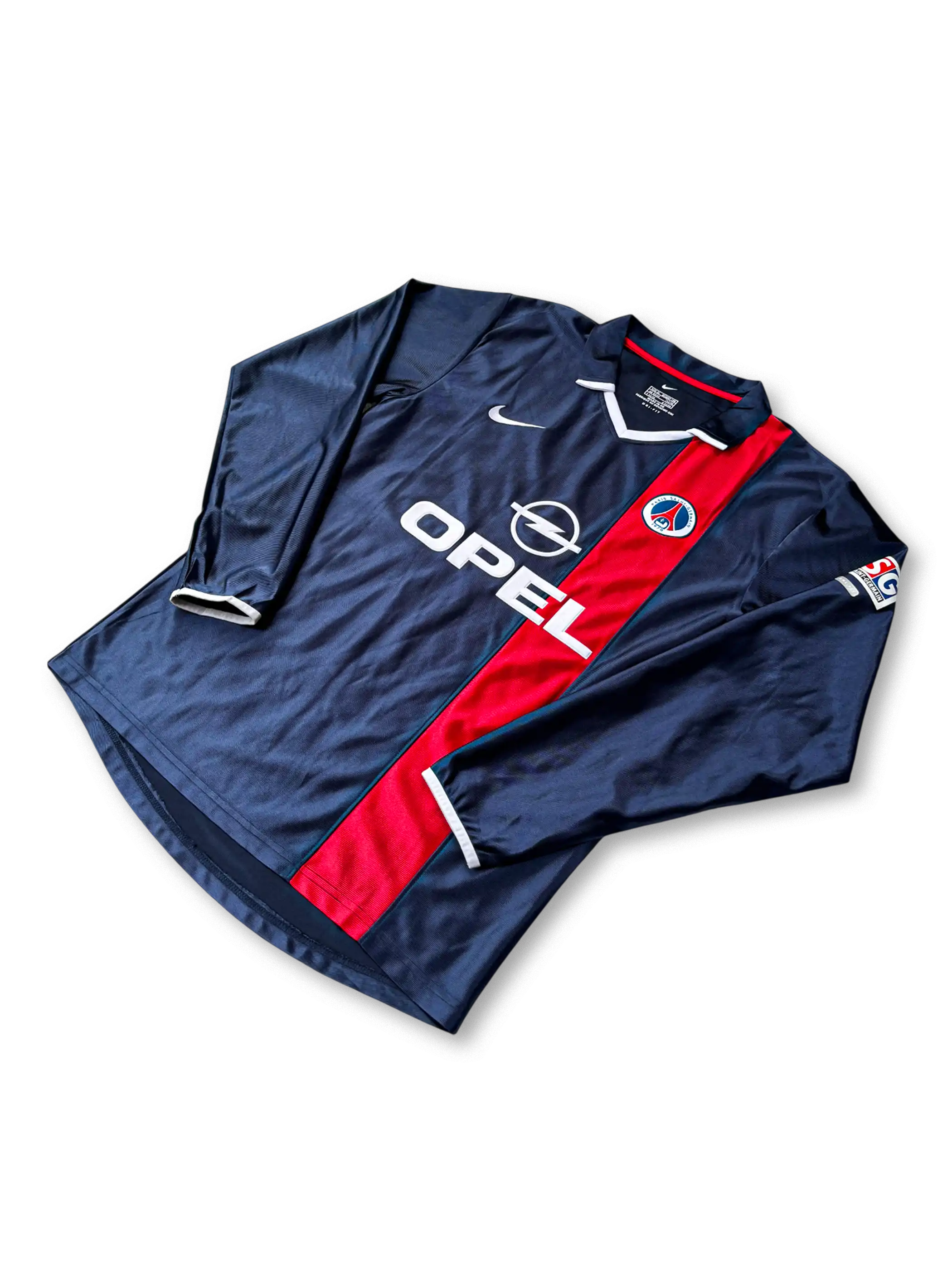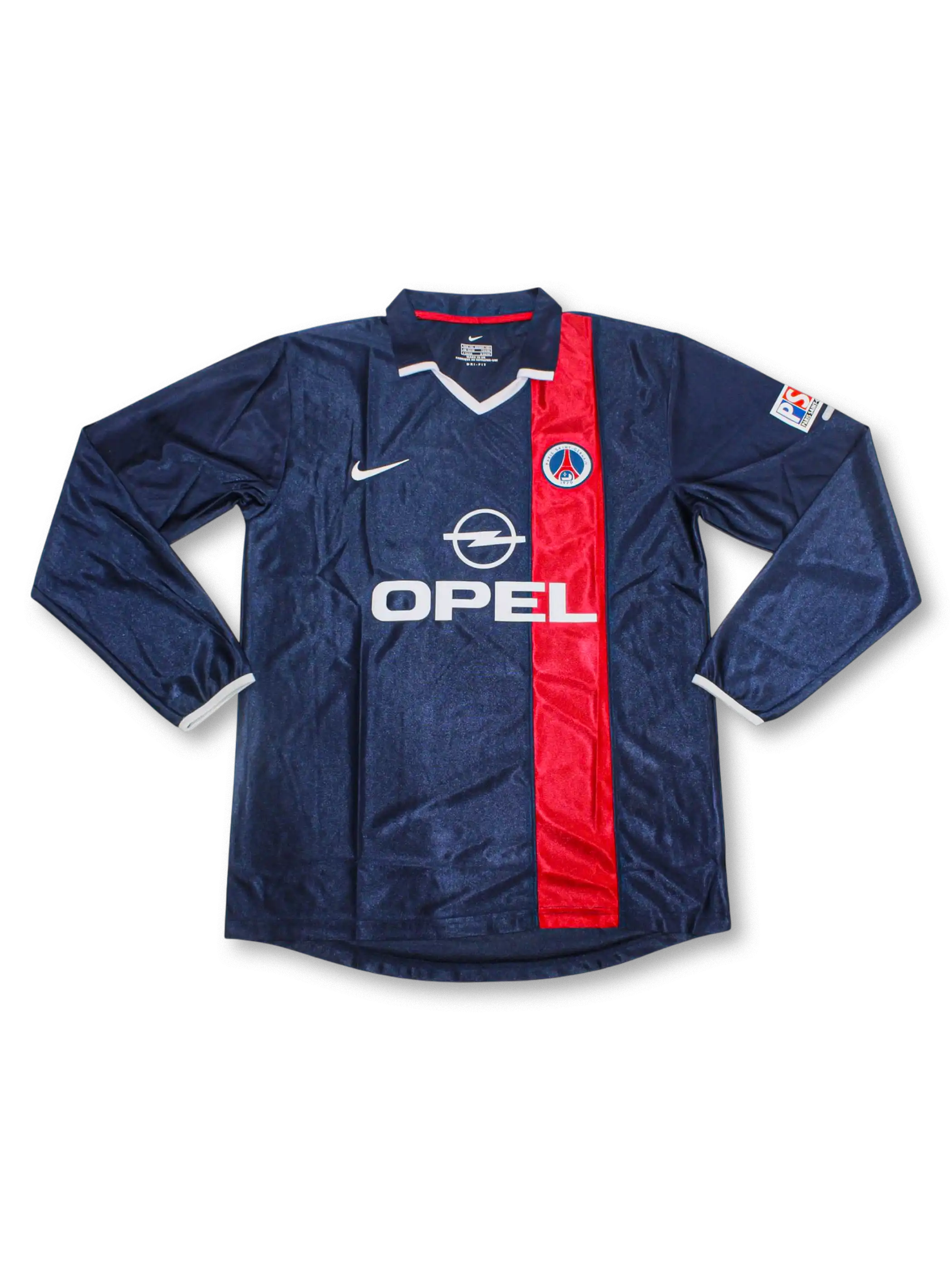 2001-02シーズンのPSGホームユニフォームは、クラブの伝統であるネイビーを基調に、胸を走る赤い縦ラインが特徴。ナイキ製で、スポンサーは当時の「OPEL」。袖にはPSG特有のパッチが刺繍され、クラブのアイデンティティを強く表現。ロナウジーニョがヨーロッパの舞台に登場した記念的なシーズンを象徴する一着であり、コレクターにとって外せないモデル。