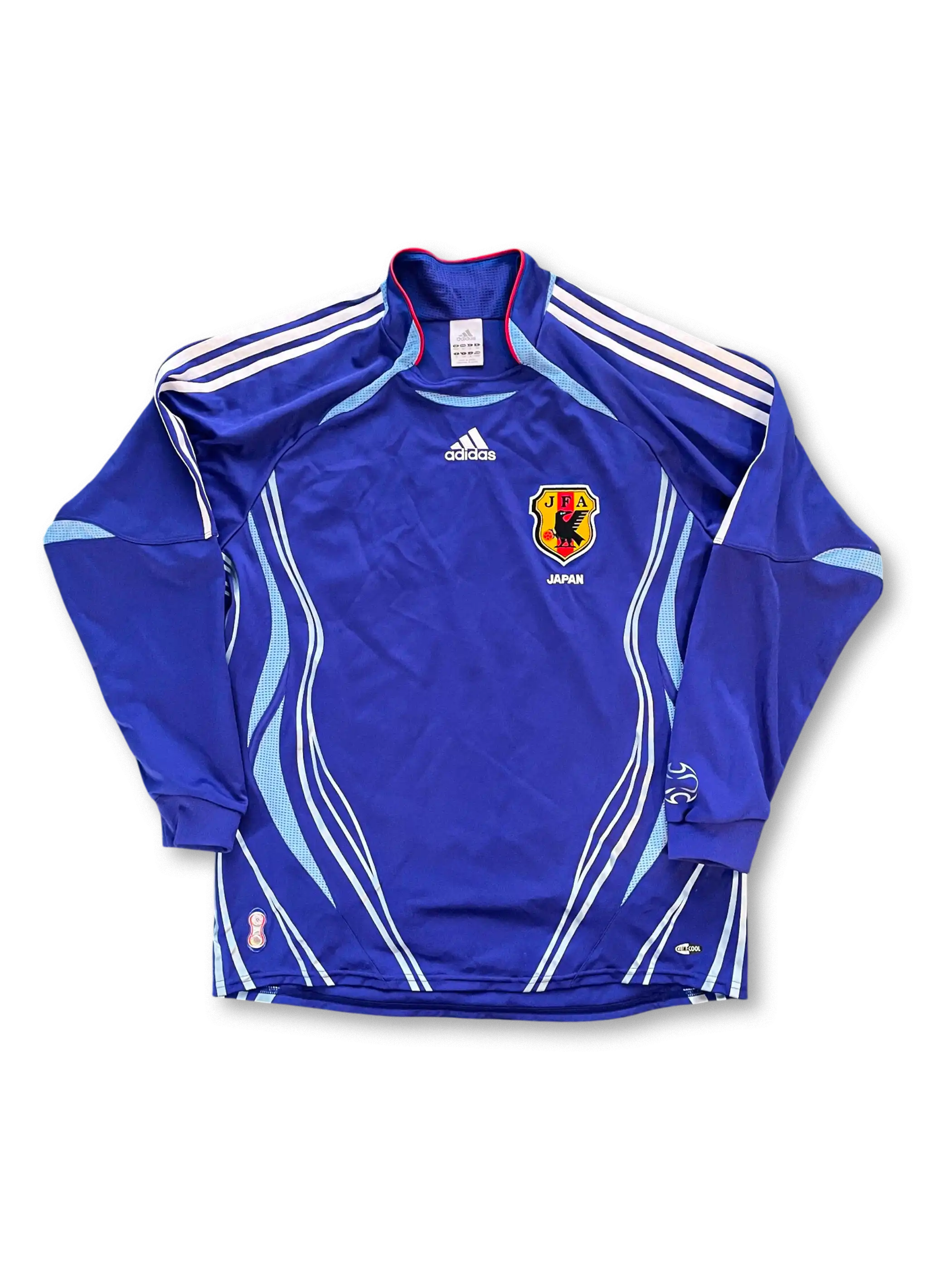 アディダスが手掛けた2006年モデルは、炎をイメージした青のグラフィックを全面に施し、燃える闘志を視覚的に表現したデザイン。胸には誇り高き日本代表エンブレムが輝き、両袖には赤のアクセントが加わる。軽量かつ速乾性のあるClimaCool素材を採用し、選手たちのパフォーマンスを支えた。特に長袖仕様は市場流通が少なく、コレクション性の高い逸品。