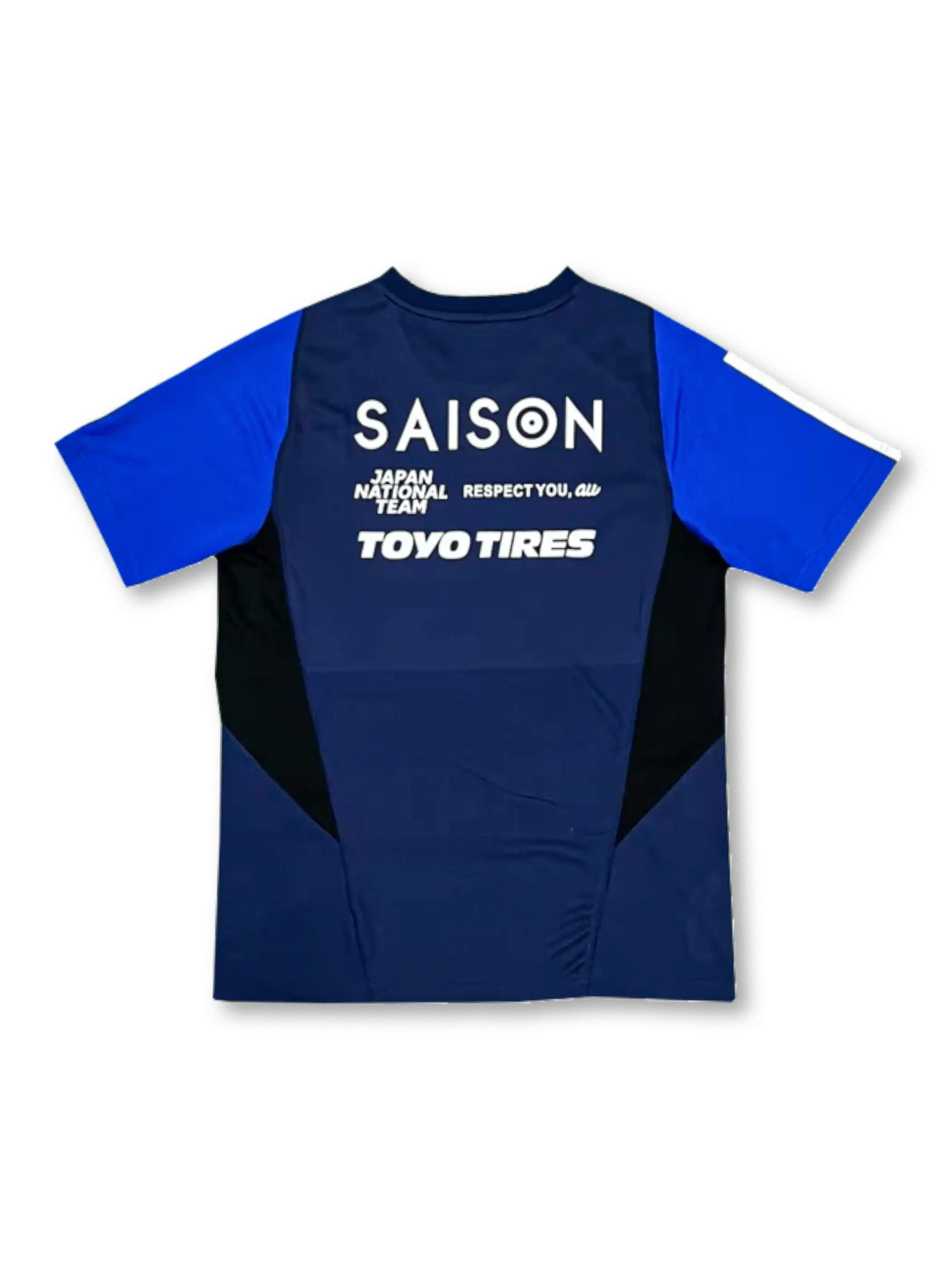 濃紺を基調に袖へ鮮やかなブルーを配置し、肩にスリーストライプを走らせたバイカラー仕様。胸にはKIRINスポンサーとJFAエンブレムを備え、背面にはSAISONやTOYO TIRESなど複数スポンサーが入った実使用に近いデザイン。adidasのAEROREADY素材を使用し、発汗時の快適性を確保。スタジアム観戦や日常着用にも適したファン仕様モデル。