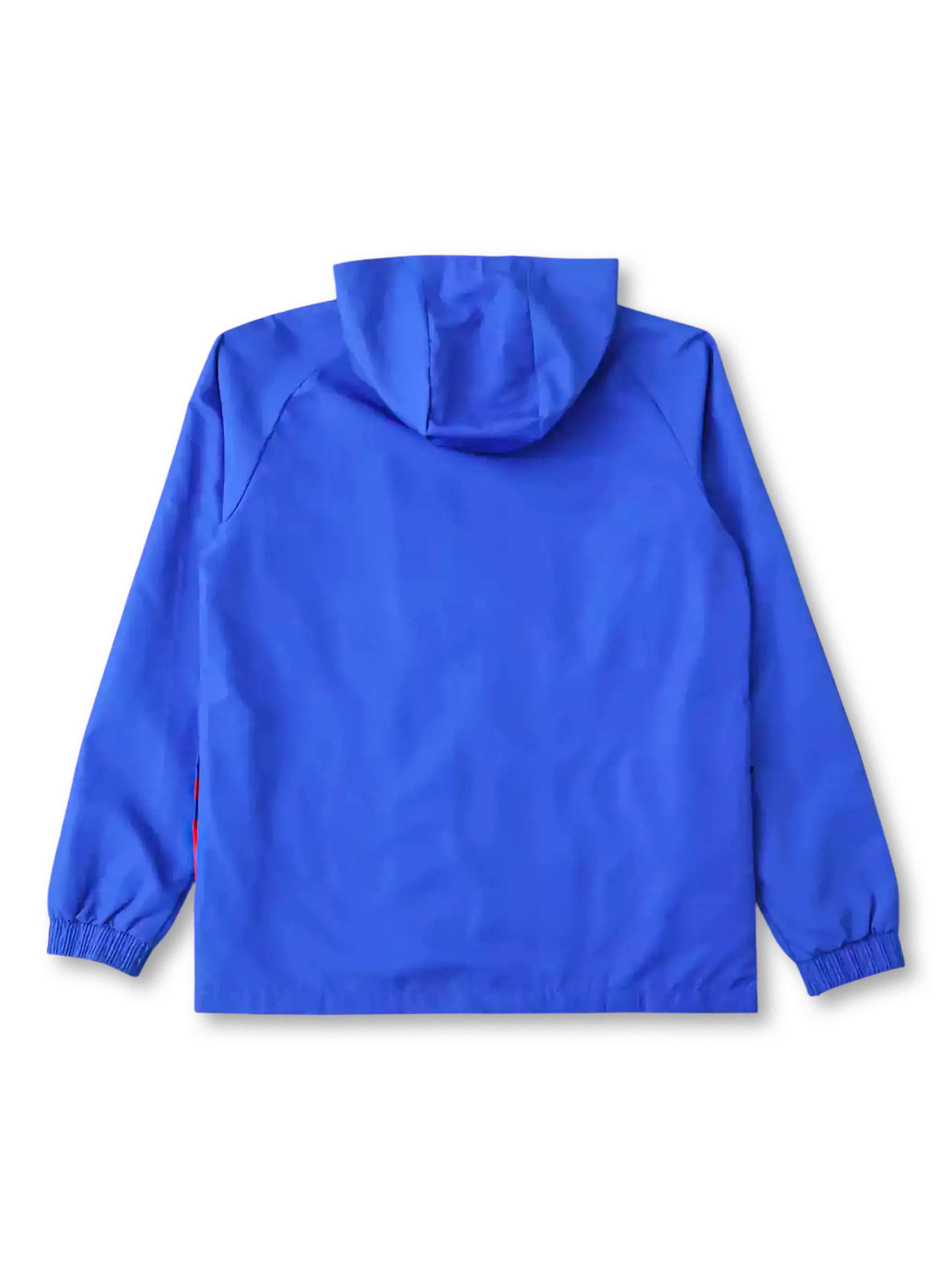 鮮やかなブルーをベースに、レッドの波状パターンがフロントを横断するインパクトのあるデザイン。胸元にはクラブエンブレムとadidasロゴを配し、フード付きで機能性を強化。ポリエステル素材による軽量かつ防風性の高い仕様で、スタジアム観戦や街着としても存在感を放つ。