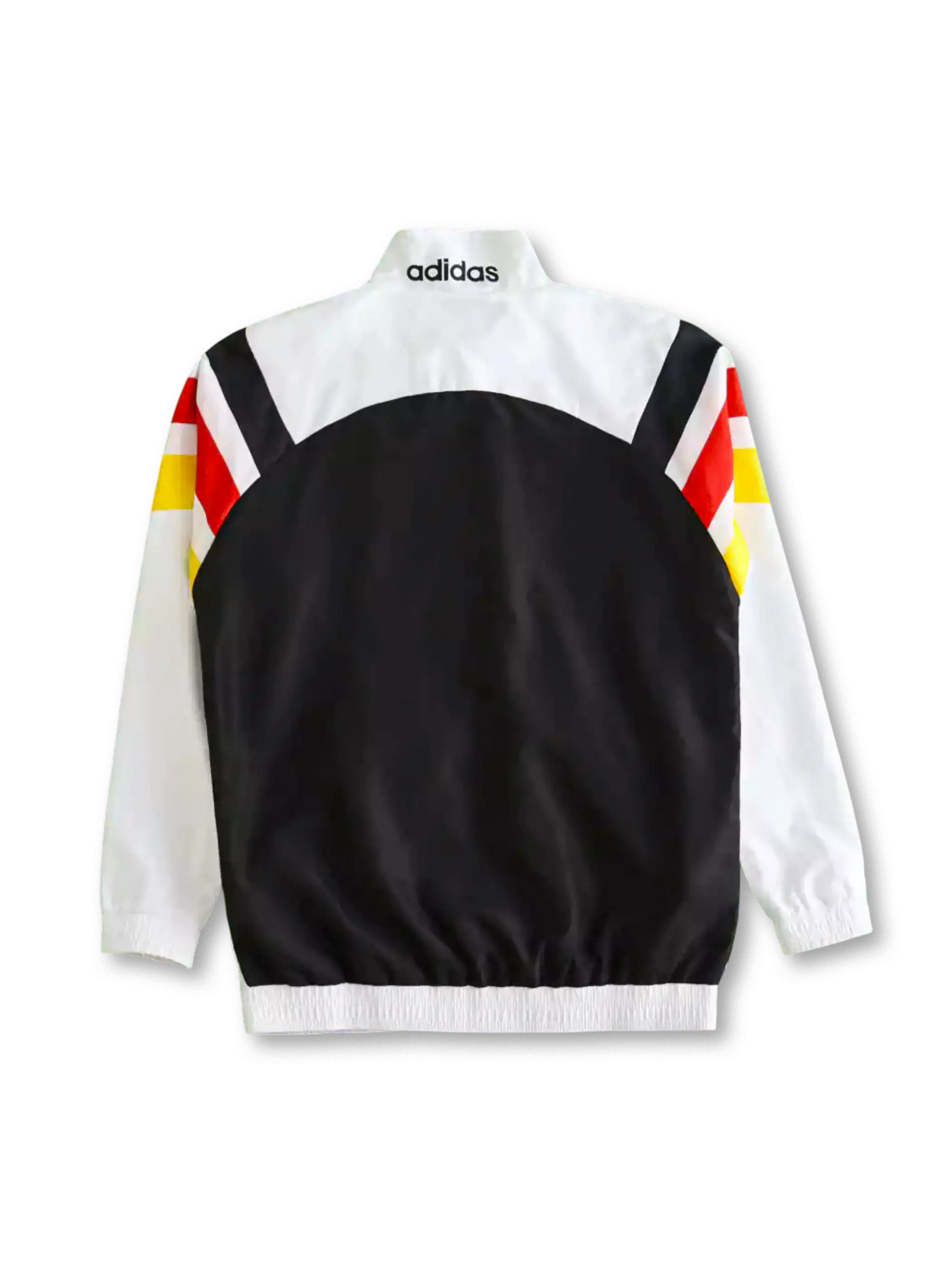 クラシックな黒白ベースに、袖と胸元へドイツ国旗カラーを斜めに配したデザインが印象的なナイロンウィンドブレーカー。アディダス製の刺繍ロゴとチームエンブレムが映える、当時の代表ジャージを忠実に再現した一着。軽量ナイロン素材で春秋の着用に最適で、スポーツシーンからタウンユースまで幅広く活躍。サッカーファンやコレクター必携のアイテム。