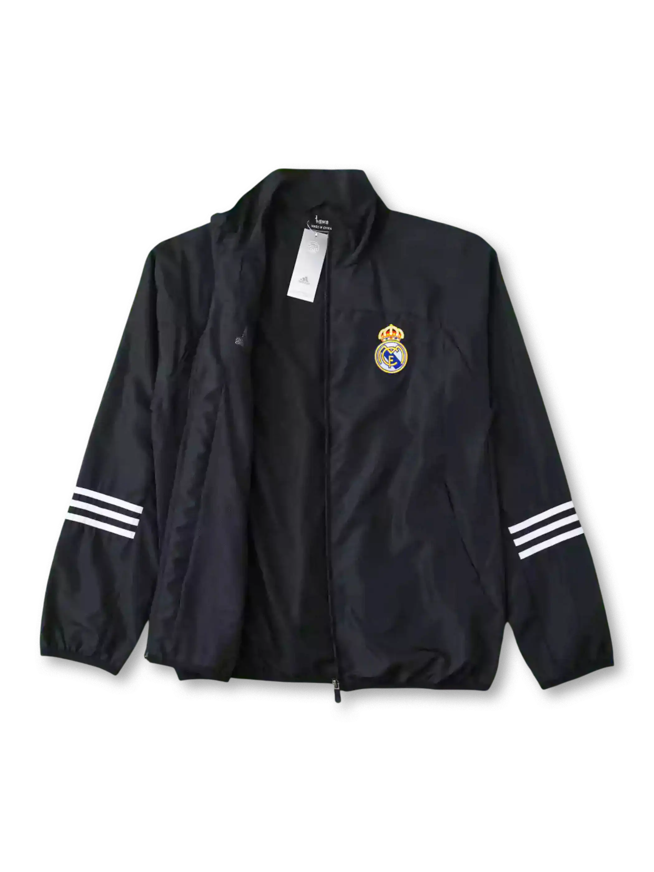 漆黒のボディにホワイトのスリーストライプスが映えるレアル・マドリードクラシックジャケット。