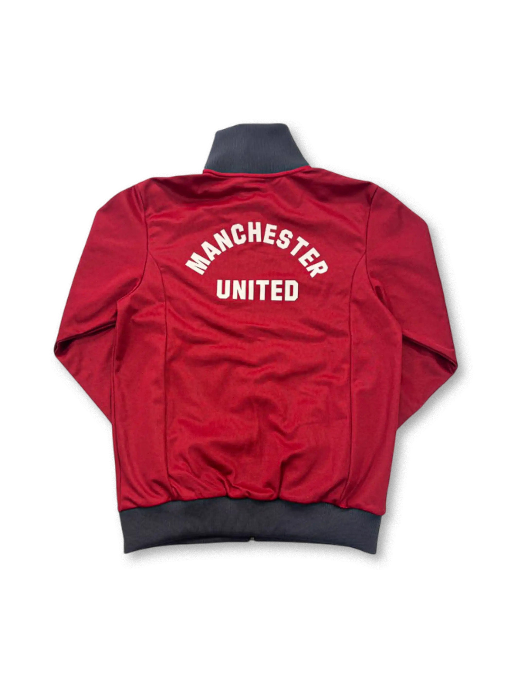 クラシックな赤基調のボディにブラック襟とスリーストライプスを組み合わせた復刻デザイン。胸元にトレフォイルロゴとクラブエンブレム、背面には「MANCHESTER UNITED」のビッグプリントを施す仕様。ポリエステル素材で軽量かつ通気性に優れ、タウンユースからコレクション用途まで幅広く対応する一着。