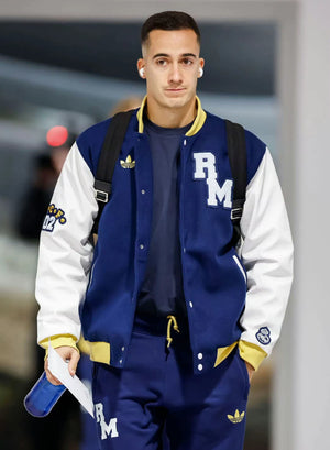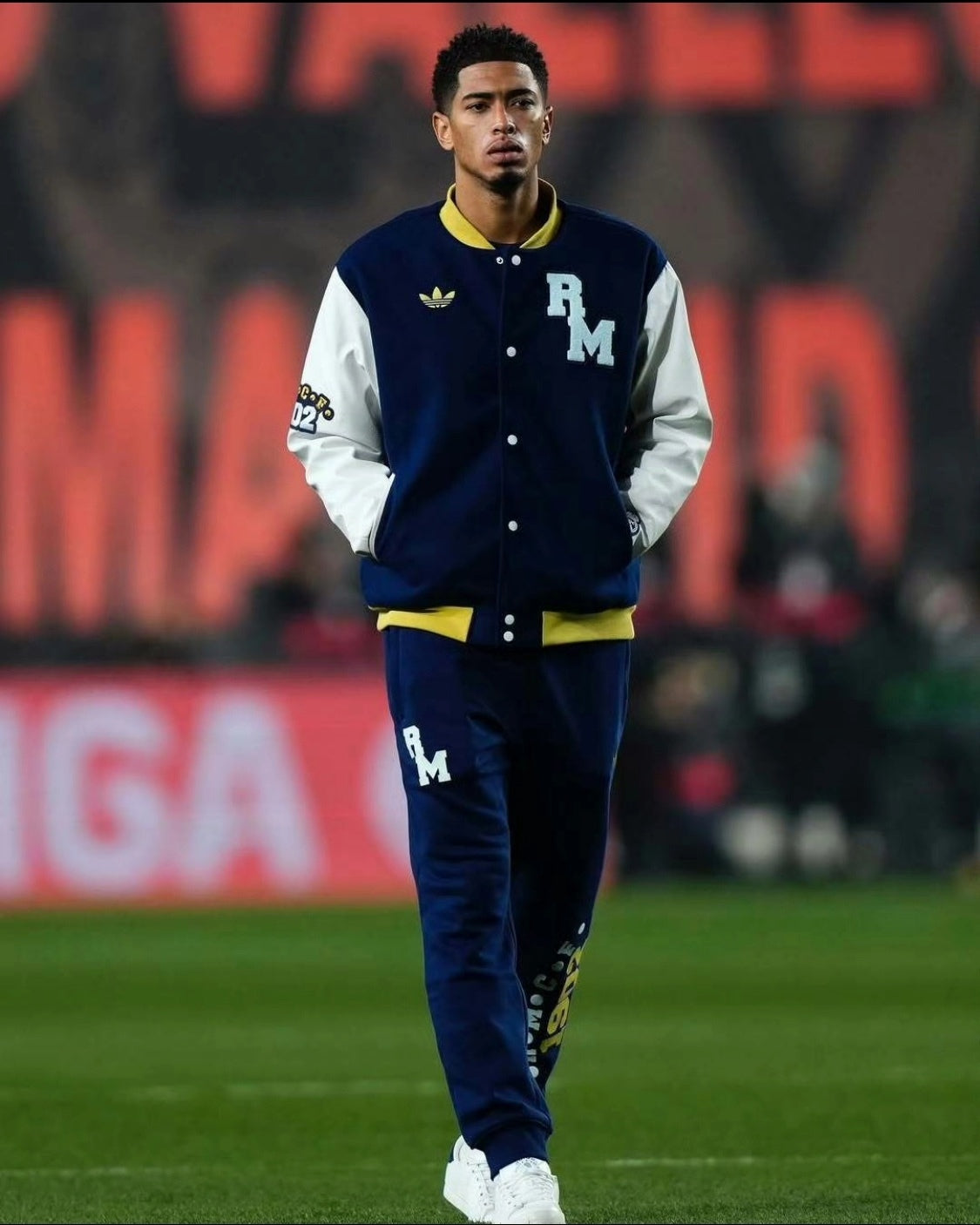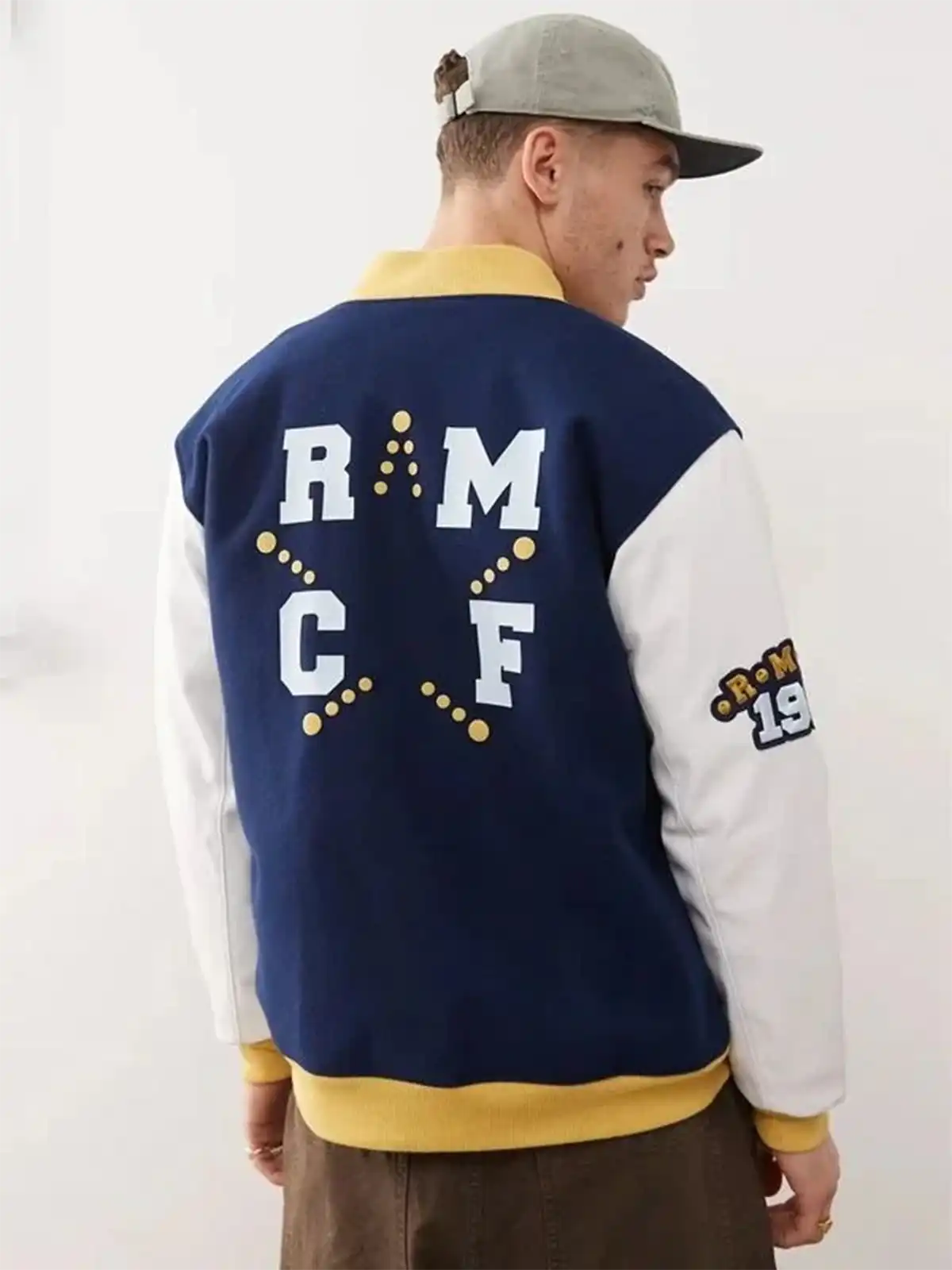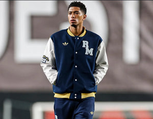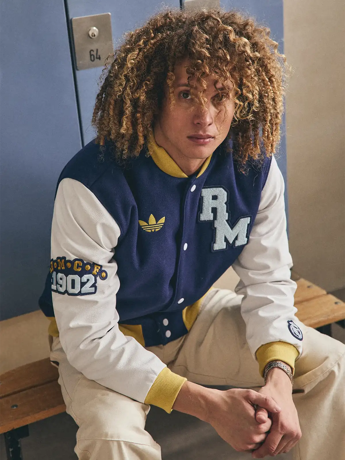 濃紺ボディにホワイトスリーブとイエローの襟・裾リブを合わせたクラシックな配色が特徴。フロントにRMロゴ刺繍、スリーブにクラブエンブレムワッペン、背面にはRMCFの大胆なレターデザインを配置。ポリエステルとコットンを組み合わせたしっかりとした素材感で、adidas Originalsの伝統的VRCTシルエットを踏襲。コレクション性の高い数量限定アイテム。