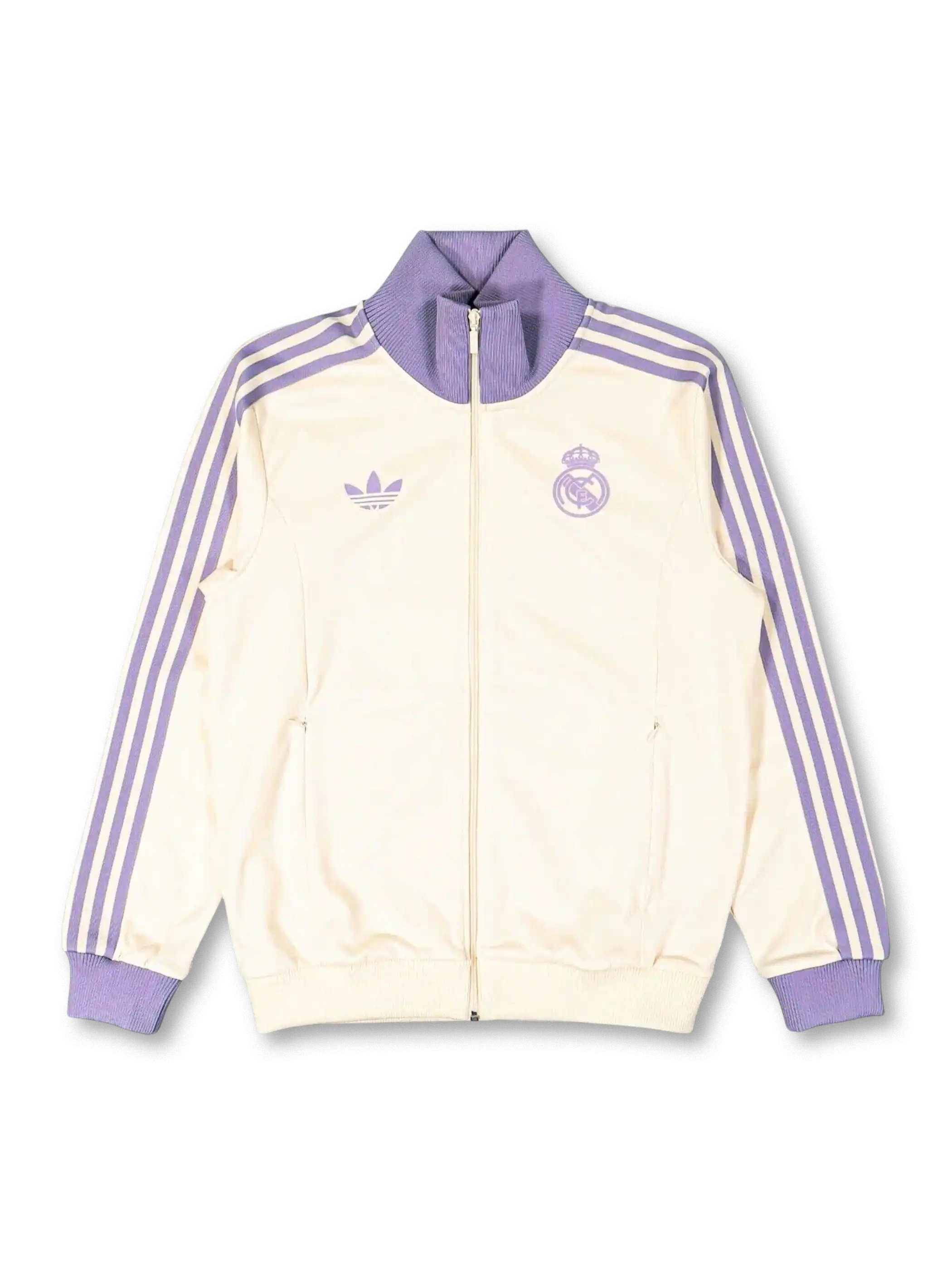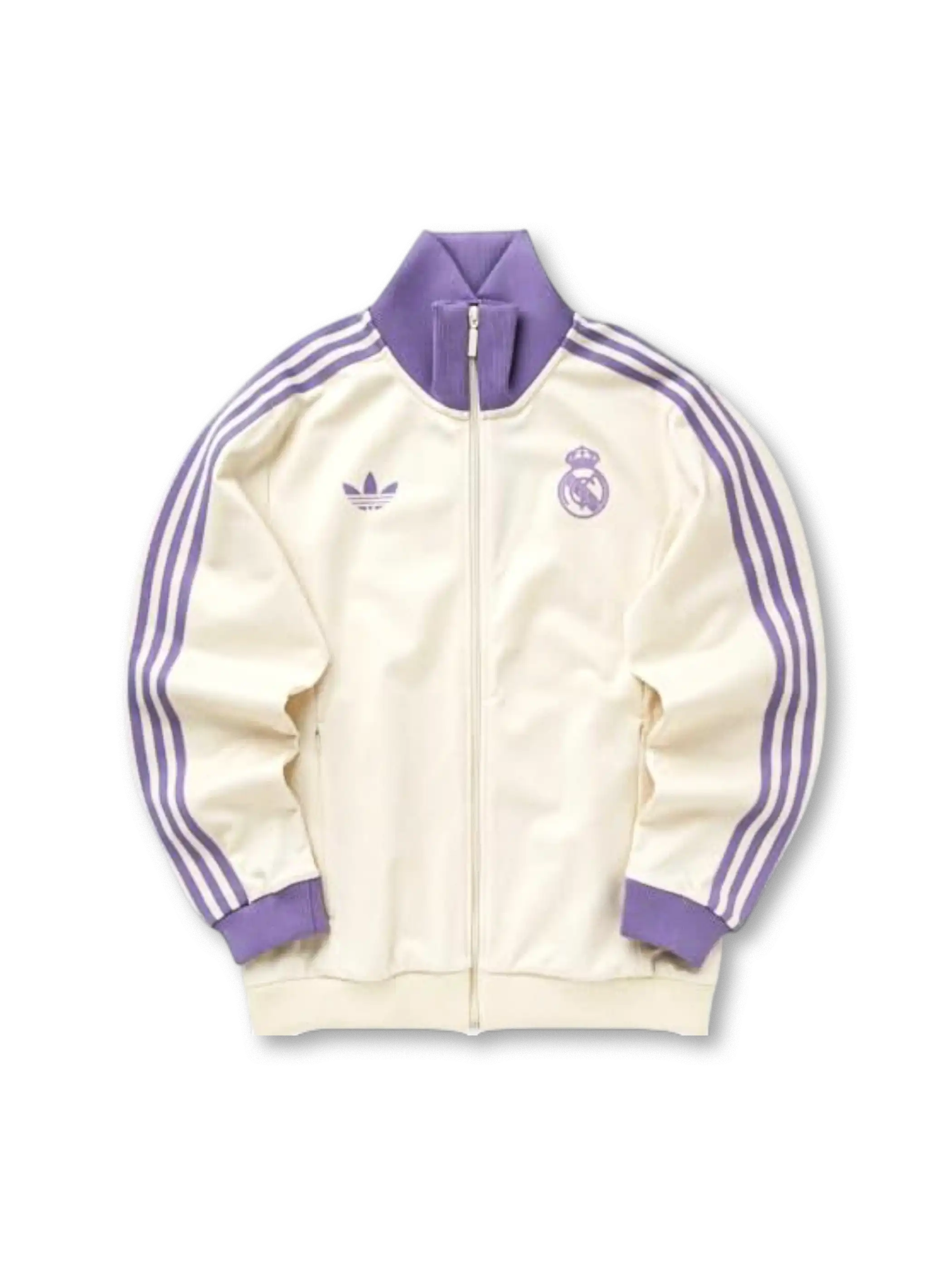 1970〜80年代のトラックトップをベースに、adidas Originalsが現代的に再構築。ジャケットはクリームホワイトを基調にパープルの襟と袖口を配し、胸にはトレフォイルロゴとクラブエンブレム刺繍を配置。パンツは艶感のあるパープルボディに3ストライプを走らせたレトロデザイン。素材は滑らかなトリコット生地で、ヴィンテージスタイルながら着心地も軽やか。ファッション性とクラブヒストリーを兼ね備えた一着。
