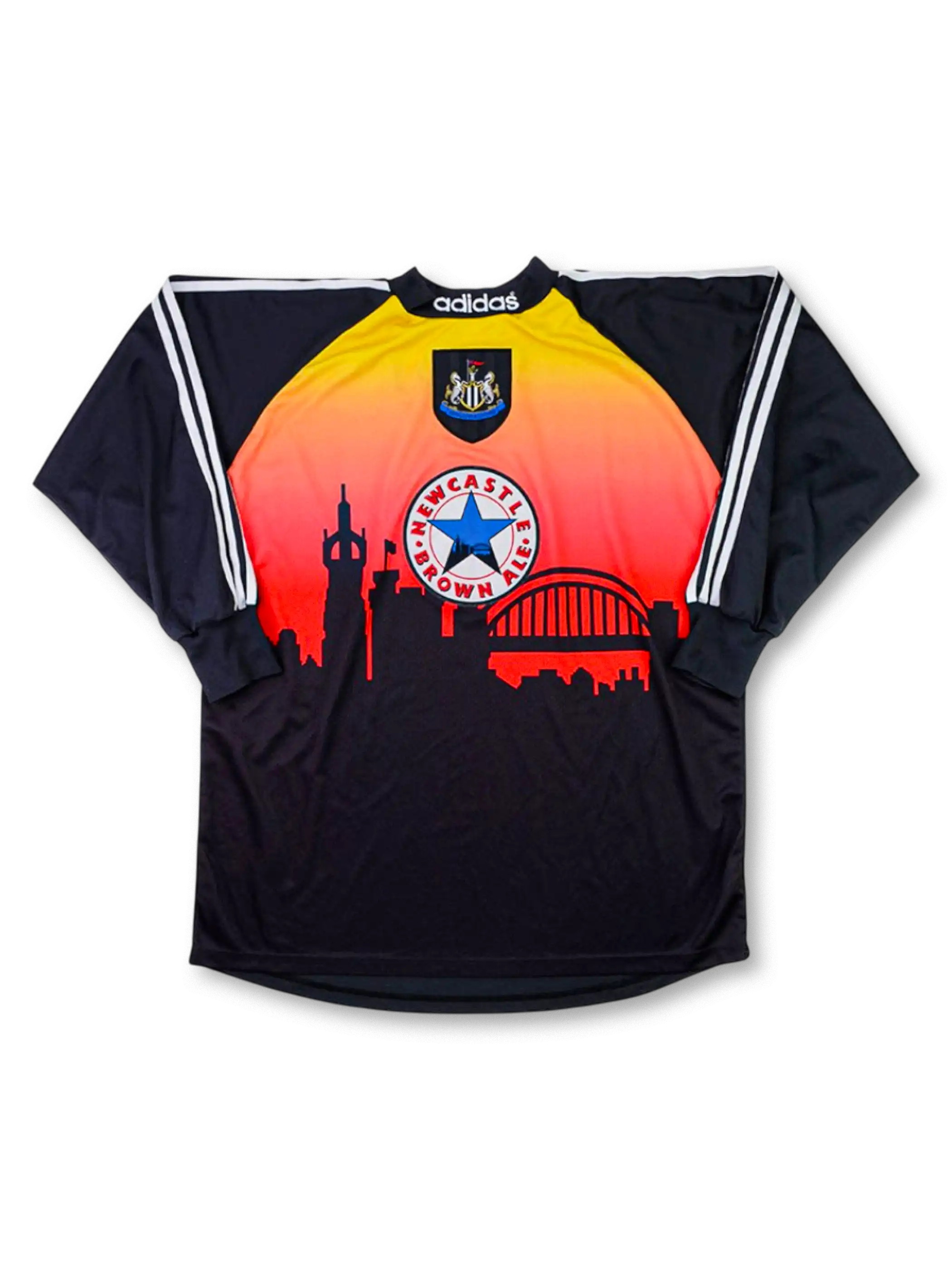 プレミアリーグ90年代を代表するデザイン性の高いGKユニフォーム。ブラックとレッド〜オレンジのグラデーションが織りなす空の色を背景に、ニューカッスルのスカイラインが大胆に描かれた一着。胸には象徴的な「NEWCASTLE BROWN ALE」ロゴを配置。adidasのスリーストライプとクラブクレストのコントラストが際立ち、スタジアムの夕景をそのままユニフォームに落とし込んだかのようなデザインとなっている。長袖仕様の重厚なシルエットは当時のGKモデルらしく、今でもヴィンテージ市場で非常に人気の高い名作。