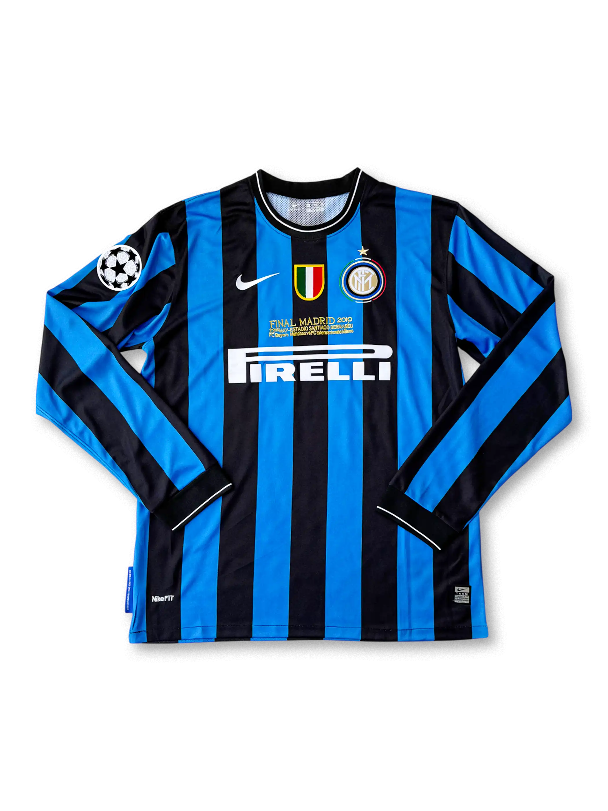 インテル伝統の青黒ストライプを基調に、胸には「FINAL MADRID 2010」刺繍を施した特別仕様。左袖にCLスター・ボールパッチ、中央にはスクデットバッジとPirelliロゴを配置。キャプテン・サネッティがチャンピオンズリーグ決勝で着用した同仕様デザインで、NIKE製Dri-FIT素材を採用。トレブル(リーグ・カップ・欧州制覇)を象徴する歴史的価値の高い一着。