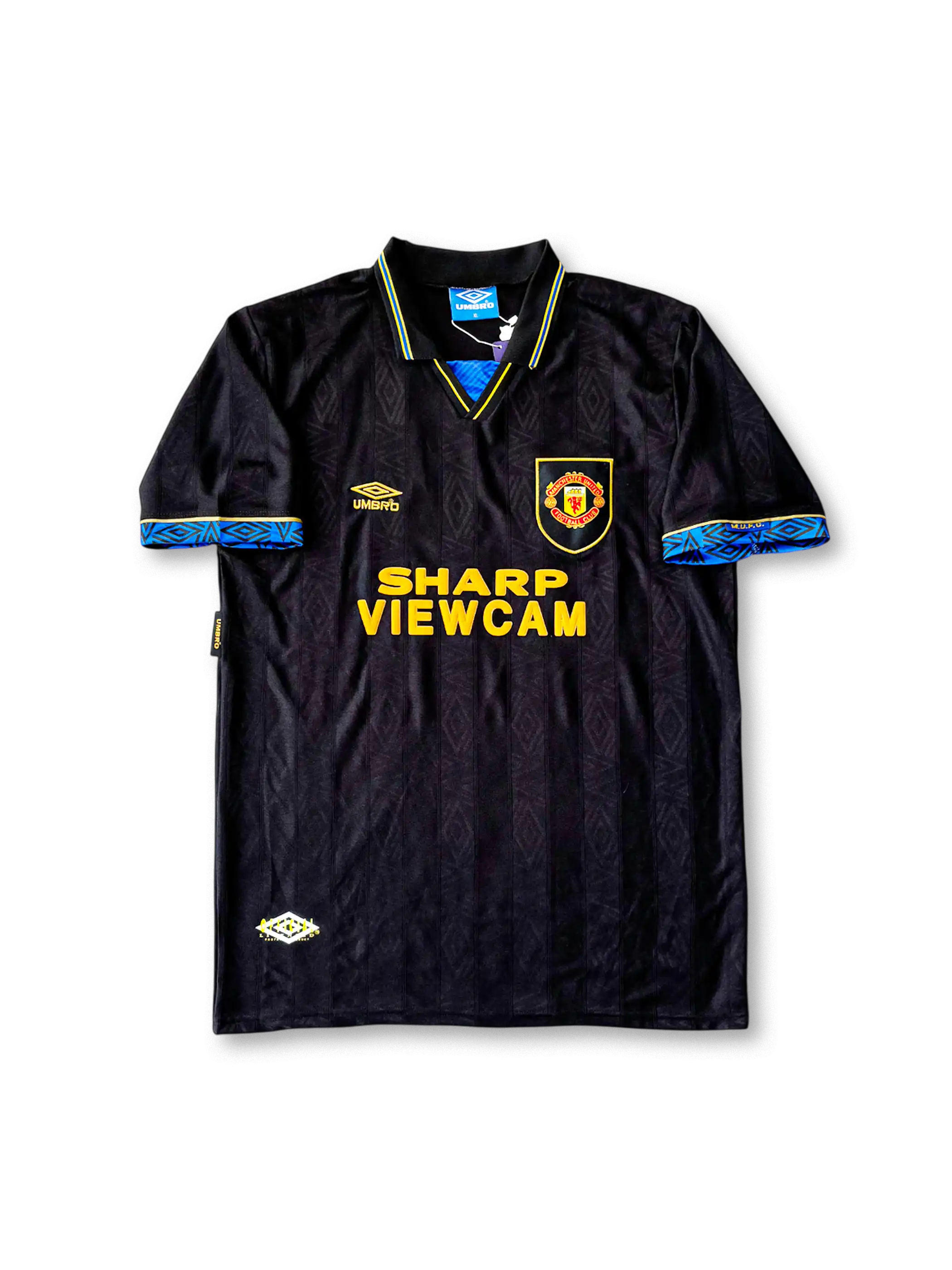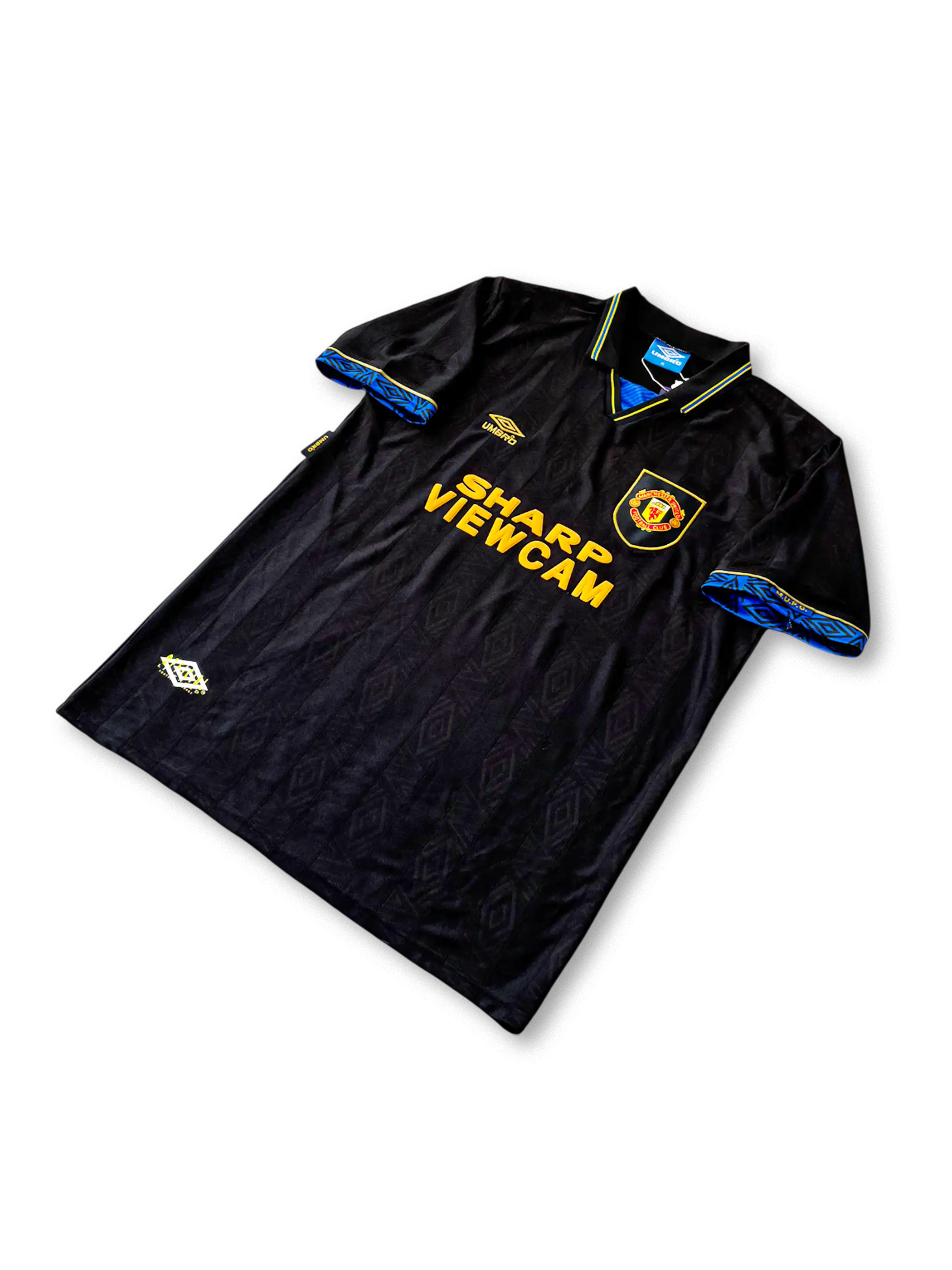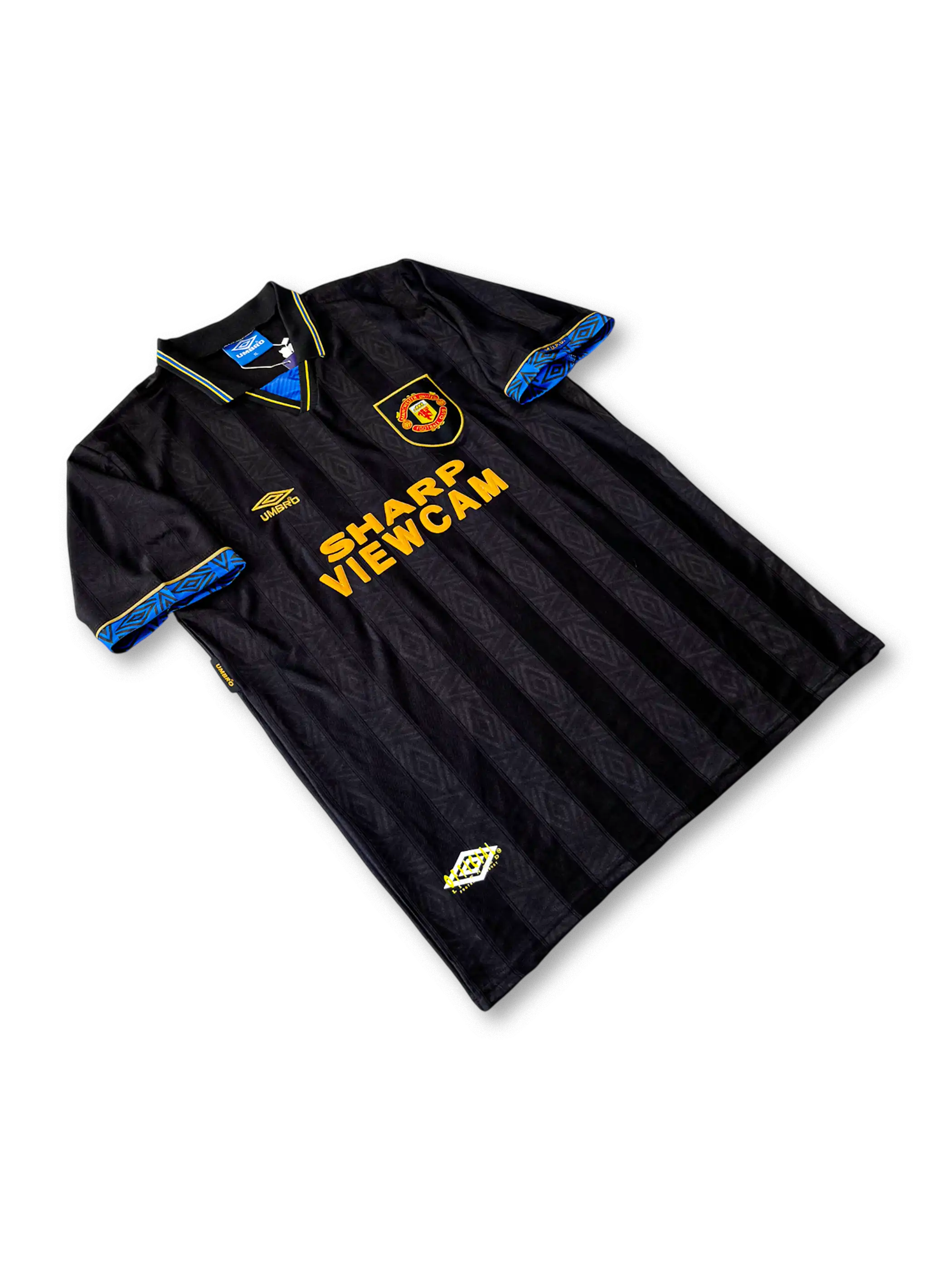 光沢のあるブラック生地に、袖口と襟にブルーの幾何学パターンを配したスタイリッシュなデザイン。胸スポンサー「SHARP VIEWCAM」ロゴとUMBROのイエロー刺繍が強いコントラストを生む。襟付きクラシック仕様で、1990年代初期のプレミアリーグ黄金期を象徴。エリック・カントナが背番号7として着用し、クラブの新時代を築いたモデル。現在でも“黒のユナイテッド”としてコレクター人気が極めて高い。