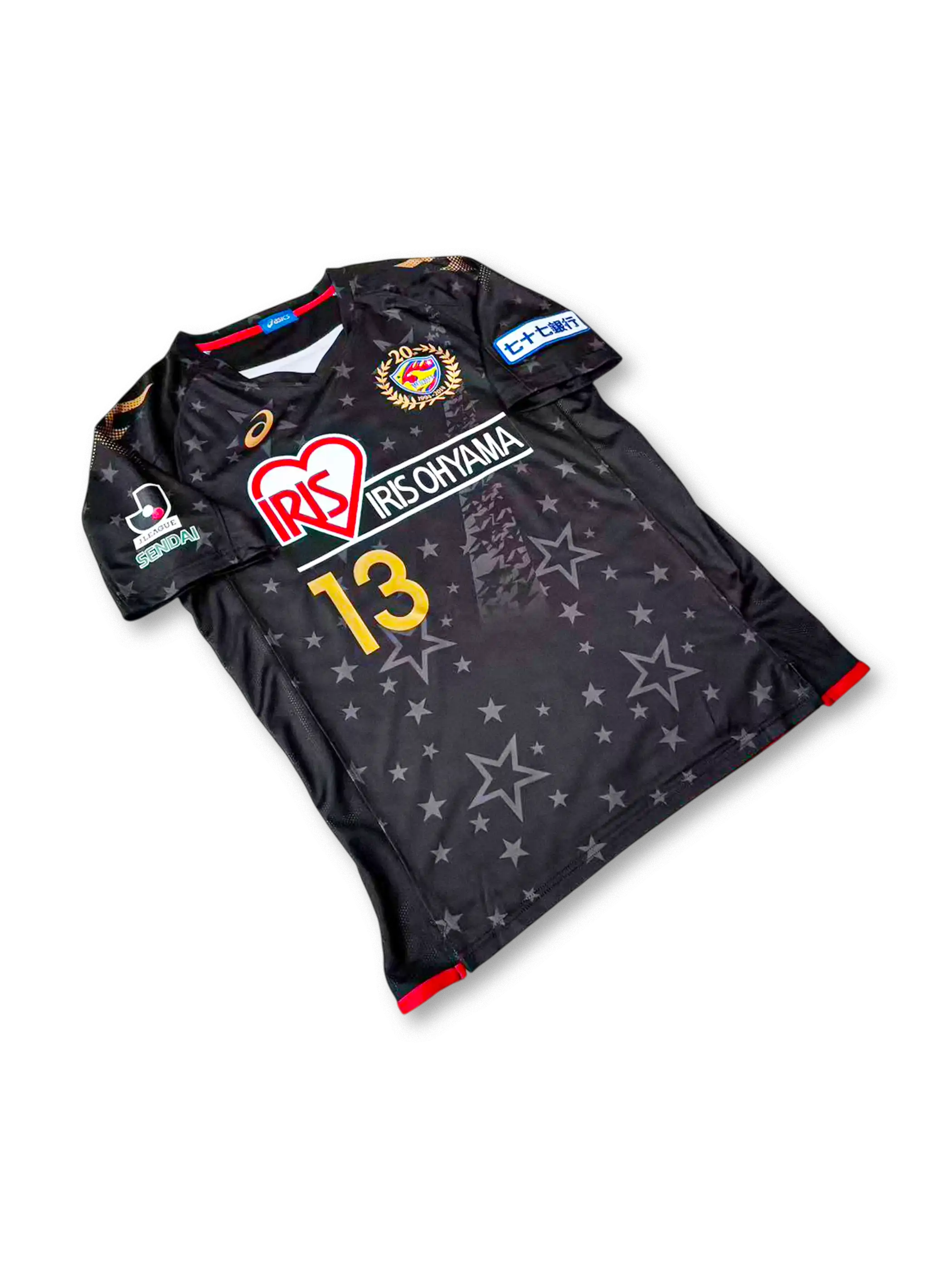 ベガルタ仙台の伝統的イベント「仙台七夕まつり」をテーマに、星をモチーフにしたパターンを全体にちりばめた特別デザイン。クラブ20周年を記念する月桂冠入りエンブレムを採用し、胸にはIRIS OHYAMAロゴ、背面にはやまやロゴを配置。アシックス製の高通気性素材を使用し、軽量かつ伸縮性に優れた仕上がりで、ブラック×ゴールドの配色が印象的な一着。