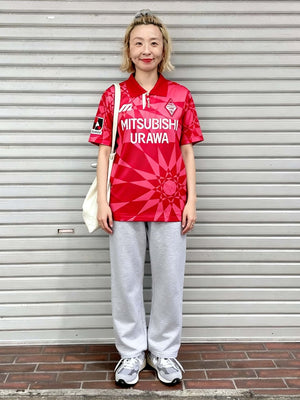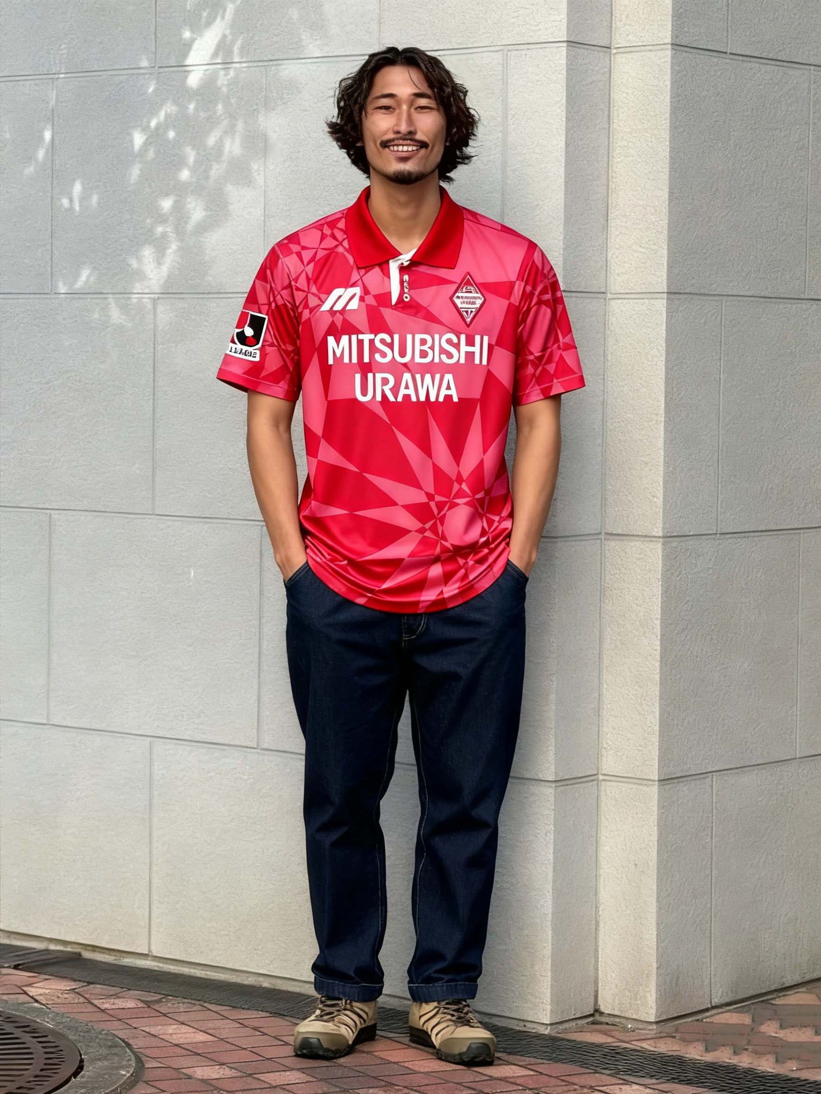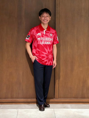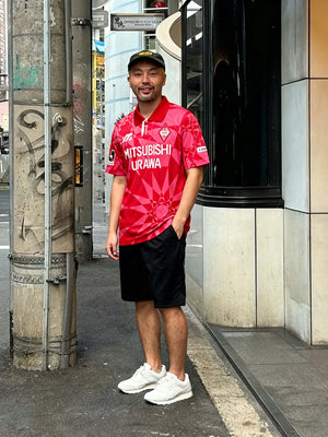 三菱URAWAのロゴと赤の幾何学パターンが特徴で、日本サッカー新時代の象徴的デザインとして知られる。当時のMizuno製特有の光沢ポリエステル生地を使用し、背面の刺繍ワッペンや襟付きフォルムなど、90年代らしいクラシックなディテールが再現されている。Jリーグ元年を物語る歴史的価値の高い1着。