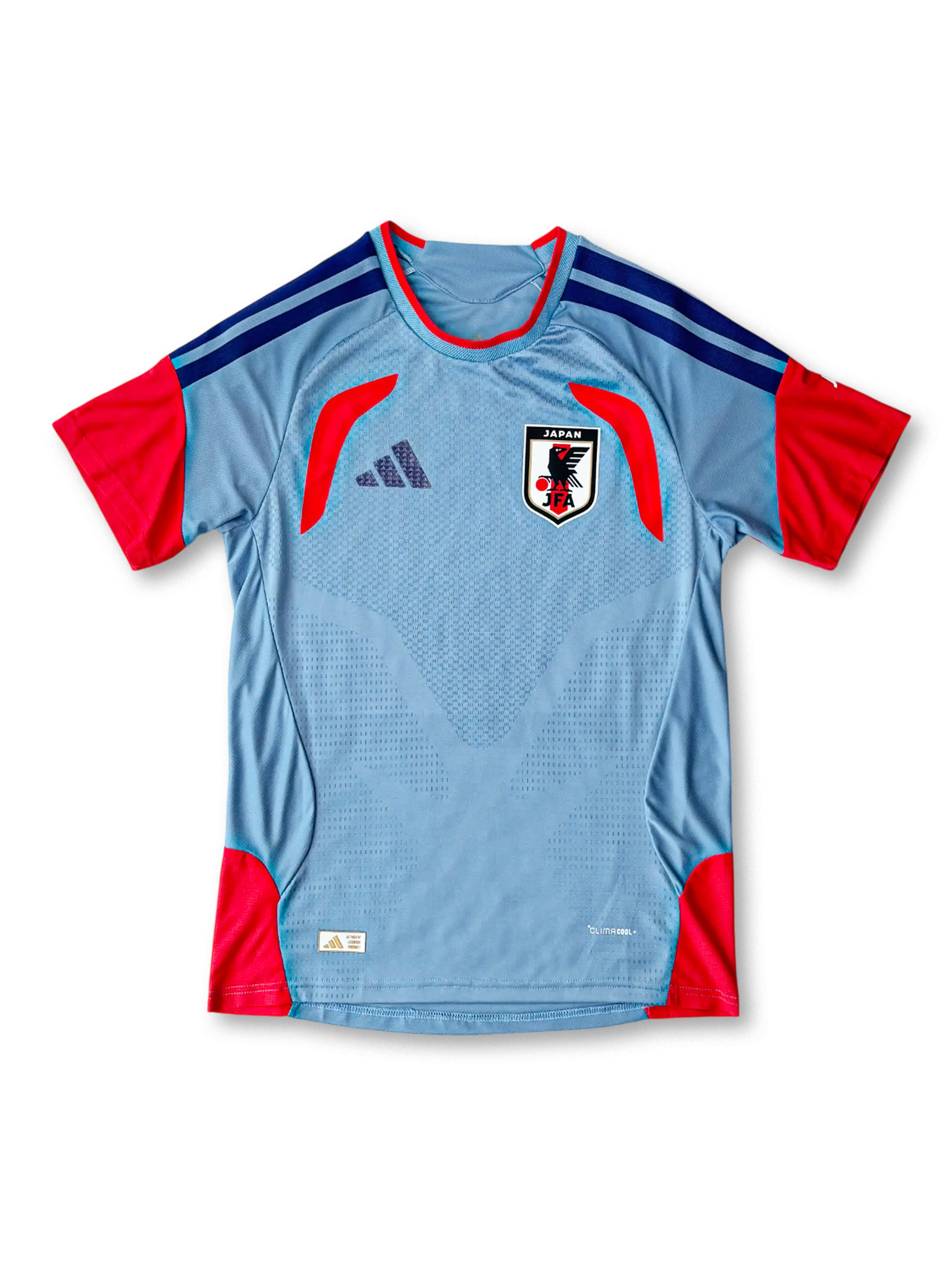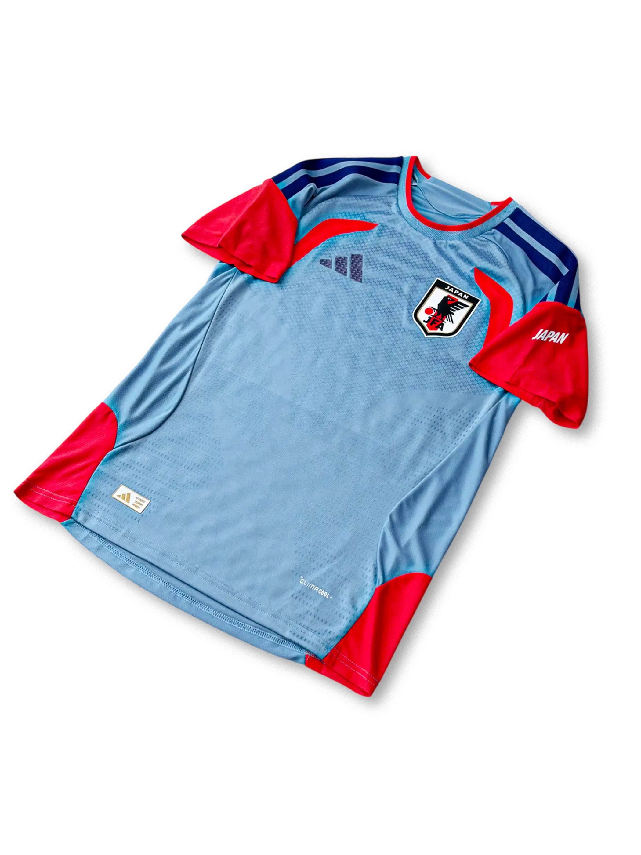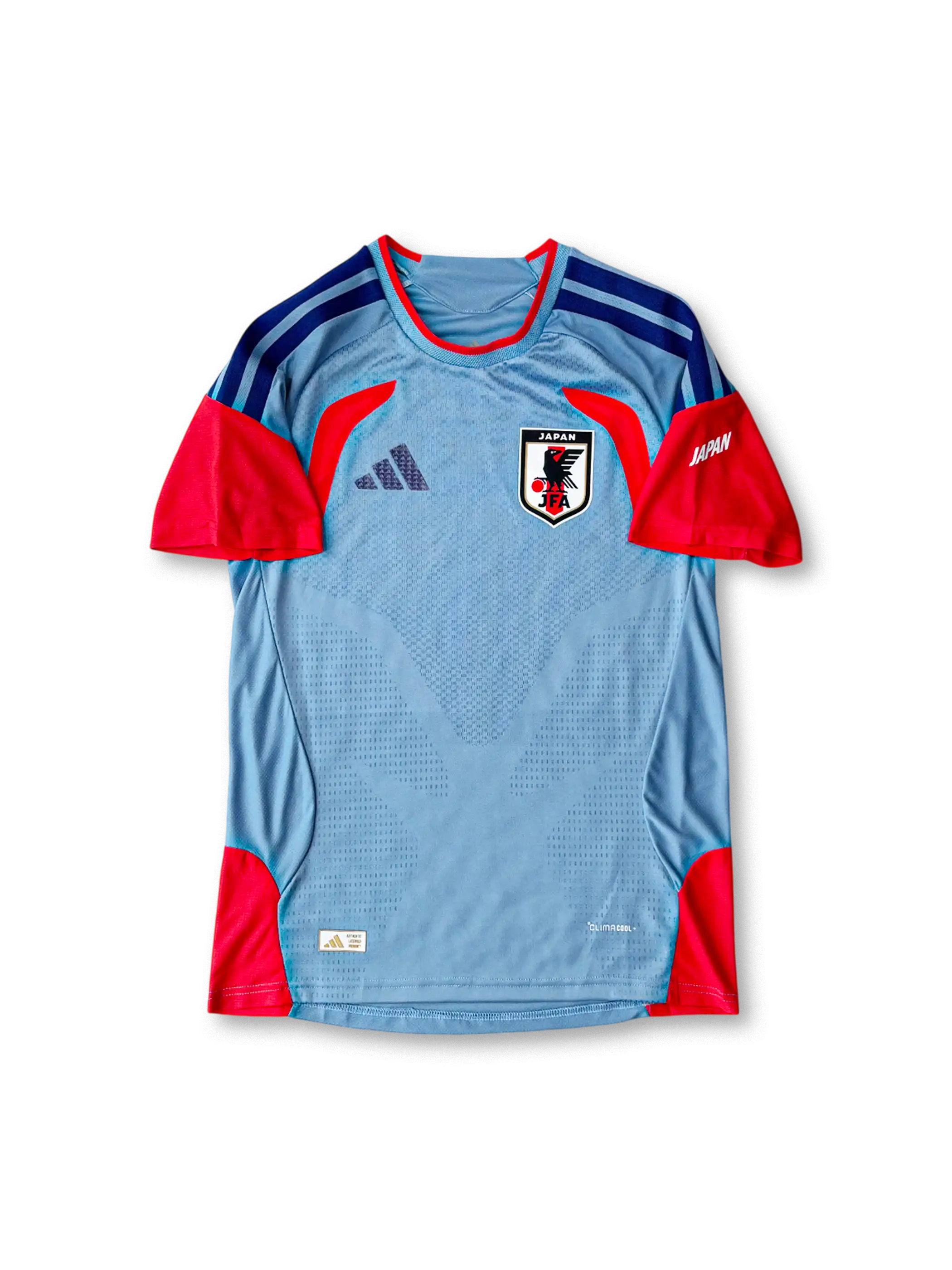 淡いスカイブルーを基調に、袖とサイドにビビッドなレッドオレンジを配した新世代デザイン。肩には3本線のディープブルーを配置し、軽量で通気性の高いAEROREADY素材を採用。胸部のJFAエンブレムが象徴的で、トレーニング用ながらスタジアムでも映える完成度を誇る。