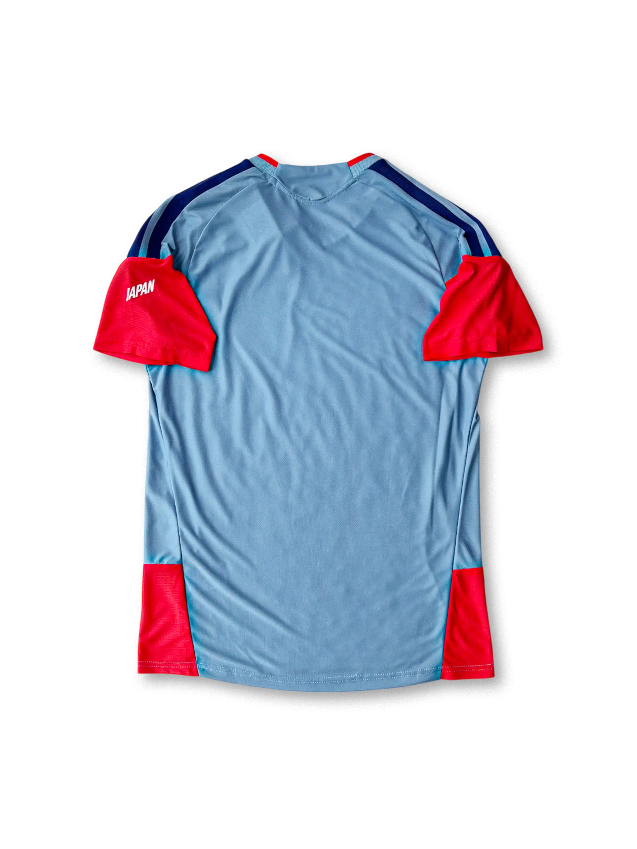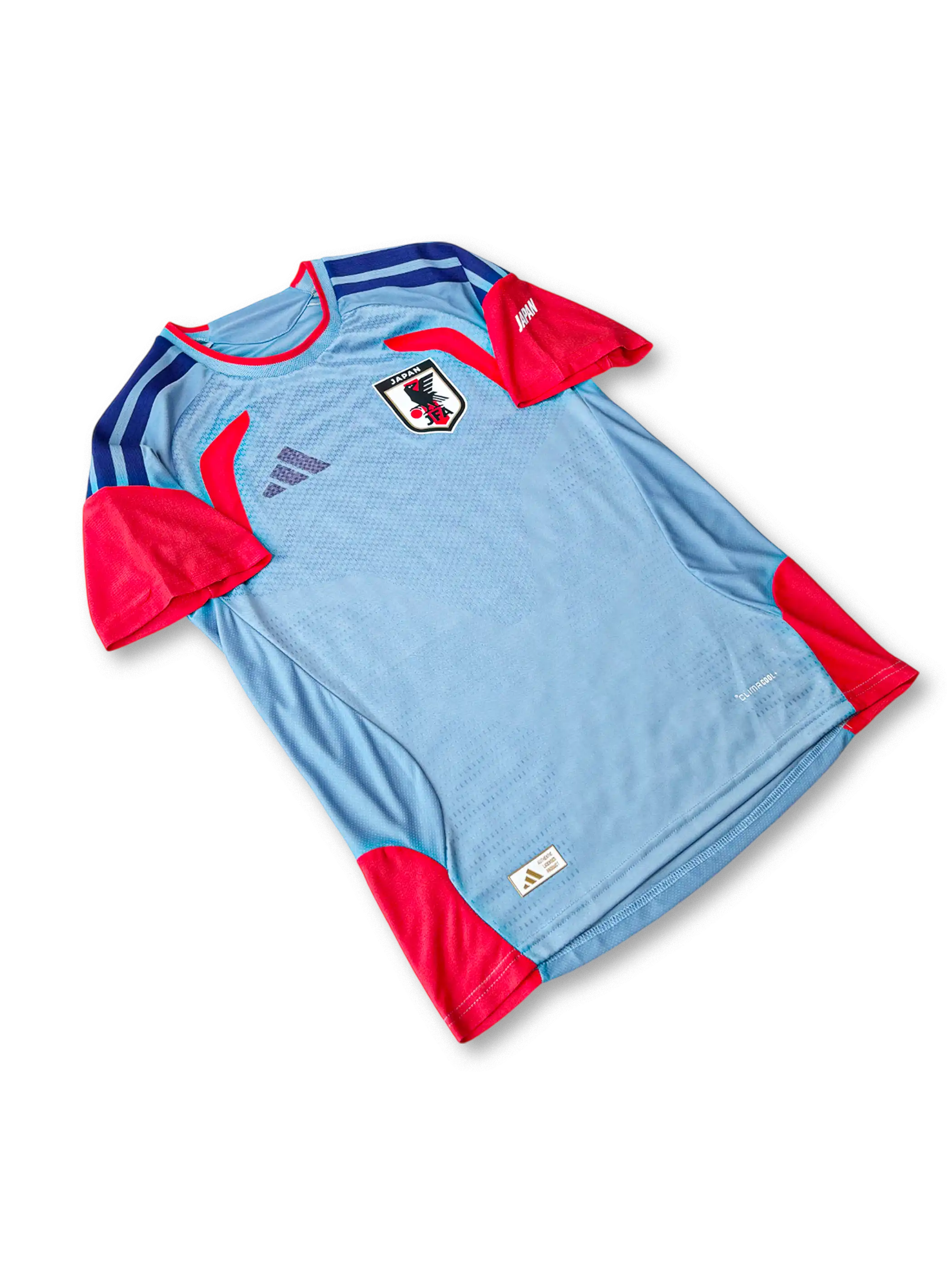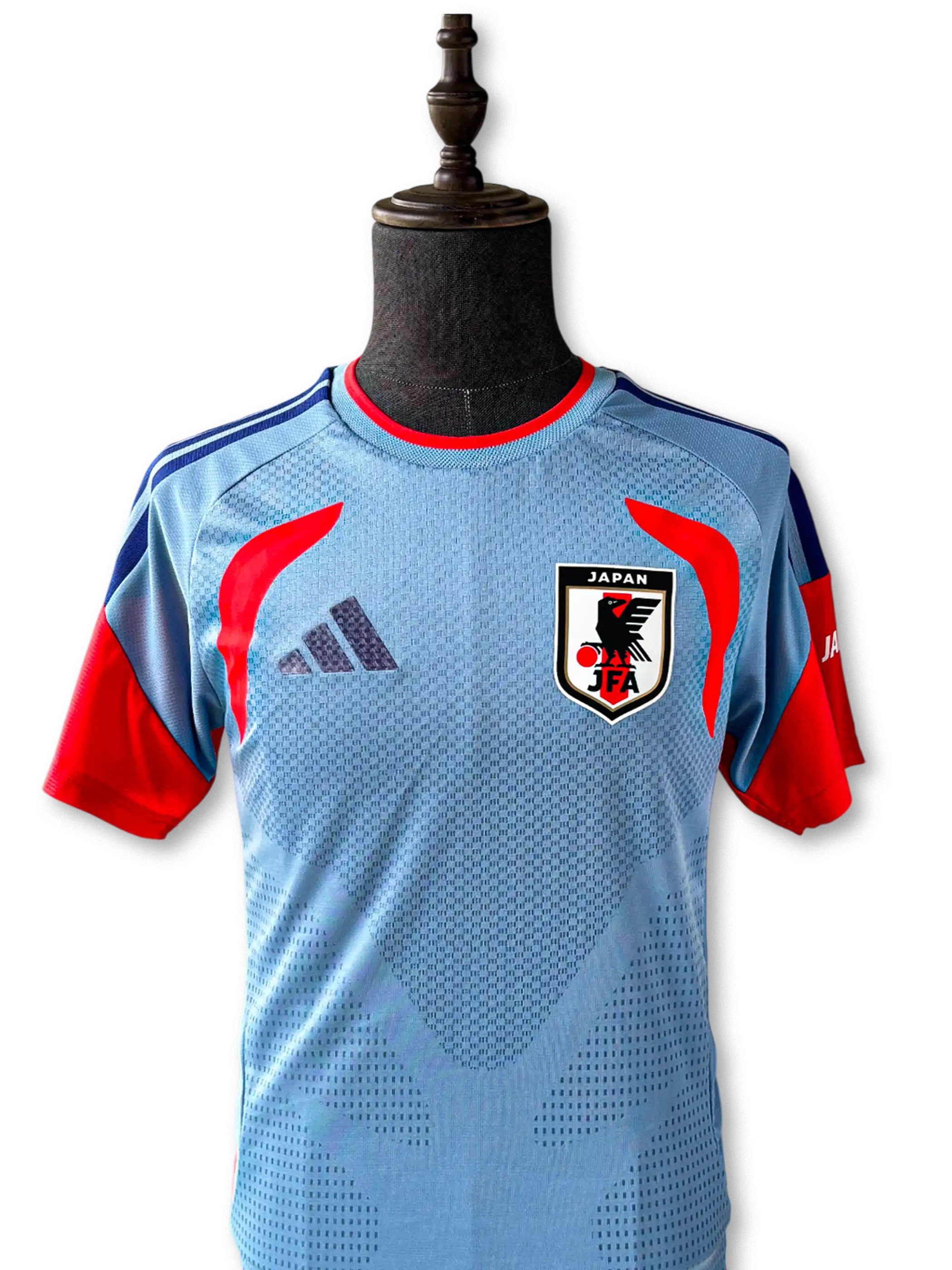 淡いスカイブルーを基調に、袖とサイドにビビッドなレッドオレンジを配した新世代デザイン。肩には3本線のディープブルーを配置し、軽量で通気性の高いAEROREADY素材を採用。胸部のJFAエンブレムが象徴的で、トレーニング用ながらスタジアムでも映える完成度を誇る。