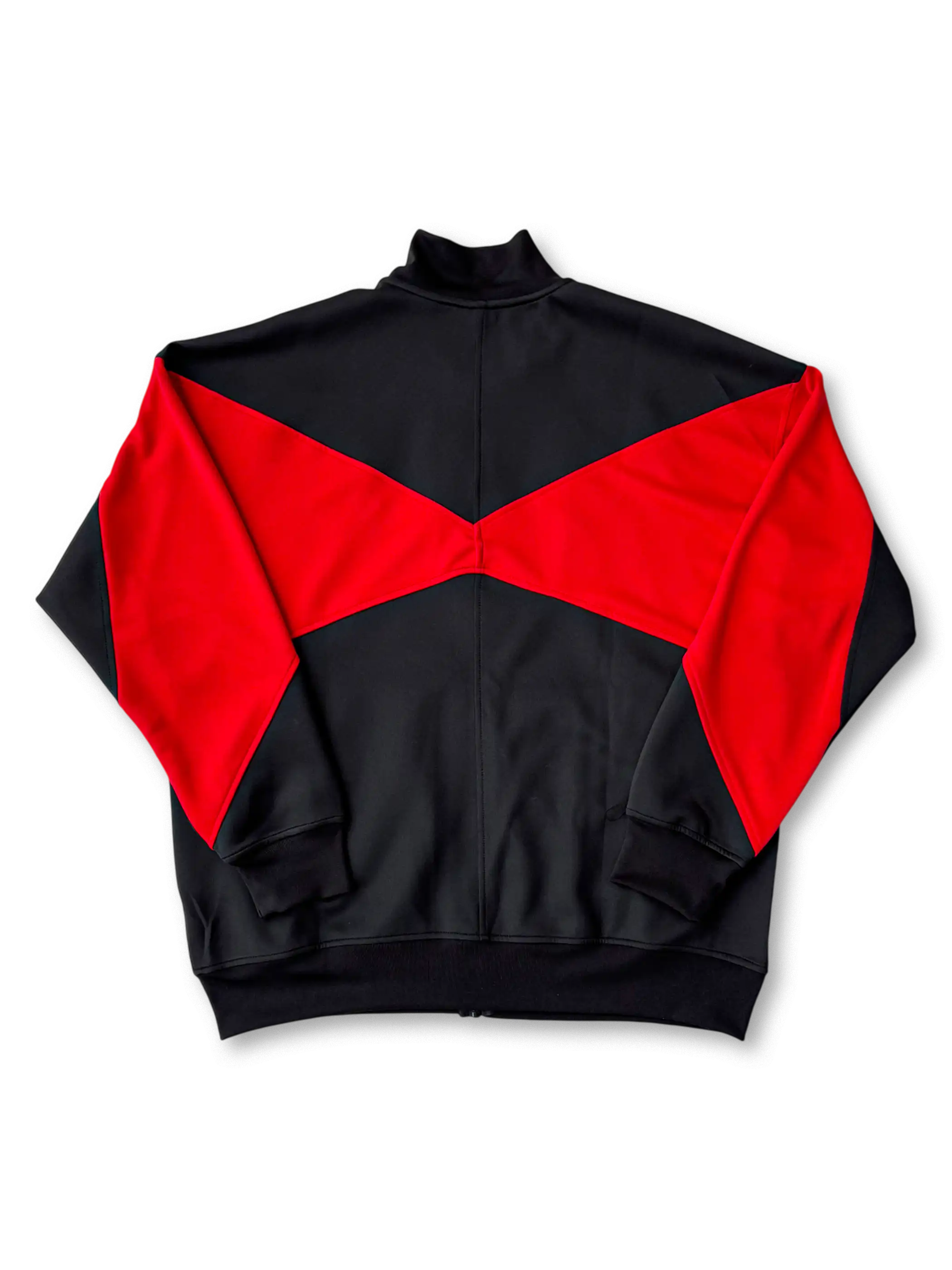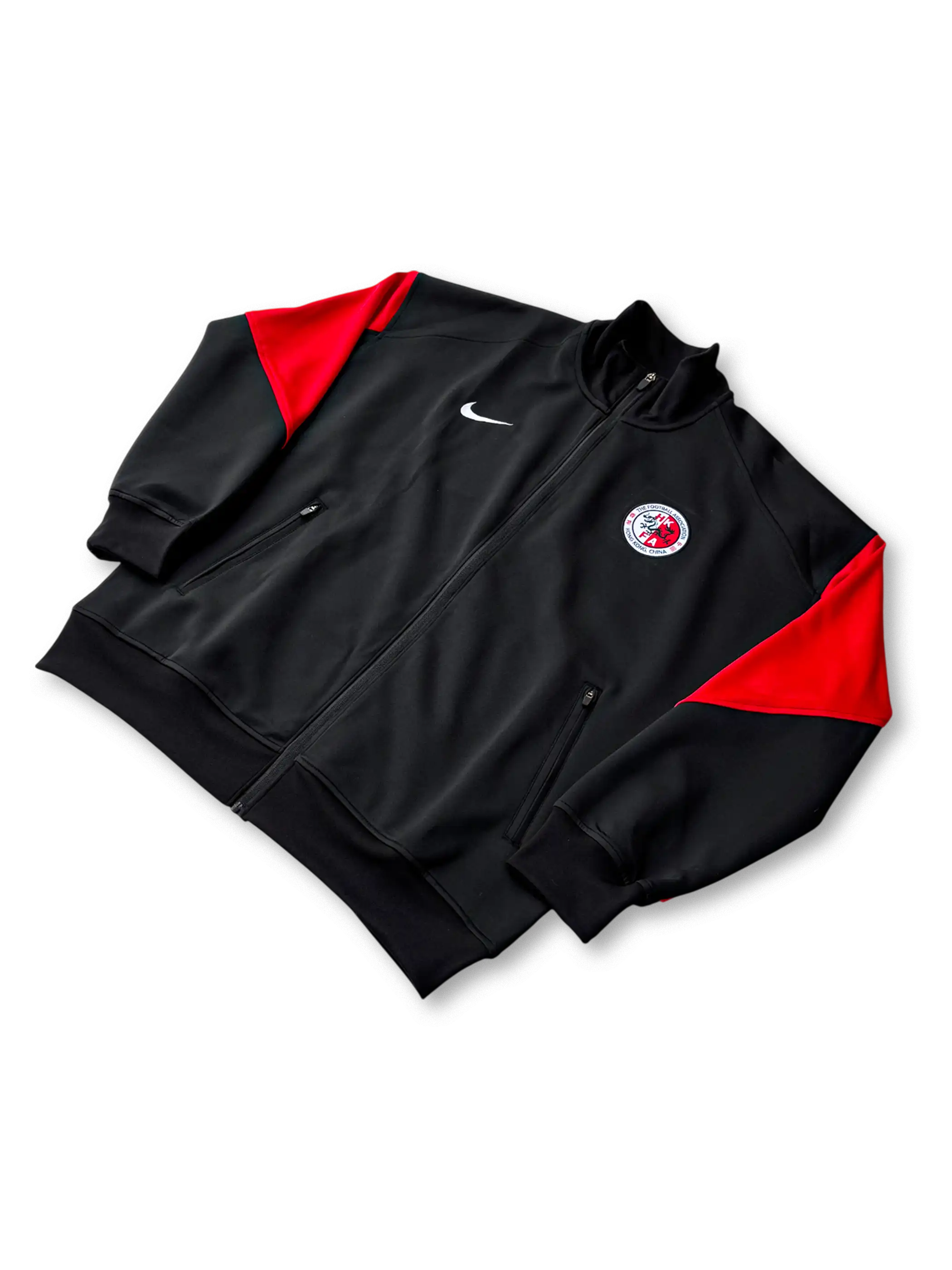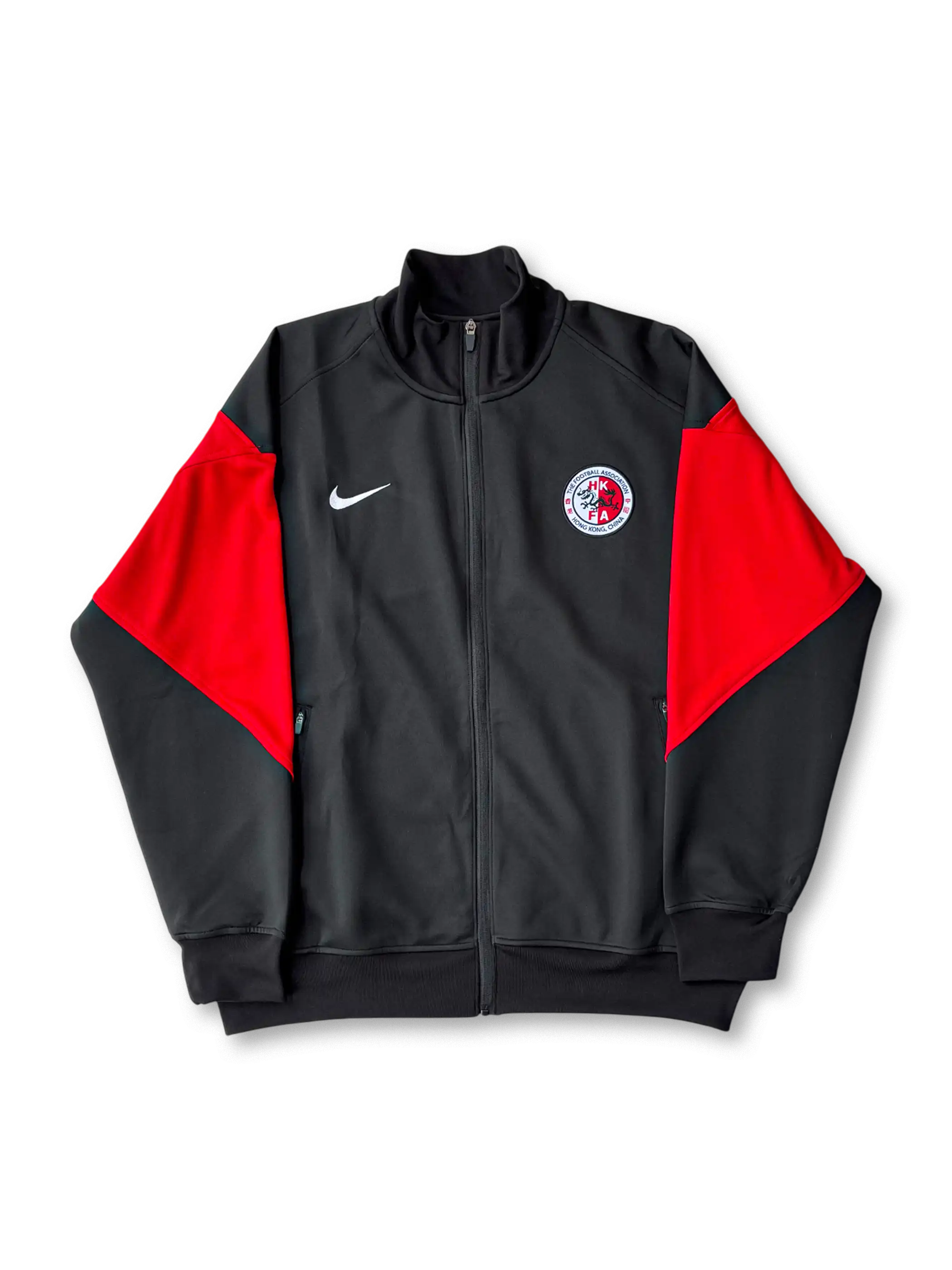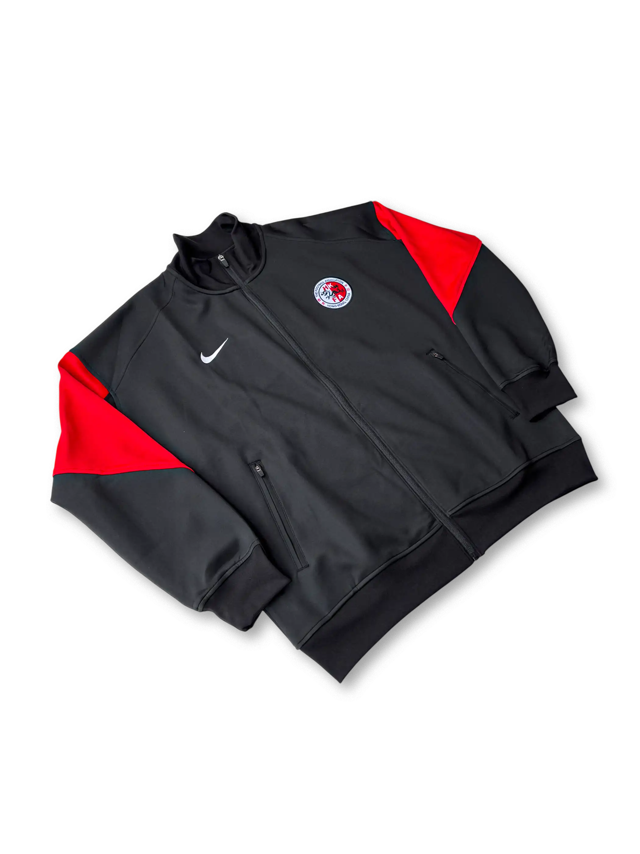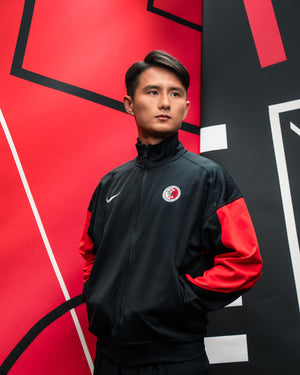 ブラックを基調に袖から背面にかけてレッドを大胆に切り替えたアクティブデザイン。胸部には香港サッカー協会(HKFA)のエンブレムとNIKEスウッシュを配置。立ち襟仕様とリブ構造により防風性を高め、練習から移動時まで幅広く着用できる一着。伸縮性と通気性を両立するトリコット素材で仕立てられた高品質モデル。