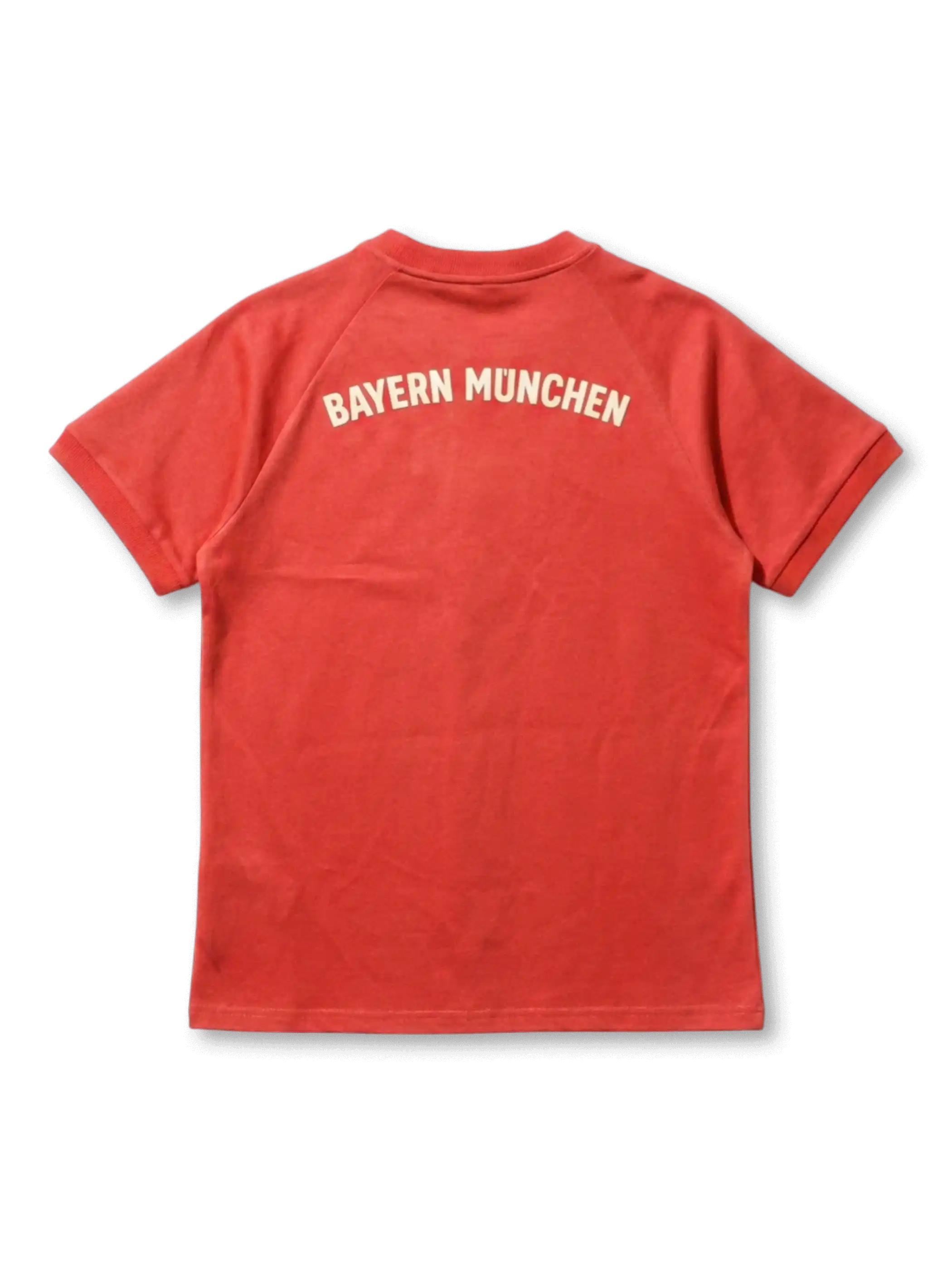 フロント左胸にadidasトレフォイルロゴ(クリームホワイト)、右胸にFCバイエルン・ミュンヘンのヴィンテージ丸型エンブレム(FCB菱形紋章入りサークルデザイン)をクリームホワイトで配置。カラー内側にadidasトレフォイルタグを装着。身頃はレッド単色無地で統一されている。