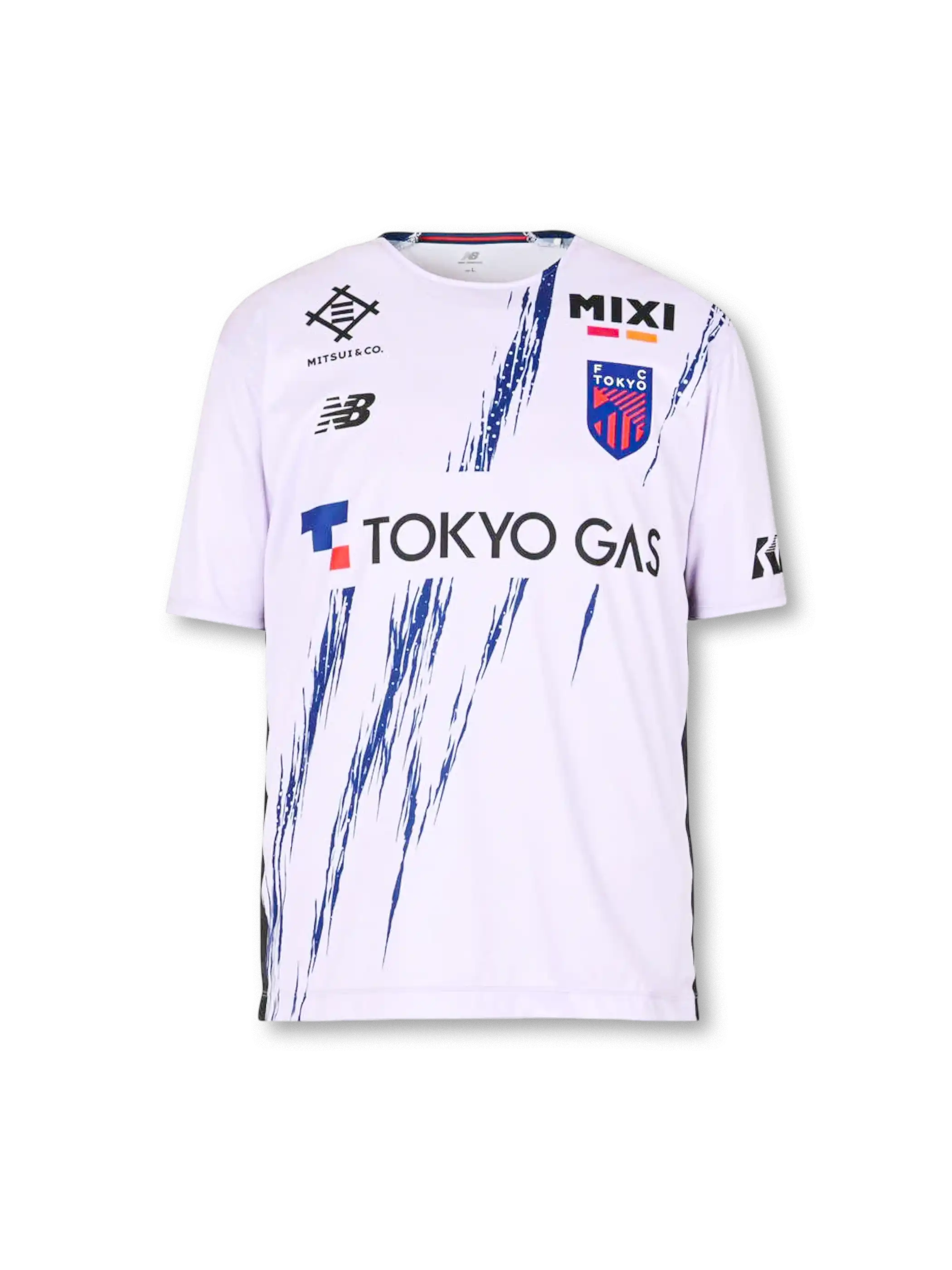 ホワイトベースにネイビーのブラッシュ(筆致)グラフィックを散らし、右胸にFC東京エンブレム、胸中央に「TOKYO GAS」スポンサー、左胸側にMIXI/MITSUI & CO./New Balanceロゴを配置した2ndデザイン。半袖のレプリカ仕様で、Vネック形状に近い浅めの襟元と、サイドの濃色パネルがシルエットを引き締めます。裾付近に「NB DRY」表記が確認でき、ポリエステル系の機能素材として通気性・速乾性を意識した構成です。左袖には「百年構想リーグ」パッチが付属します。