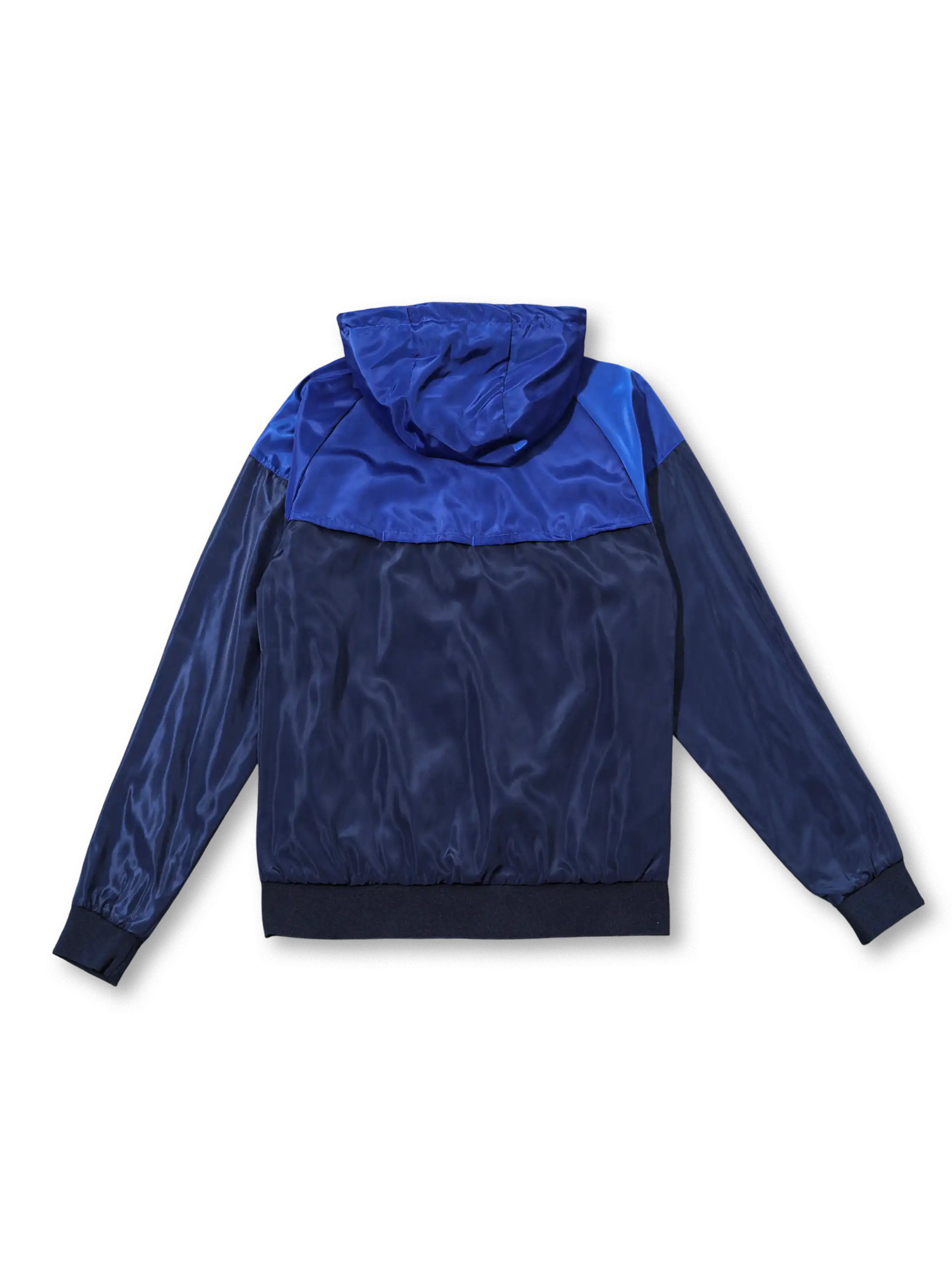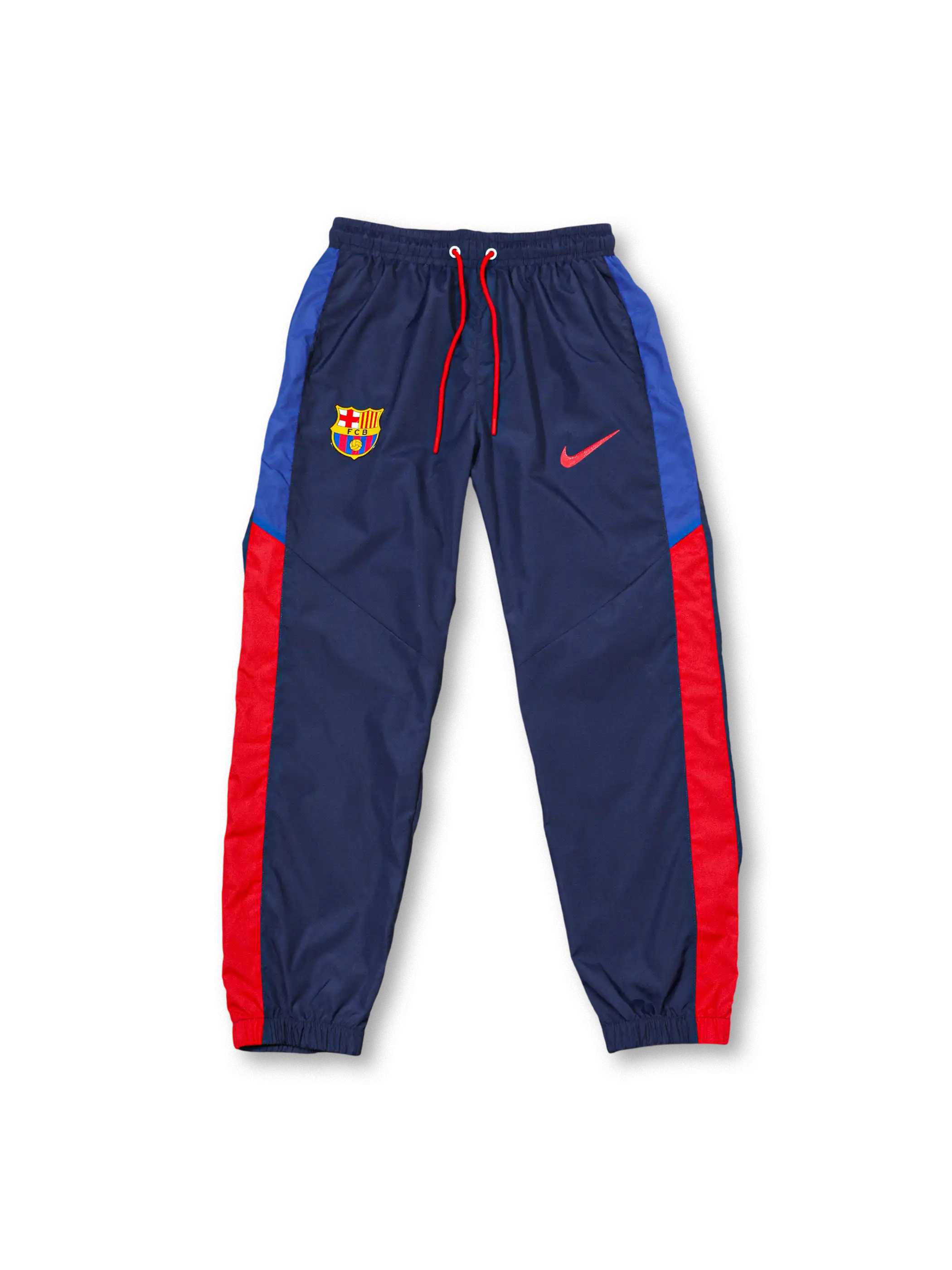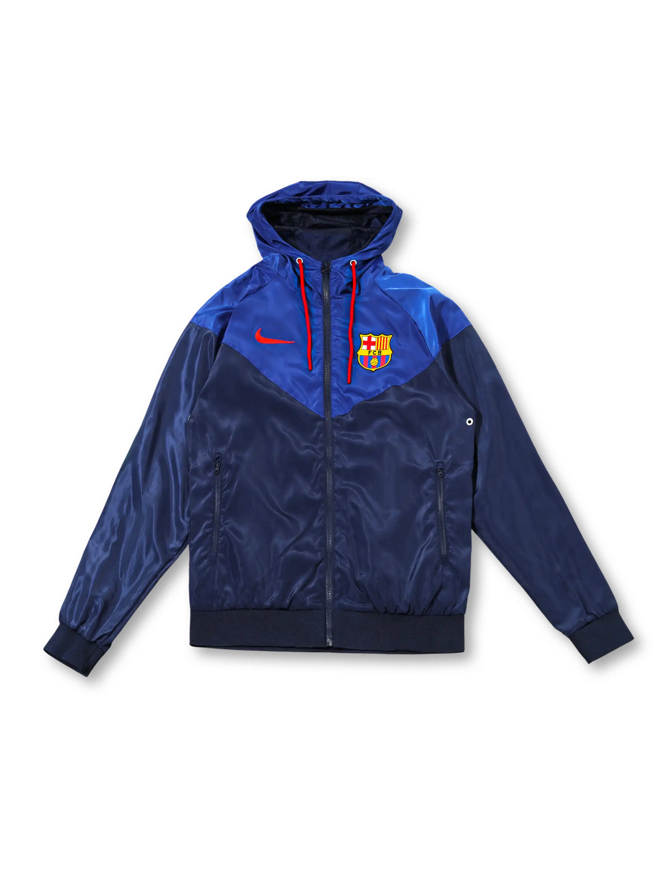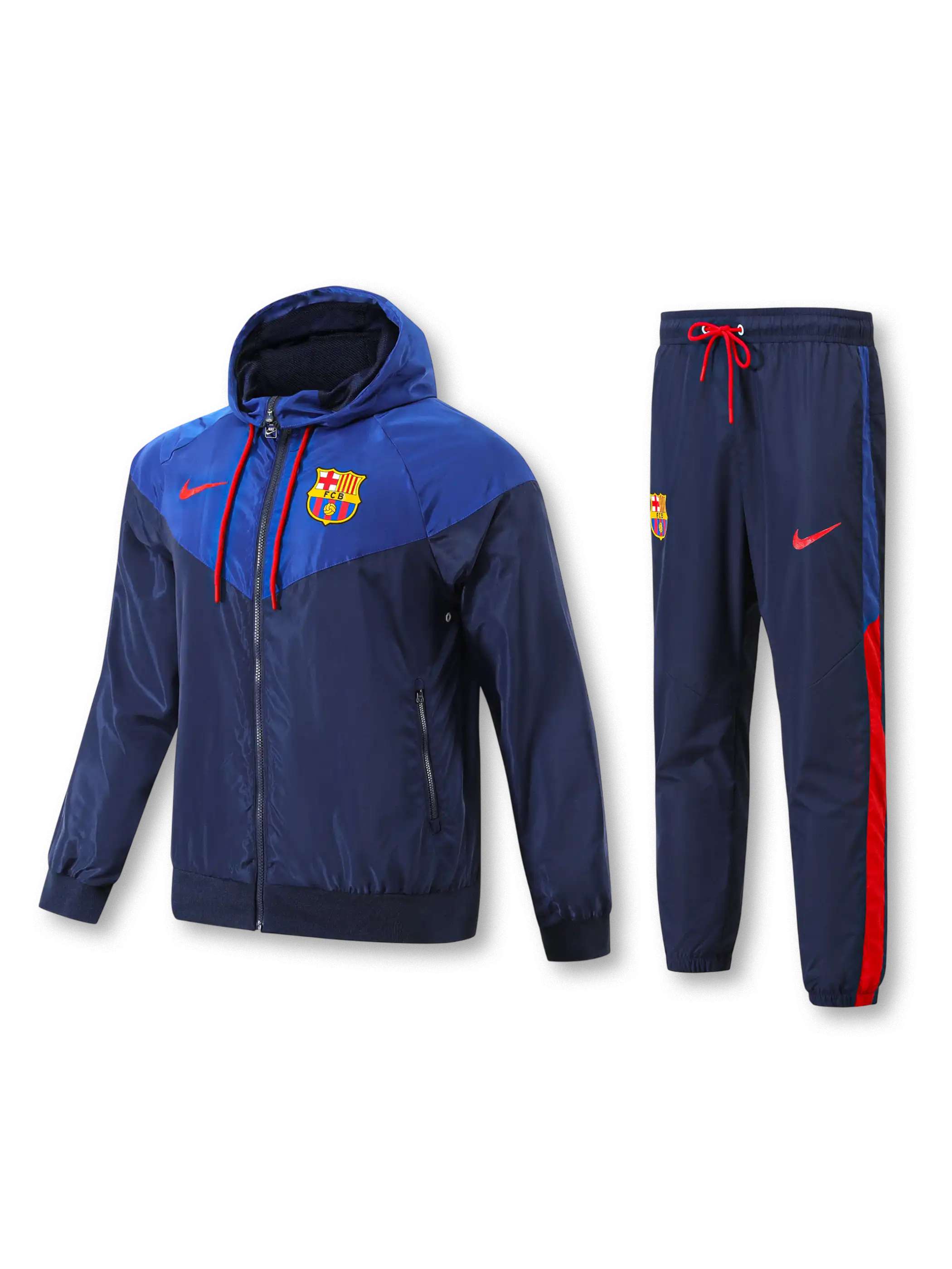 濃淡の異なるネイビー切替構成にレッドの差し色を配し、フード付きウィンドブレーカーとパンツを同系色で統一した設計で、撥水性と軽量性を重視した素材を採用し、胸元のクラブエンブレムとNikeロゴがチームアイデンティティを明確に示す。